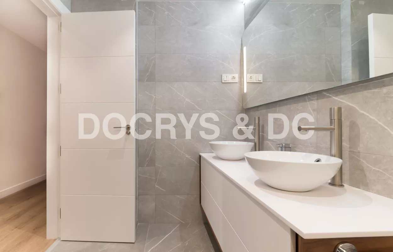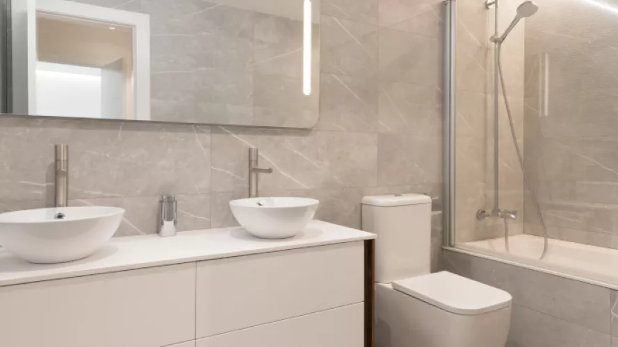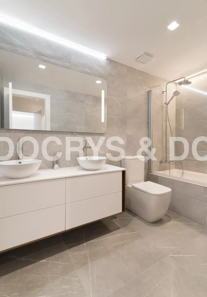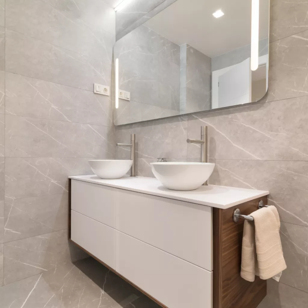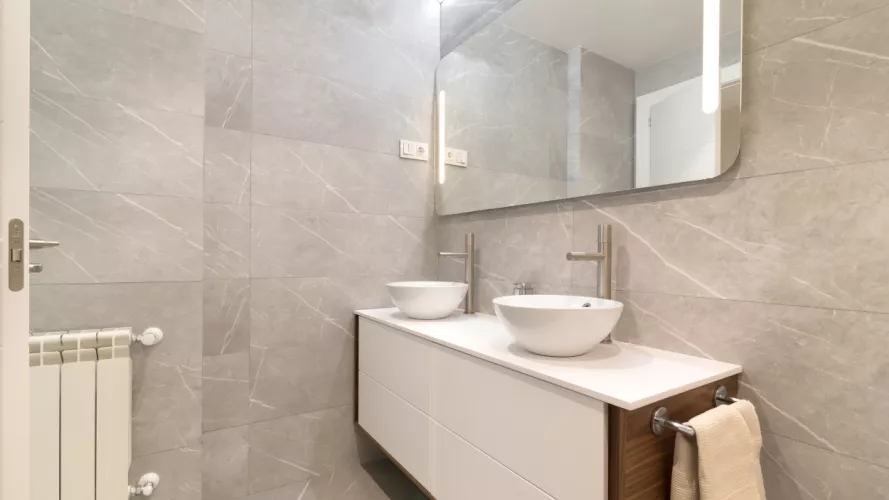 Proyecto de baño para la suite principal, con un diseño muy elegante y moderno. Los tonos grises dan una sensación de sofisticación y el doble lavabo en blanco aporta mucha luminosidad. Encontramos un mueble en madera con cajones, encimera y lavabos en blanco a juego con los tonos claros que contribuyen a dar ese toque pulcro al baño. Los grifos en cromado se mimetizan con la gama cromática de blancos y grises.