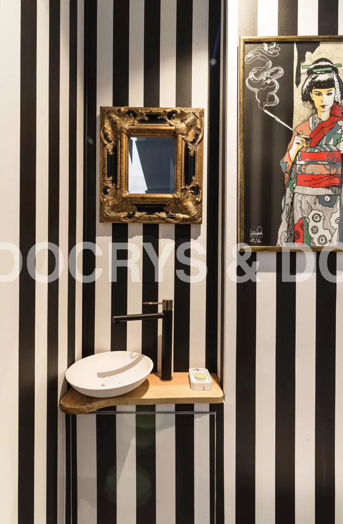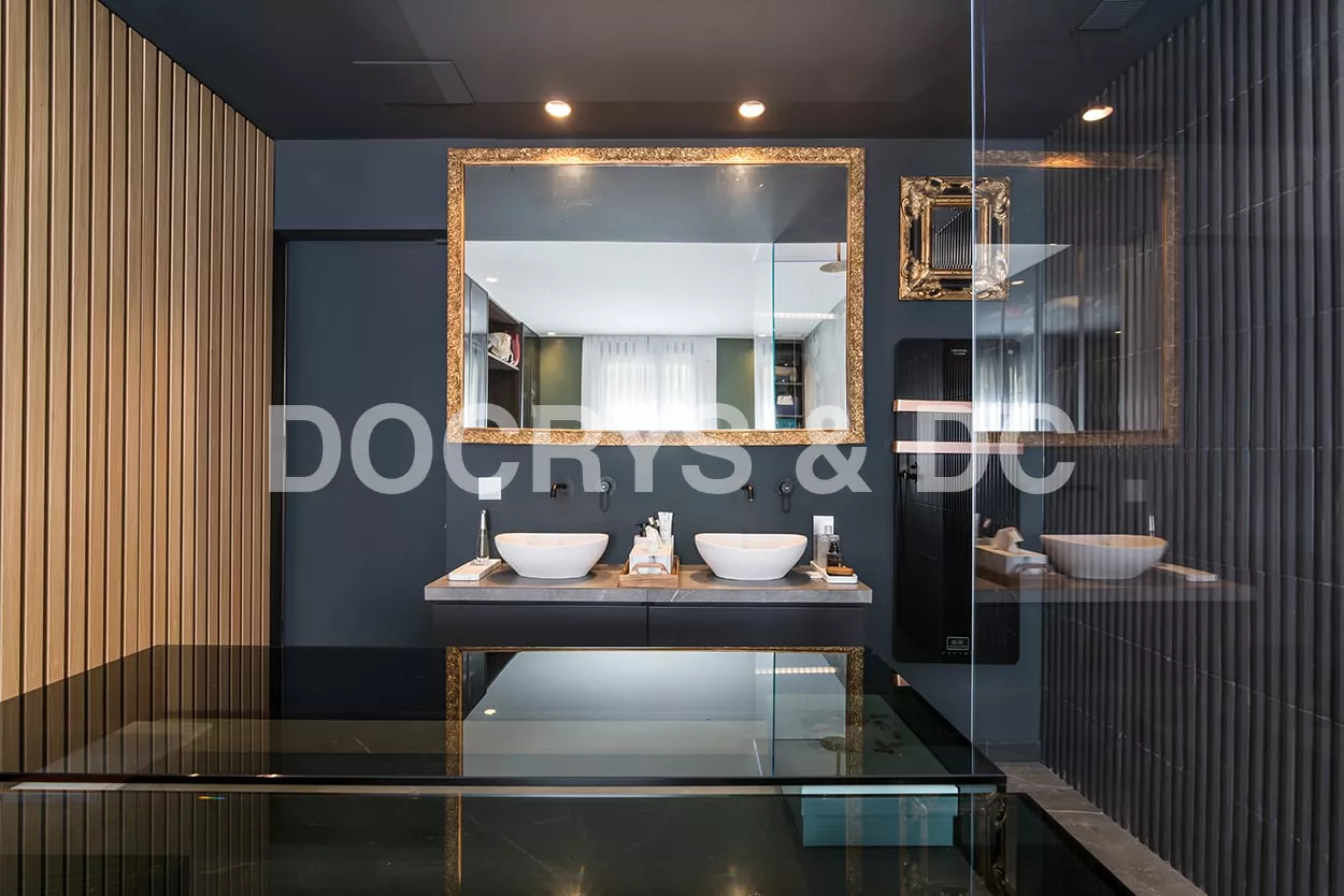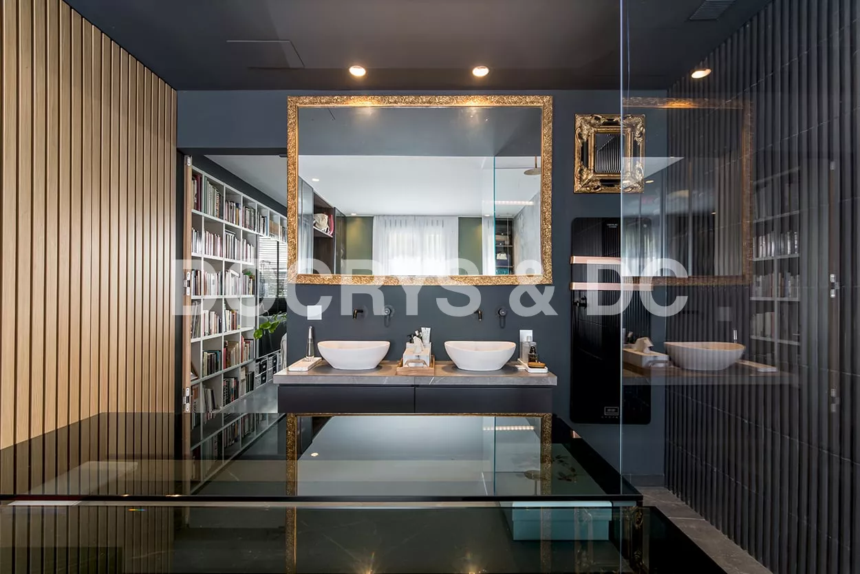 La cama está iluminada por unas lámparas colgantes de Studio Italia en cristal transparente. A modo de isla y como separación entre el baño y el dormitorio, colocamos una cómoda de Emede, el modelo KlAS, en color Carbón, encimera Stone gris y cristal Fumé gris.