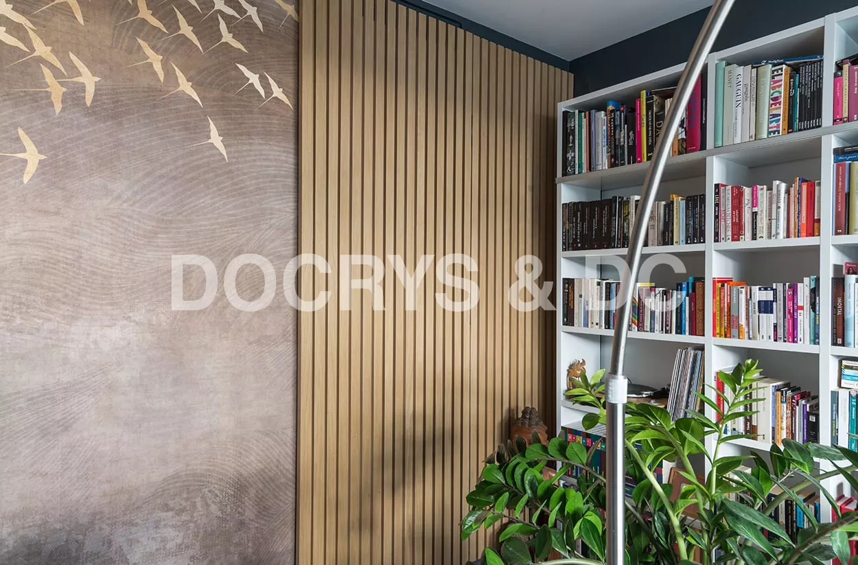 Por un lado, colocamos un vestidor de Emede con el modelo de puerta GRIP, que permite ver el interior del armario, compuesta con una perfilería de aluminio y cristales translúcidos. El interior, en color Tobacco. A modo de cabecero, colocamos un papel pintado de Glamora que imita las ramas y hojas de un árbol, creando un espacio visual muy impactante.