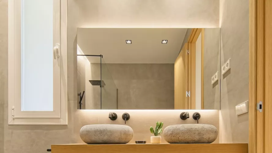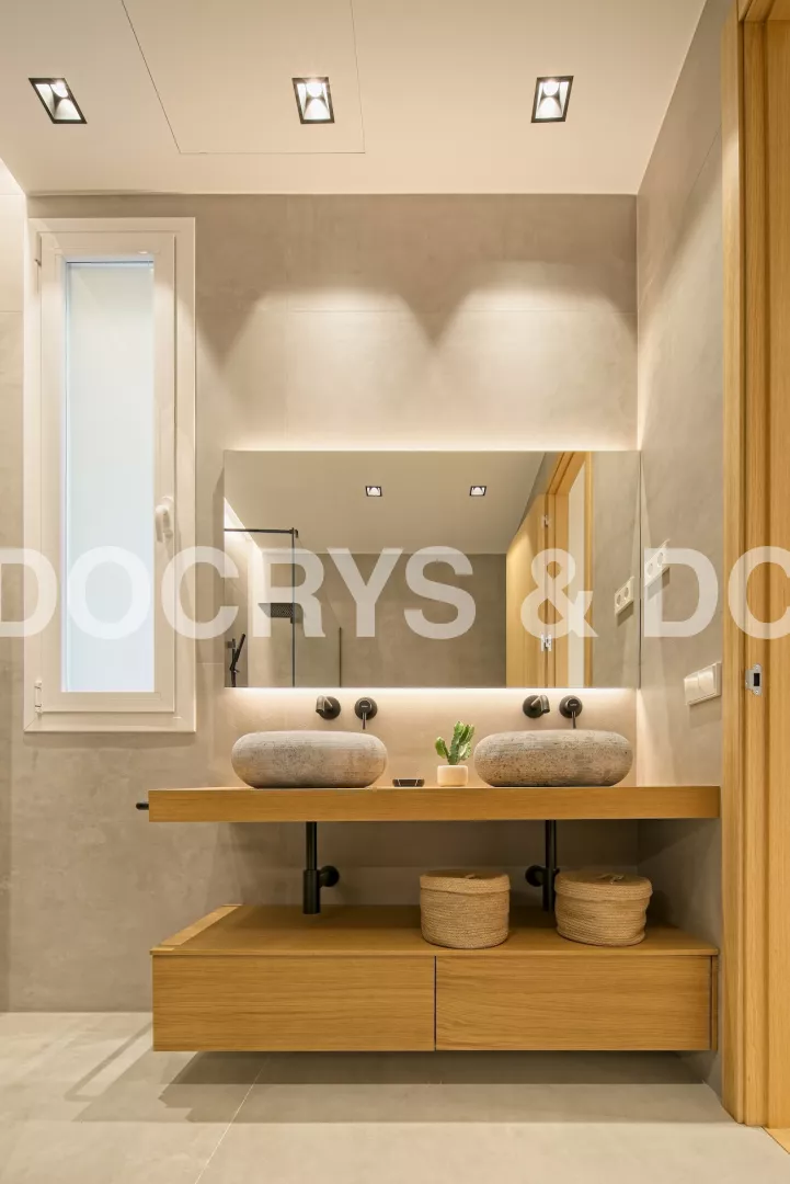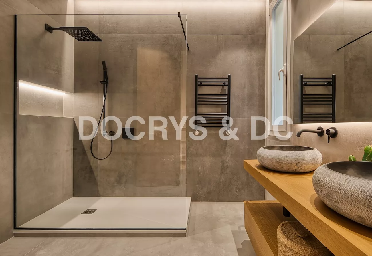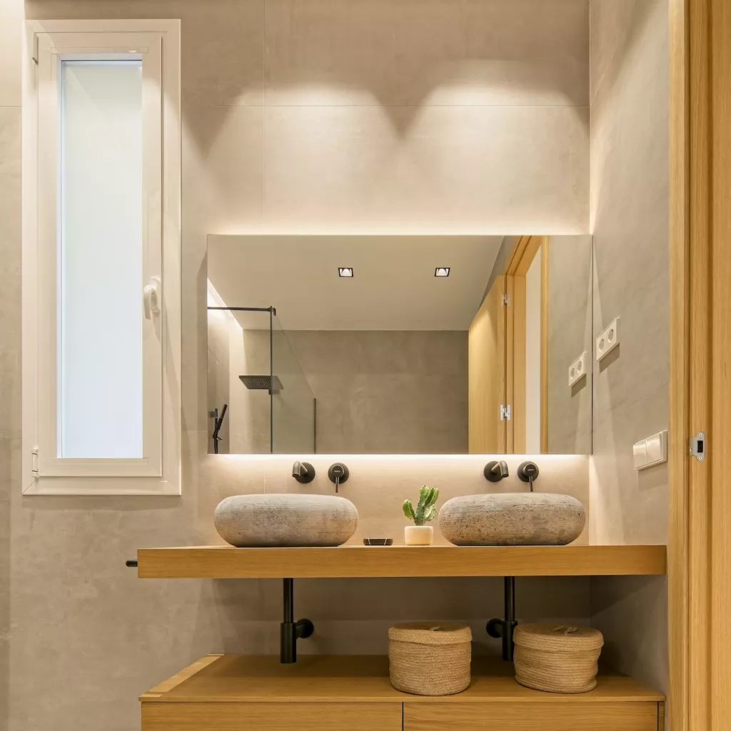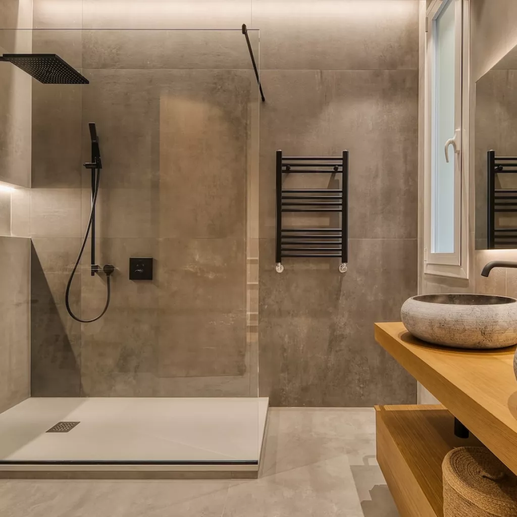 El revestimiento en gris cemento que se funde con el suelo crea una sensación de continuidad y elegancia en el baño. Esta elección de diseño ayuda a ampliar visualmente el espacio y aporta una sensación de armonía. Además, el tono gris cemento es versátil y atemporal, lo que garantiza que el baño se mantenga moderno y sofisticado durante mucho tiempo.