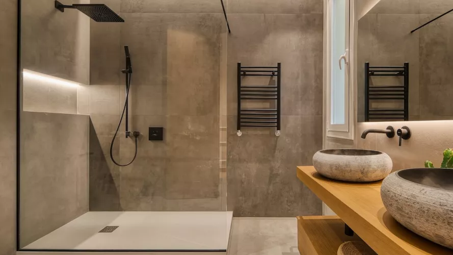 Proyecto integral donde tenemos este baño como suite principal, tiene un diseño muy elegante y moderno. Los tonos grises dan una sensación de sofisticación y el doble lavabo en gris cemento modelo Fiji acabado negro, sobre encimera de diámetro 45x15 complementa perfectamente el estilo. El toque de los grifos en negro mate agrega un contraste interesante.