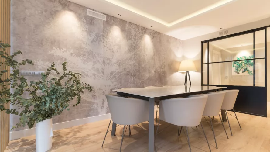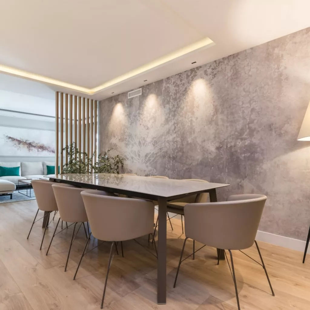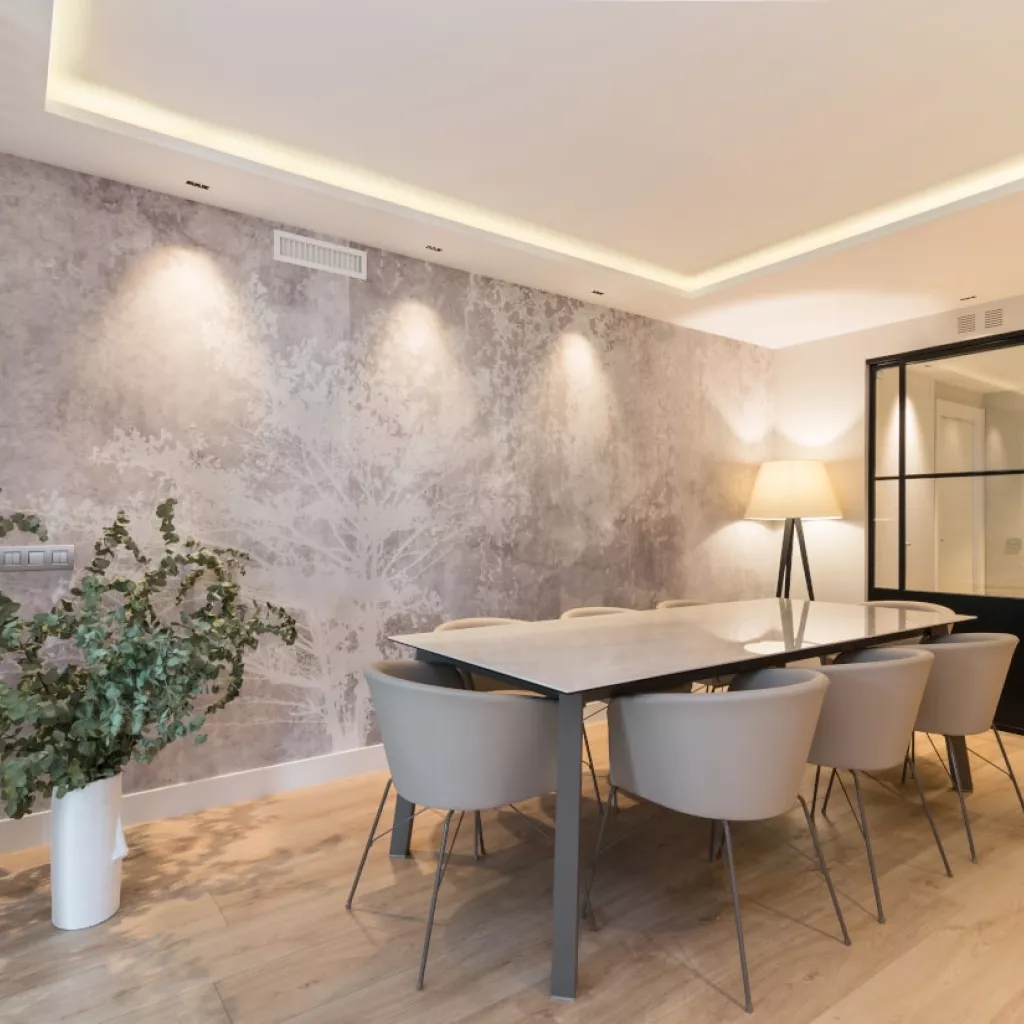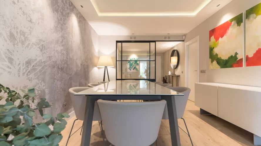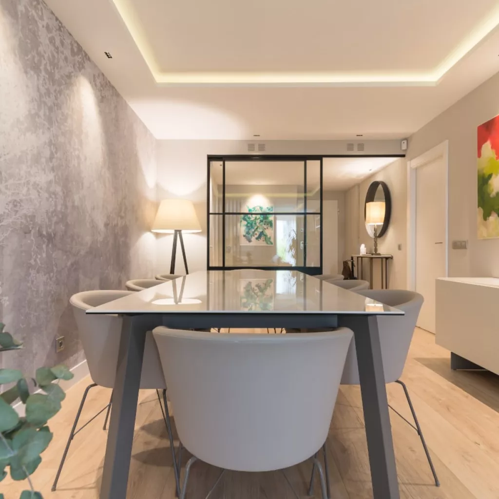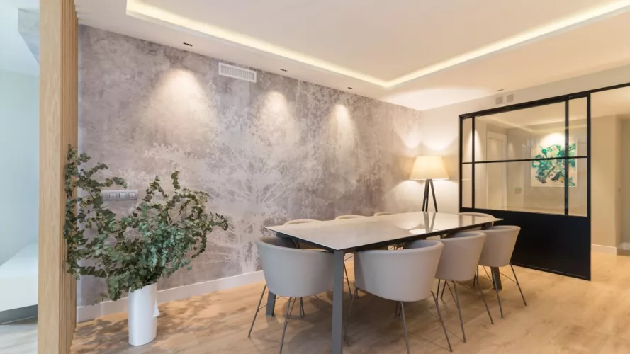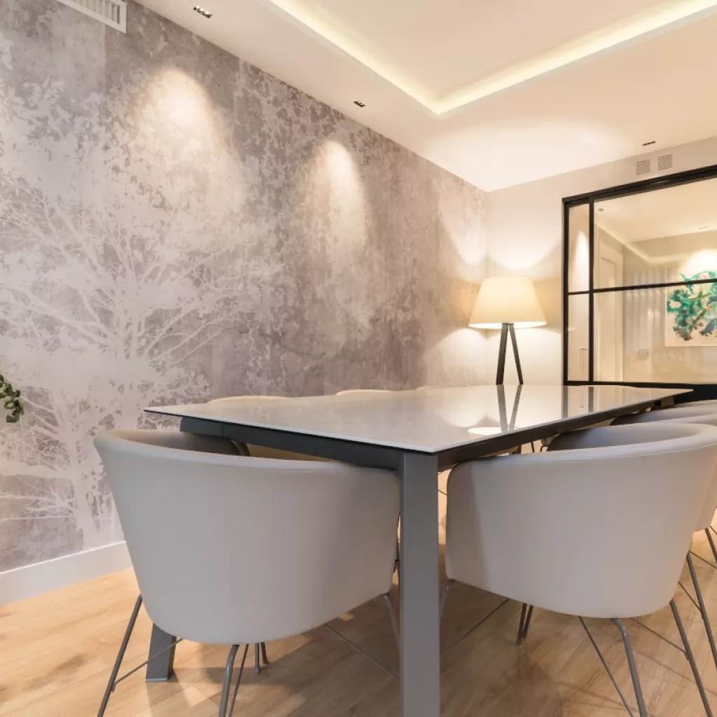 En el comedor, una imponente mesa de Cattelan con sillas de Capdell, papel pintado de Glamora y una iluminación arquitectónica con un diseño perfectamente estudiado, que aporta un toque muy especial en el ambiente.