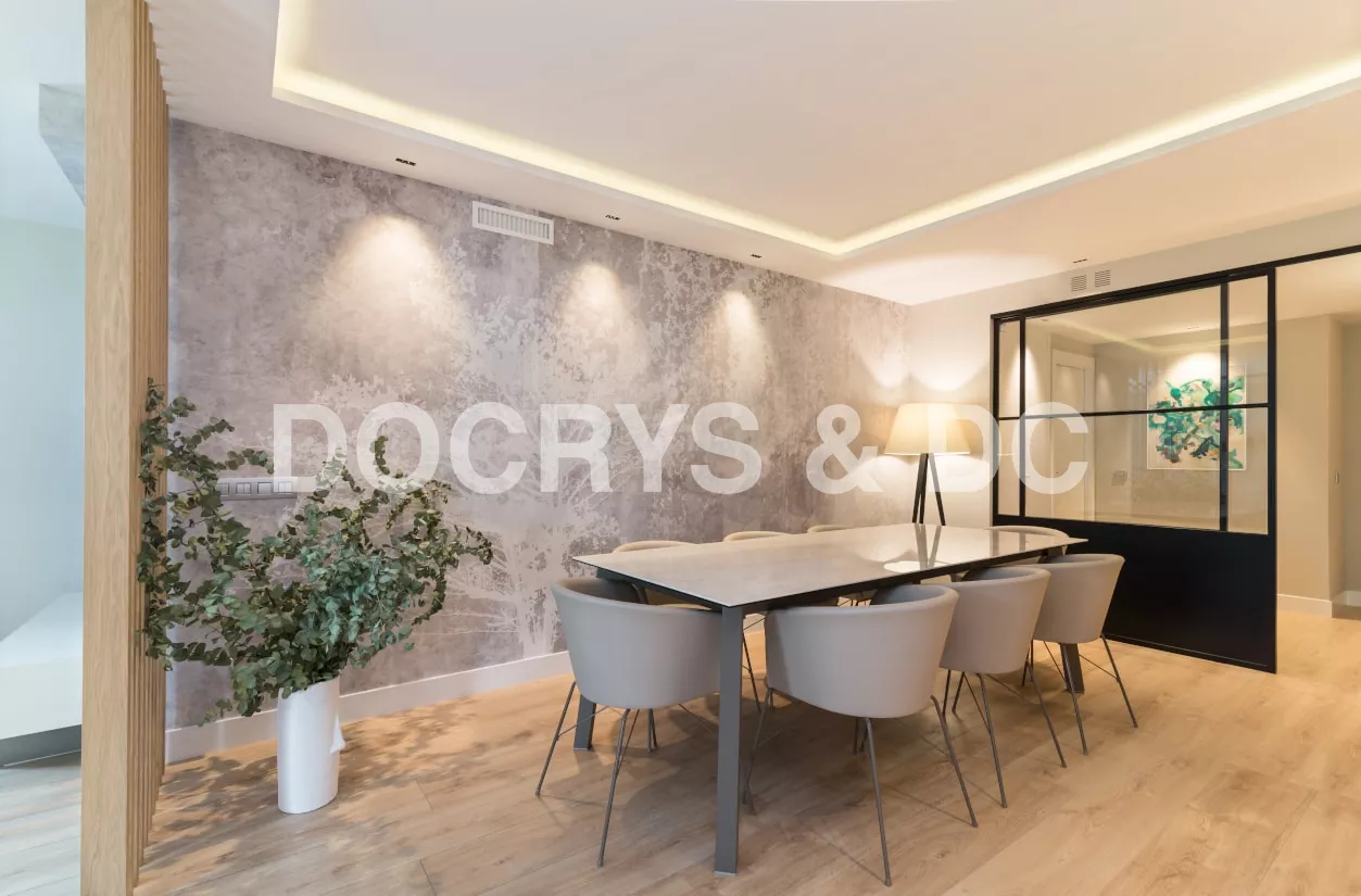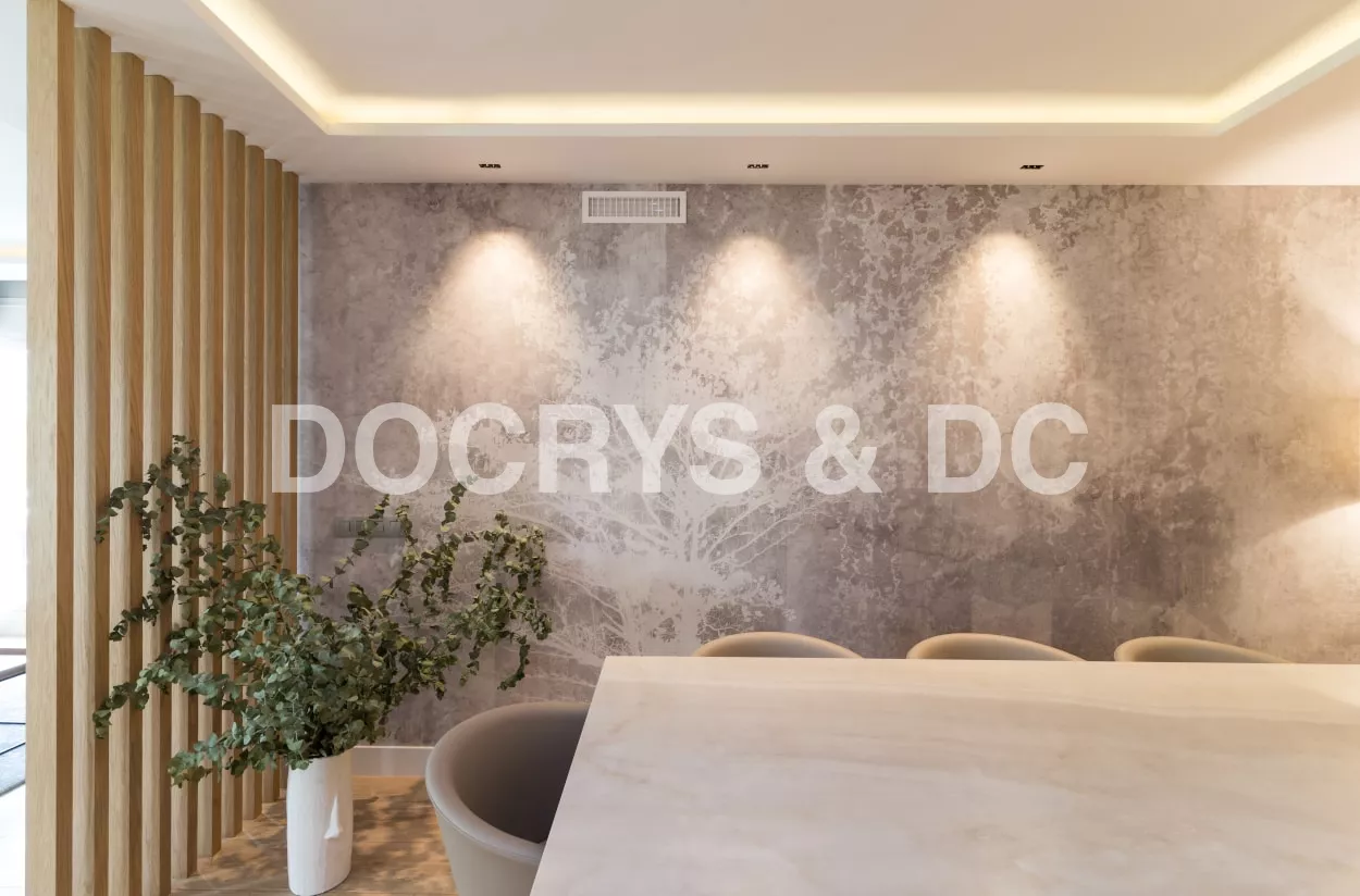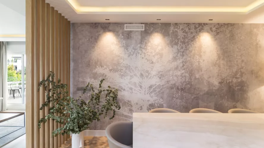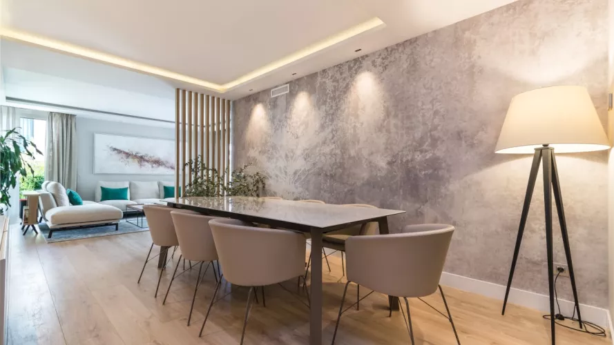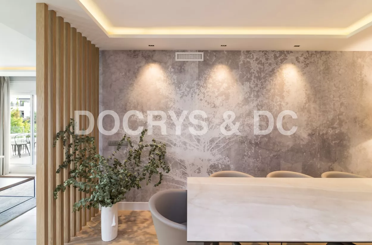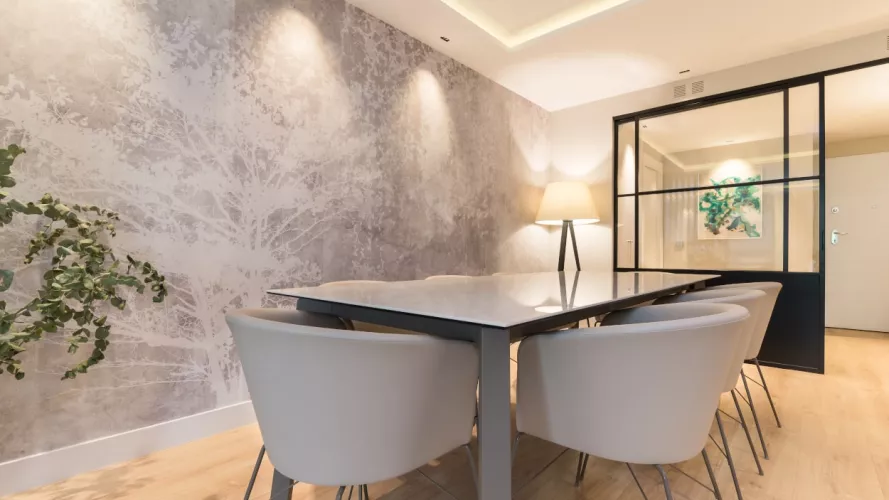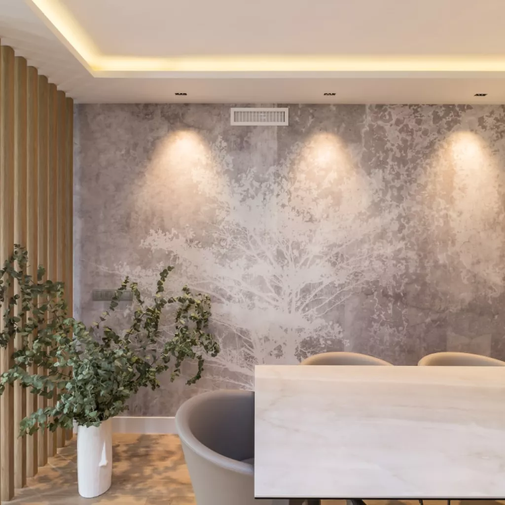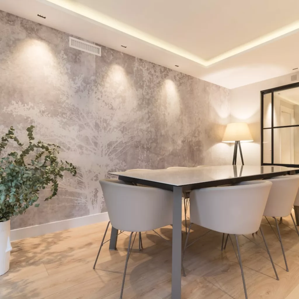 En el comedor, una imponente mesa de Cattelan con sillas de Capdell, papel pintado de Glamora y una iluminación arquitectónica con un diseño perfectamente estudiado, que aporta un toque muy especial en el ambiente.