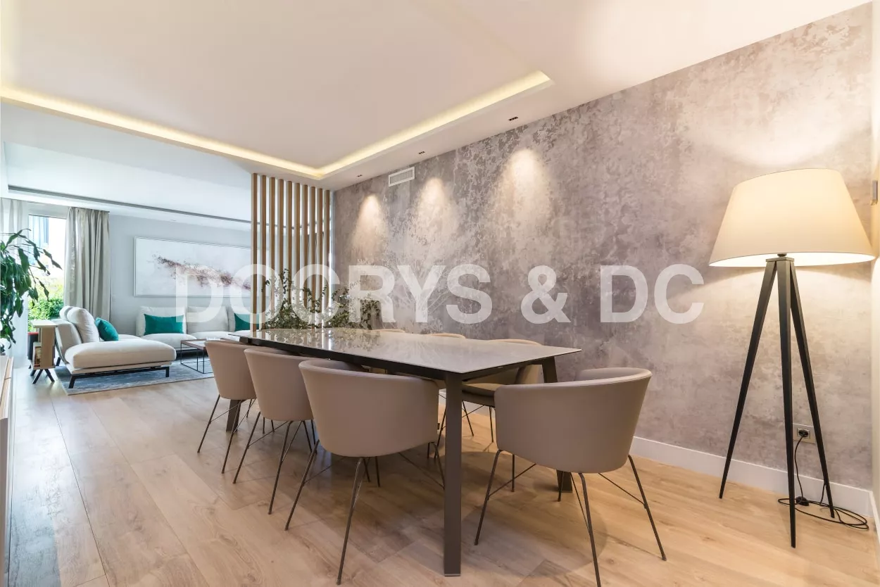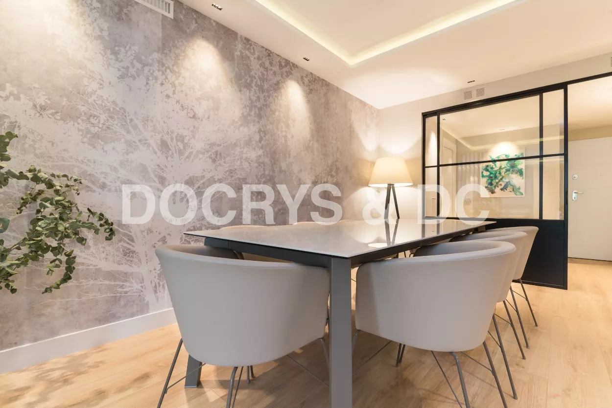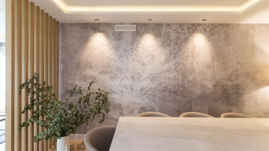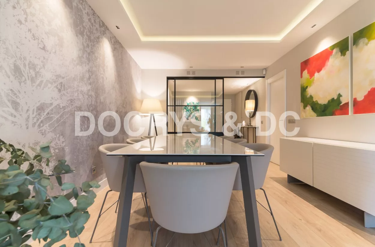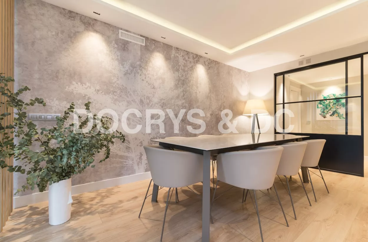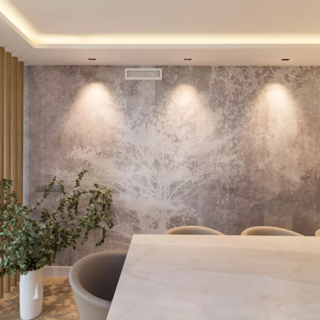 En el comedor, una imponente mesa de Cattelan con sillas de Capdell, papel pintado de Glamora y una iluminación arquitectónica con un diseño perfectamente estudiado, que aporta un toque muy especial en el ambiente.