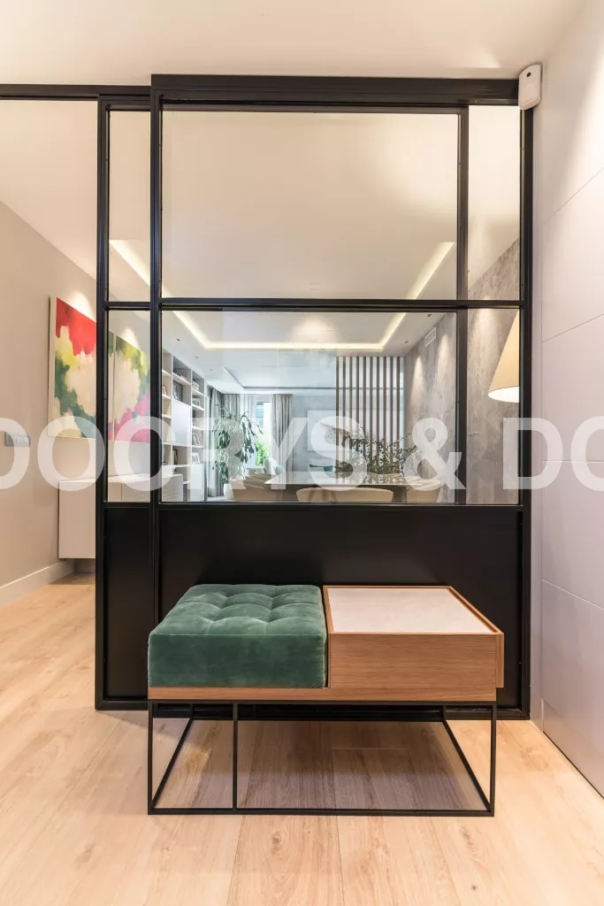 En el recibidor colocamos un descalzador de Emede y una puerta corredera de cristal y aluminio. Menos es más y así conseguimos un espacio amplio, luminoso y sin obstáculos.