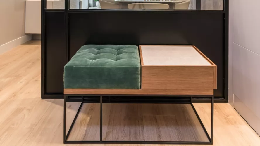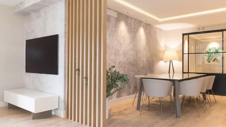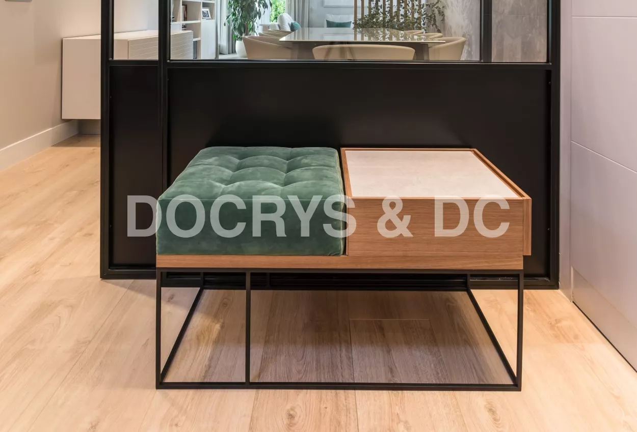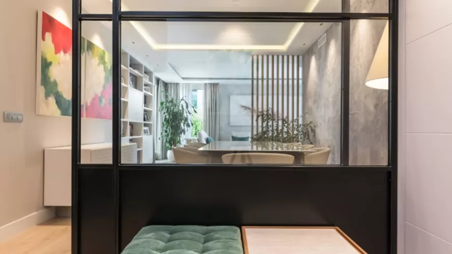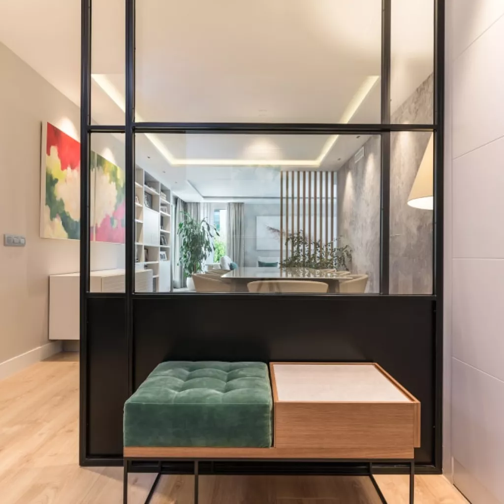 Decidimos hacer un espacio semi-abierto entre el recibidor y el comedor para mantener el contacto visual en las 2 estancias y ganar amplitud y luminosidad.