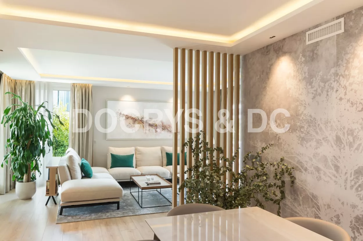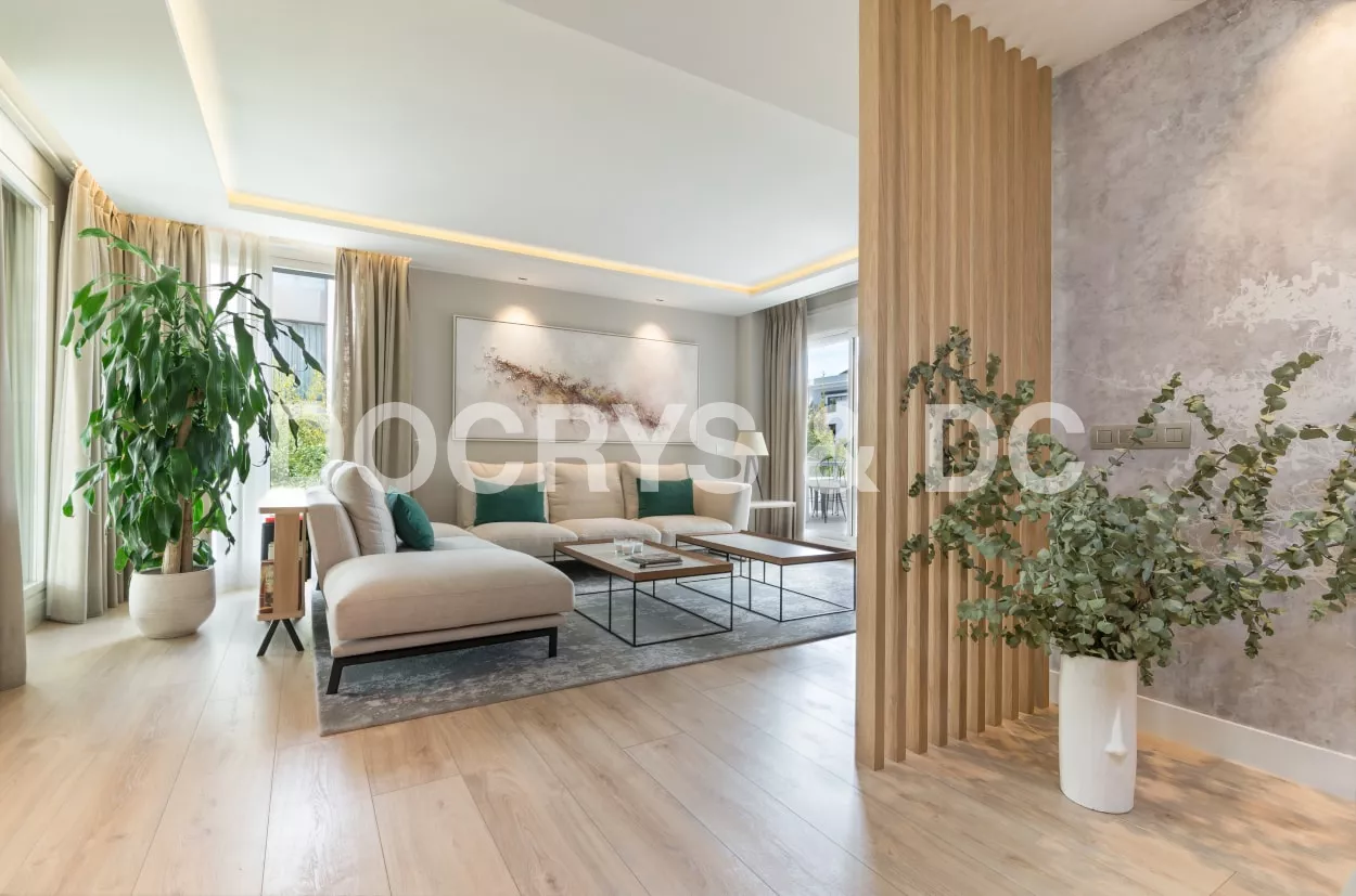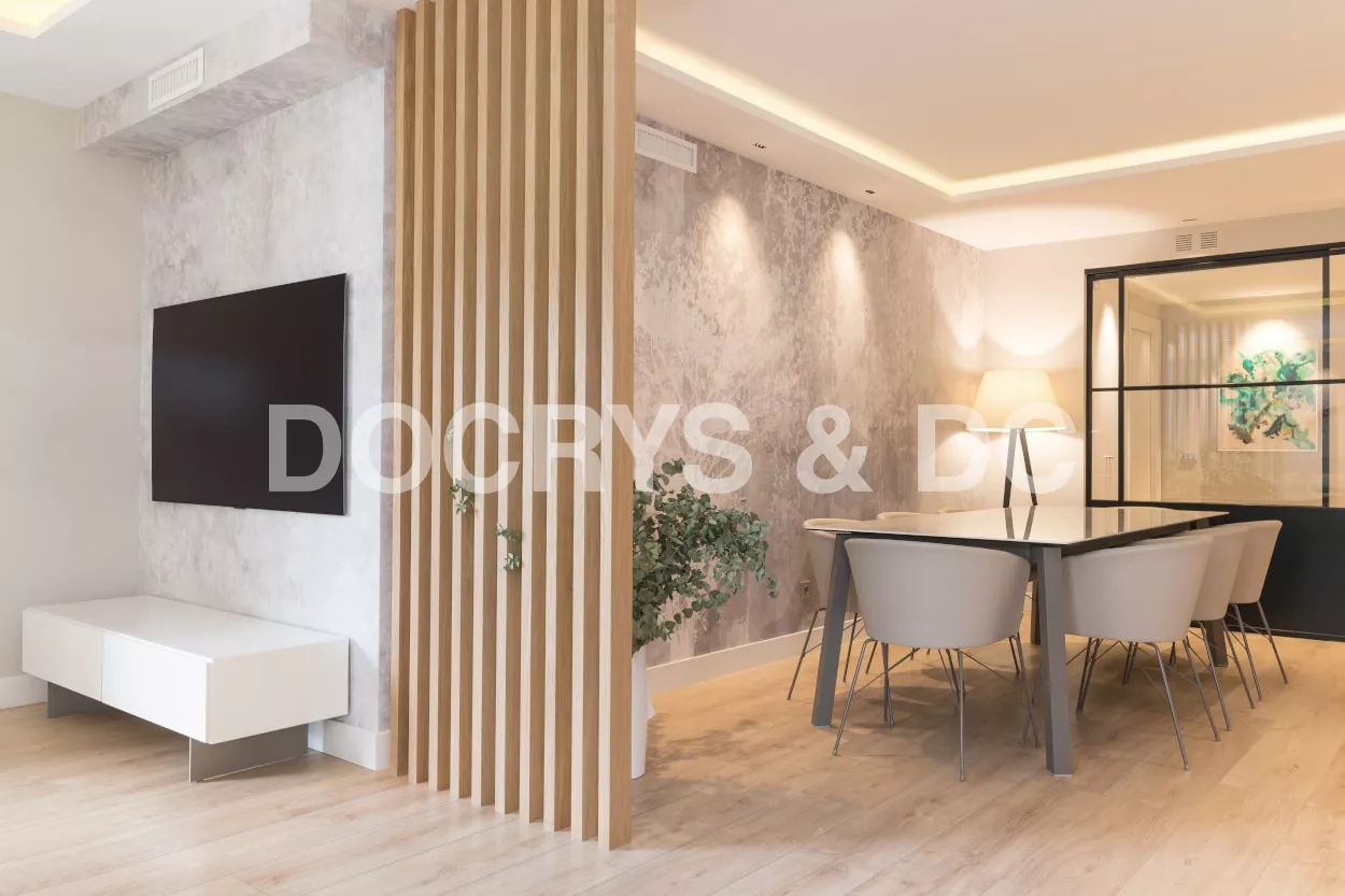 Decidimos hacer un espacio semi-abierto entre el recibidor y el comedor para mantener el contacto visual en las 2 estancias y ganar amplitud y luminosidad.