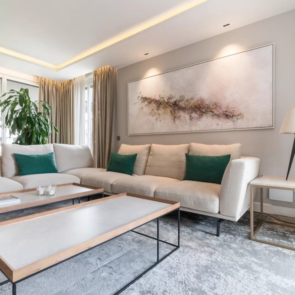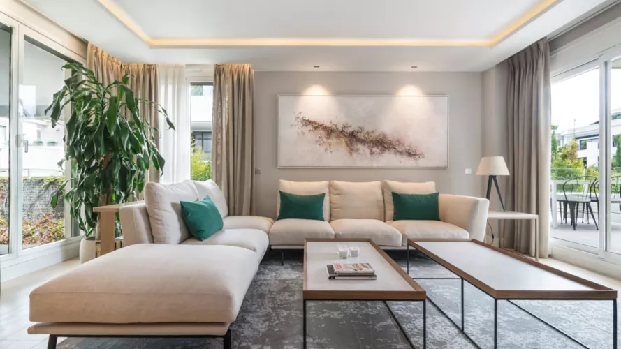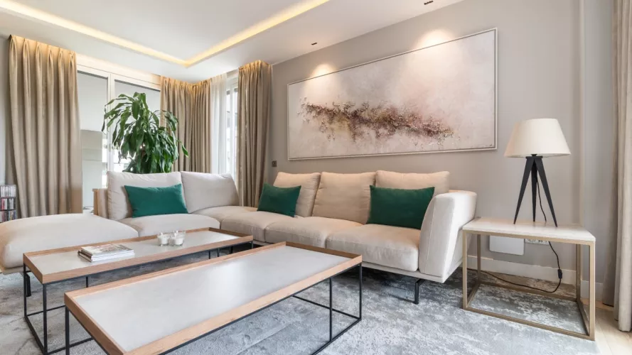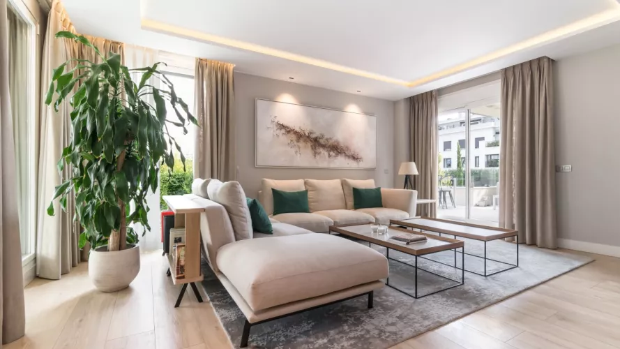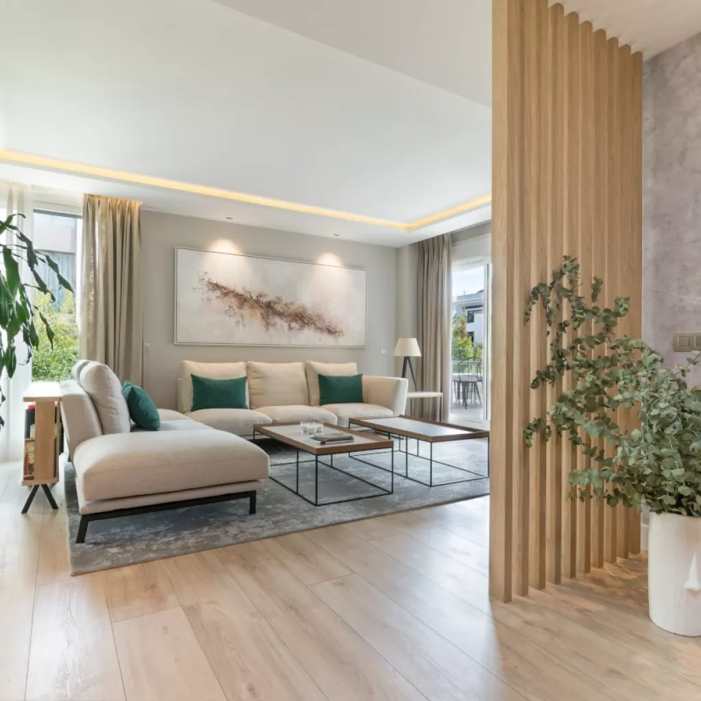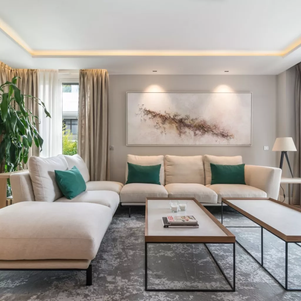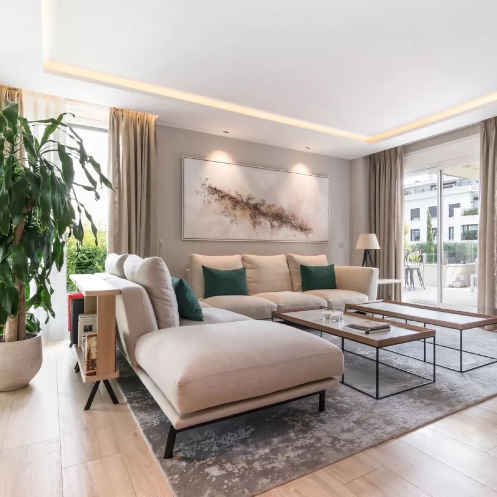 En el salón, un sofá en forma de L de MC, con tapicería en tono beige, alfombra de KP y mesas mesas bajas de Emede.