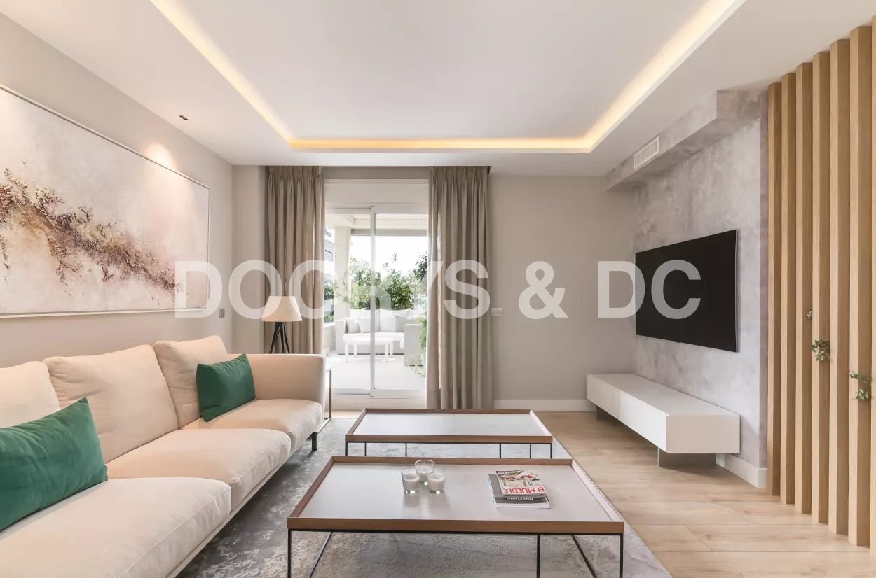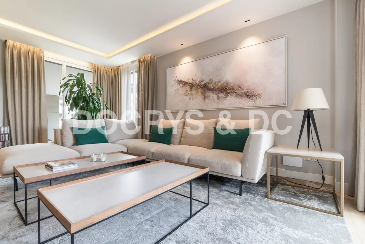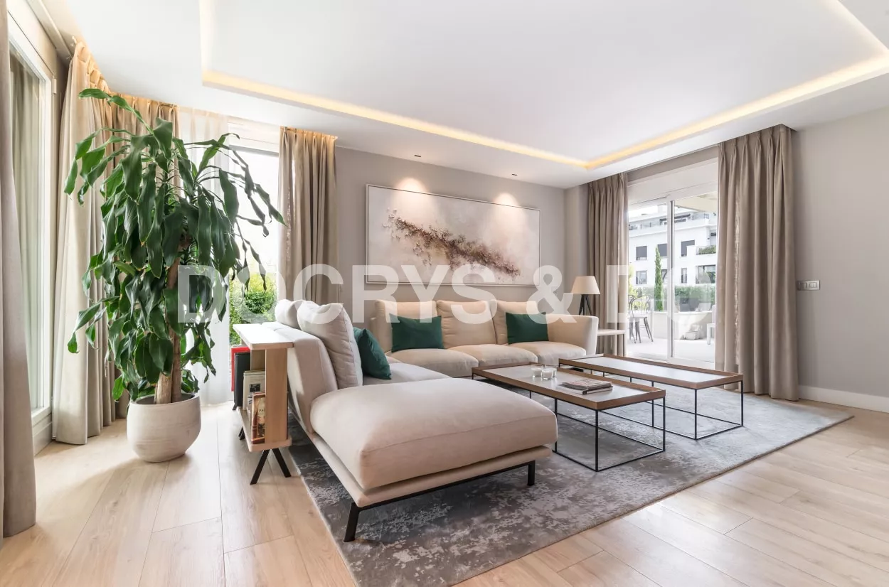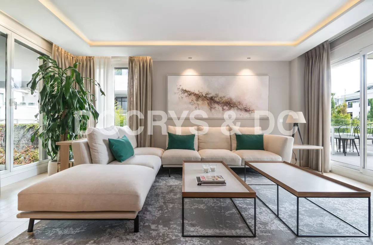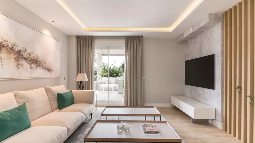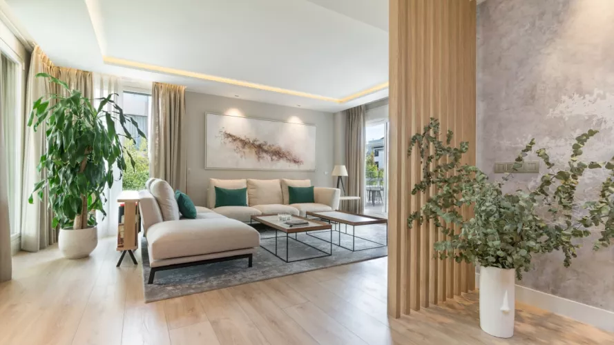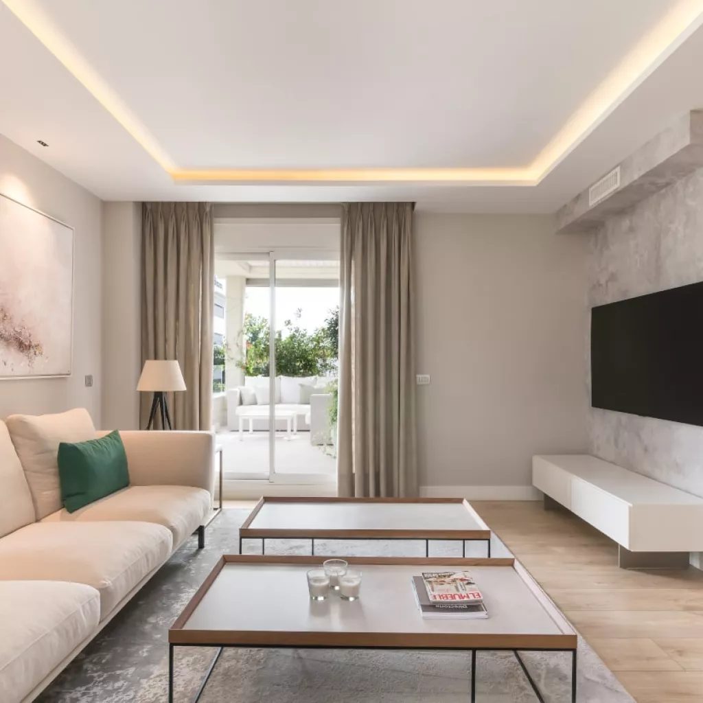 En el salón, un sofá en forma de L de MC, con tapicería en tono beige, alfombra de KP y mesas mesas bajas de Emede.