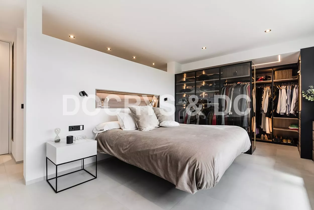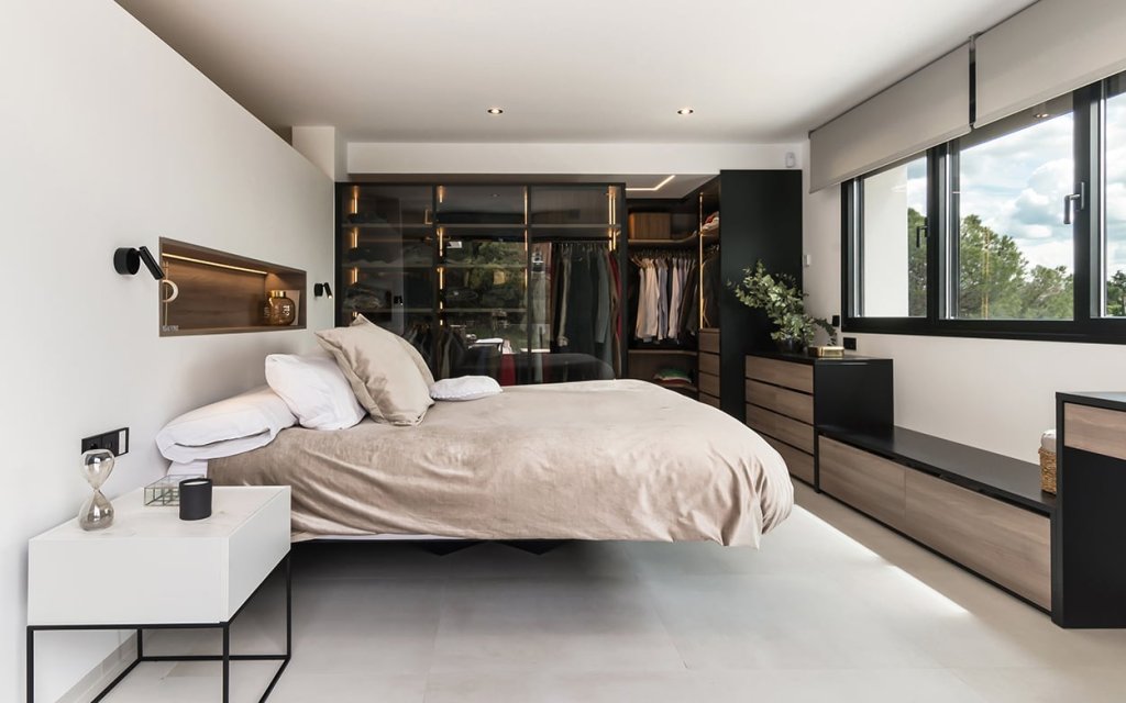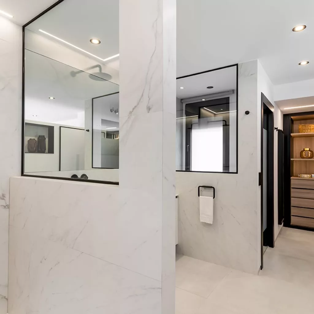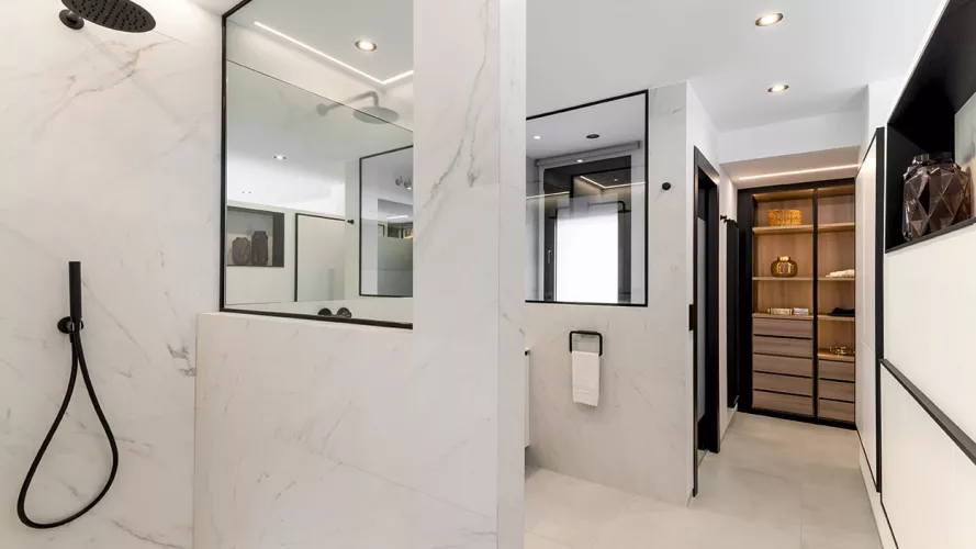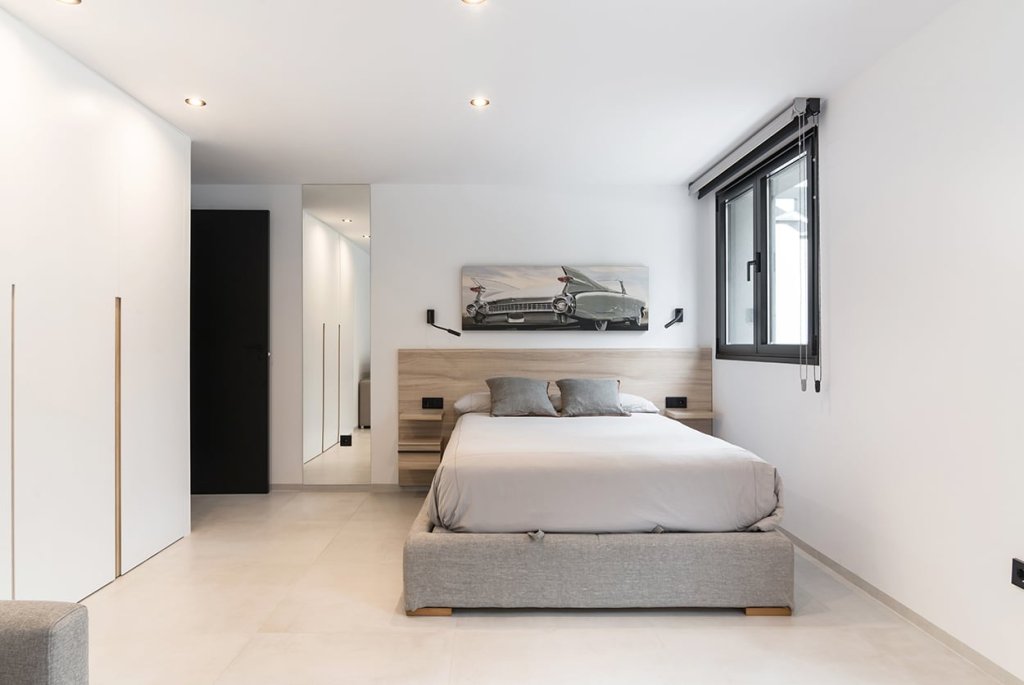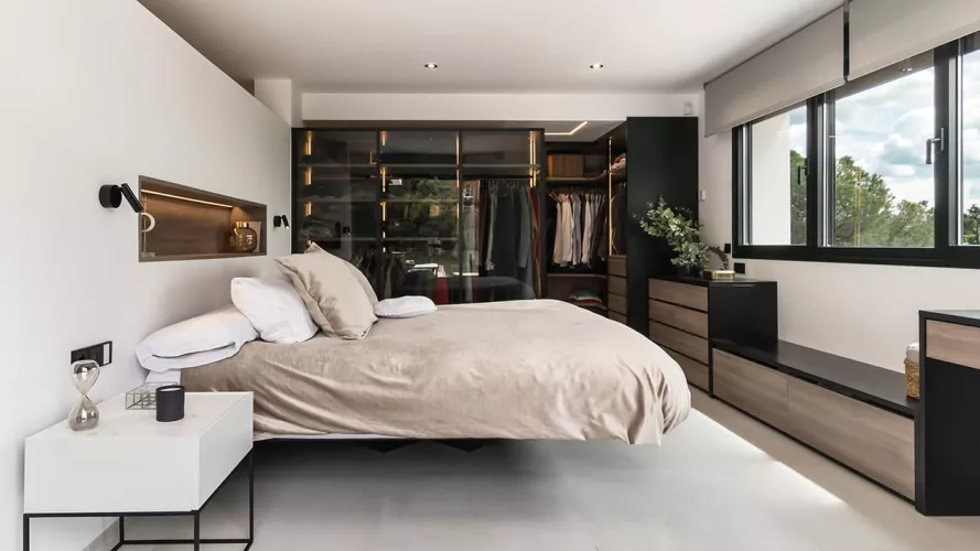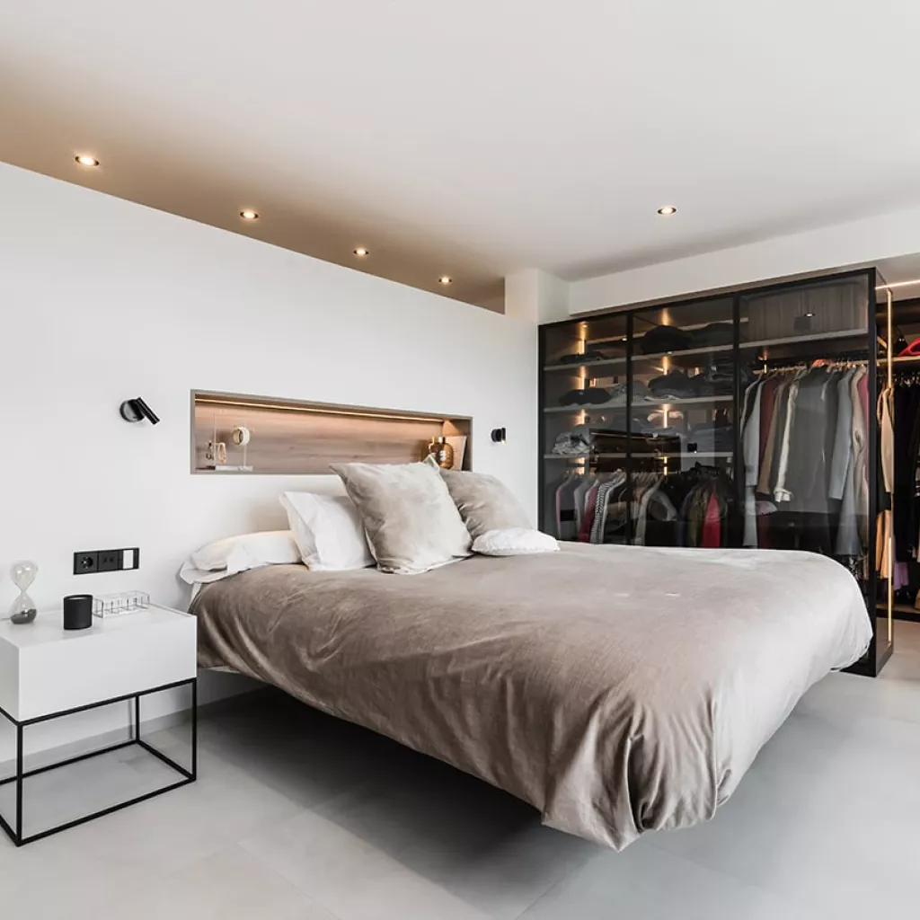 En el dormitorio también creamos un espacio abierto, uniendo el baño, dormitorio y vestidor.
