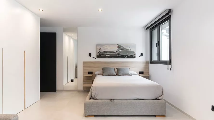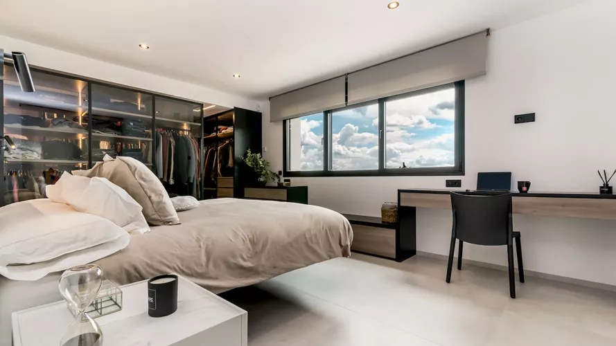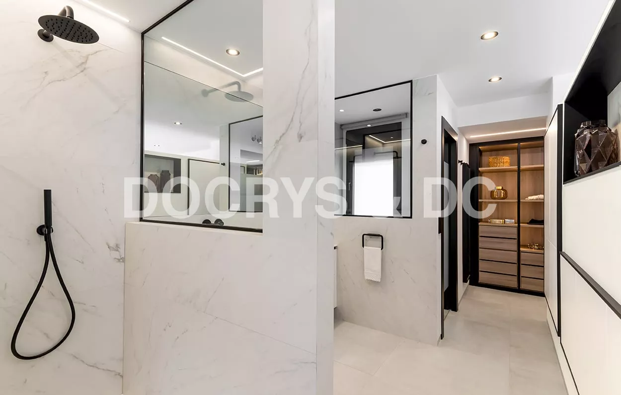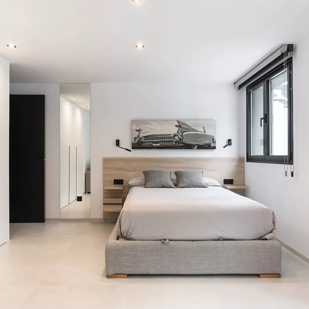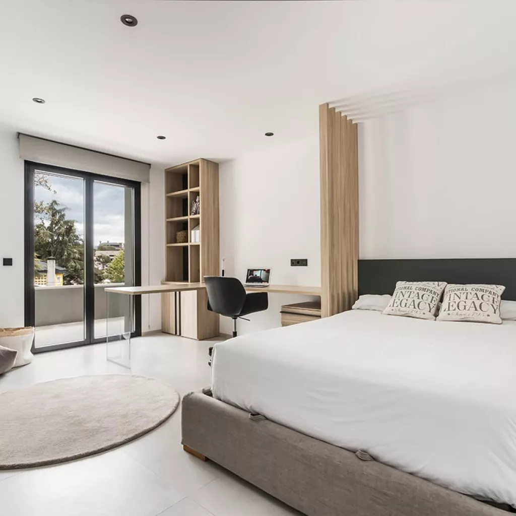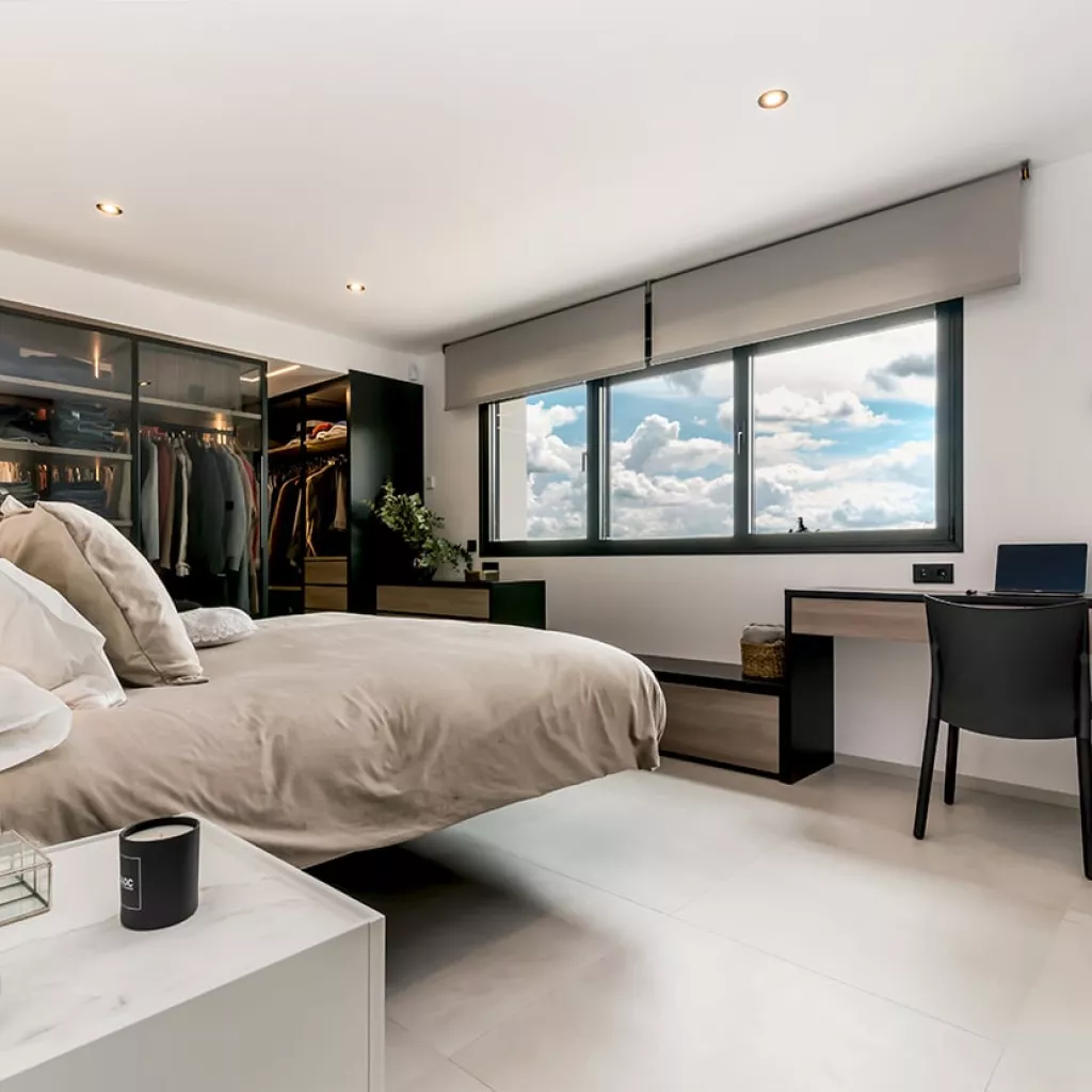 En el dormitorio también creamos un espacio abierto, uniendo el baño, dormitorio y vestidor.