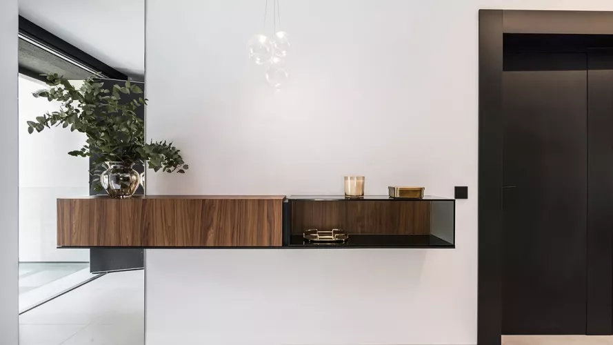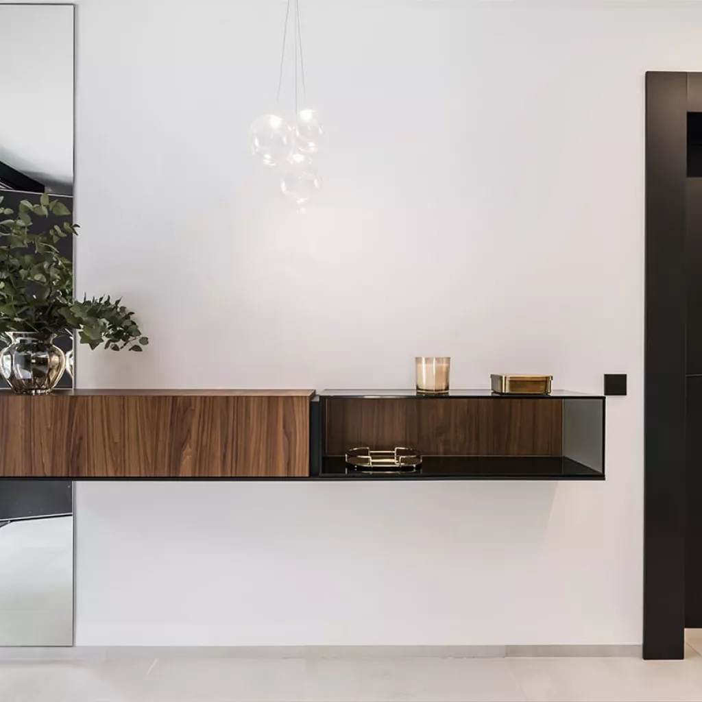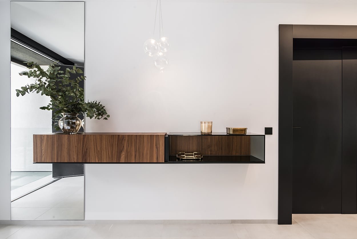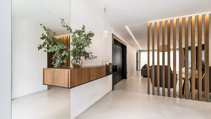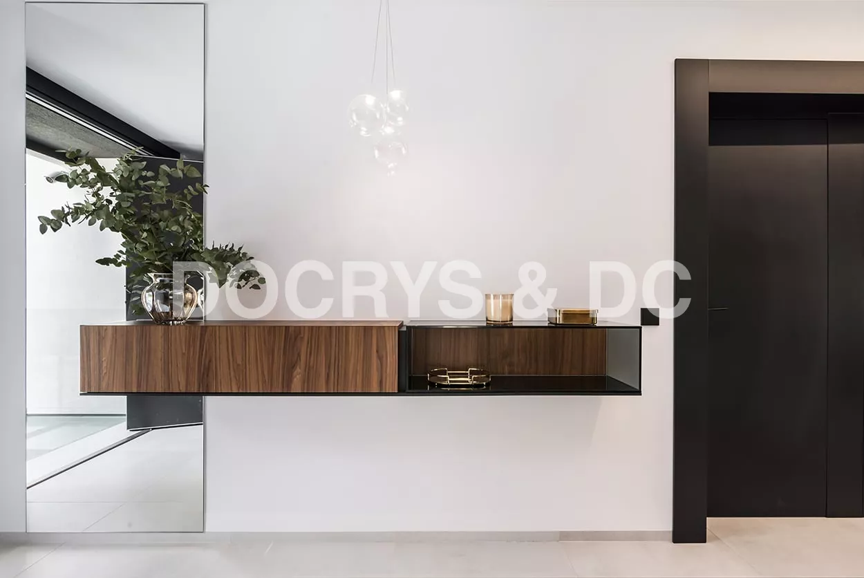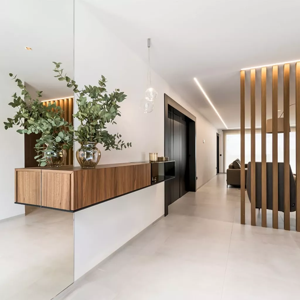 En el recibidor colocamos un aparador volado e iluminación decorativa desde el techo, obteniendo así como resultado, un espacio amplio, luminoso y sin obstáculos.