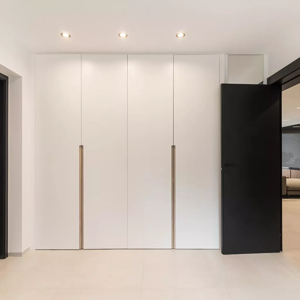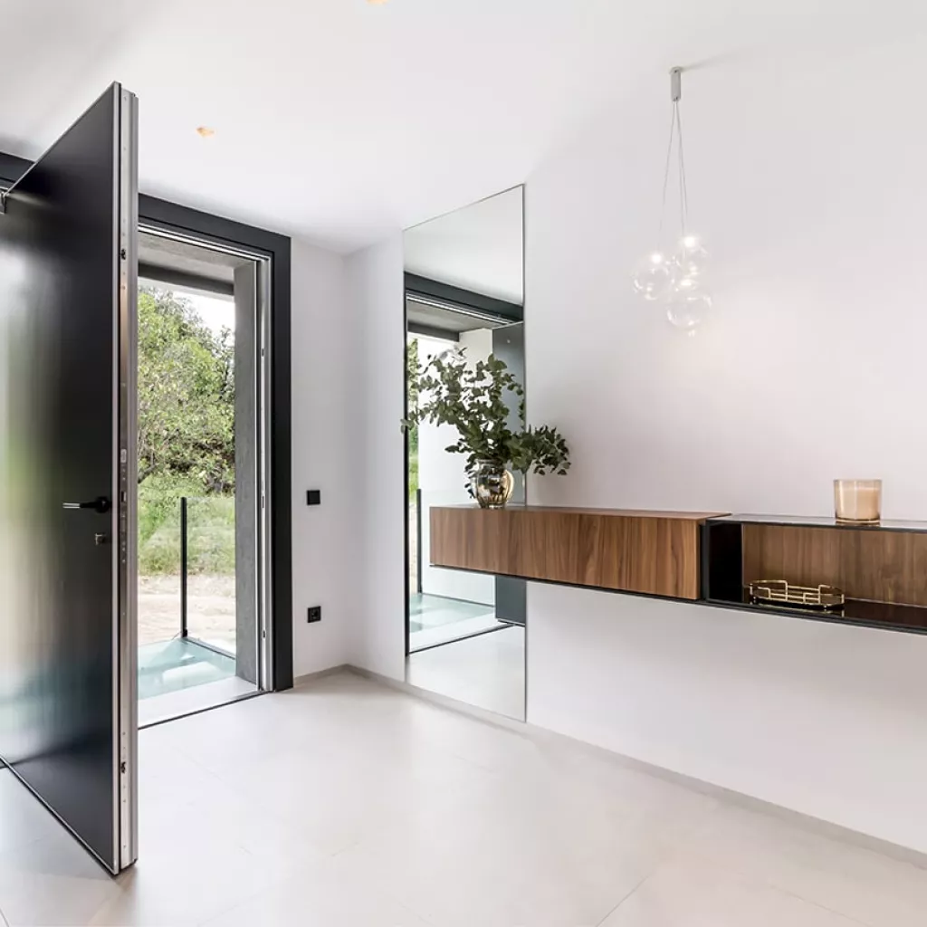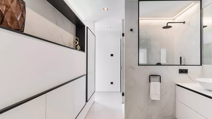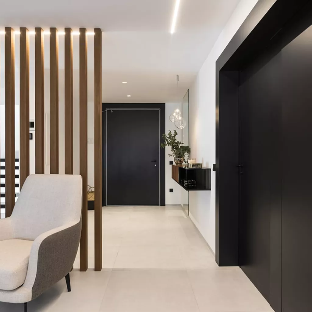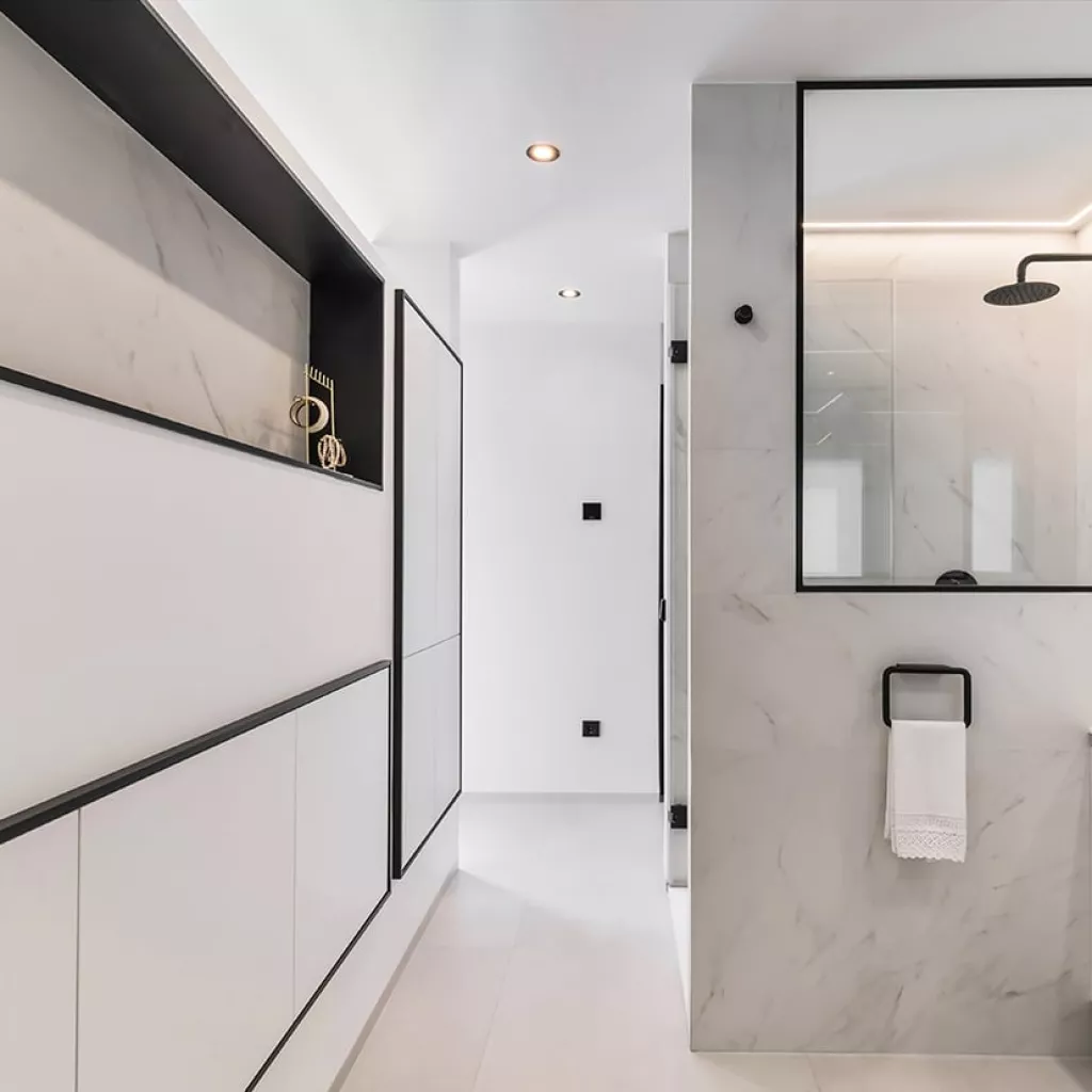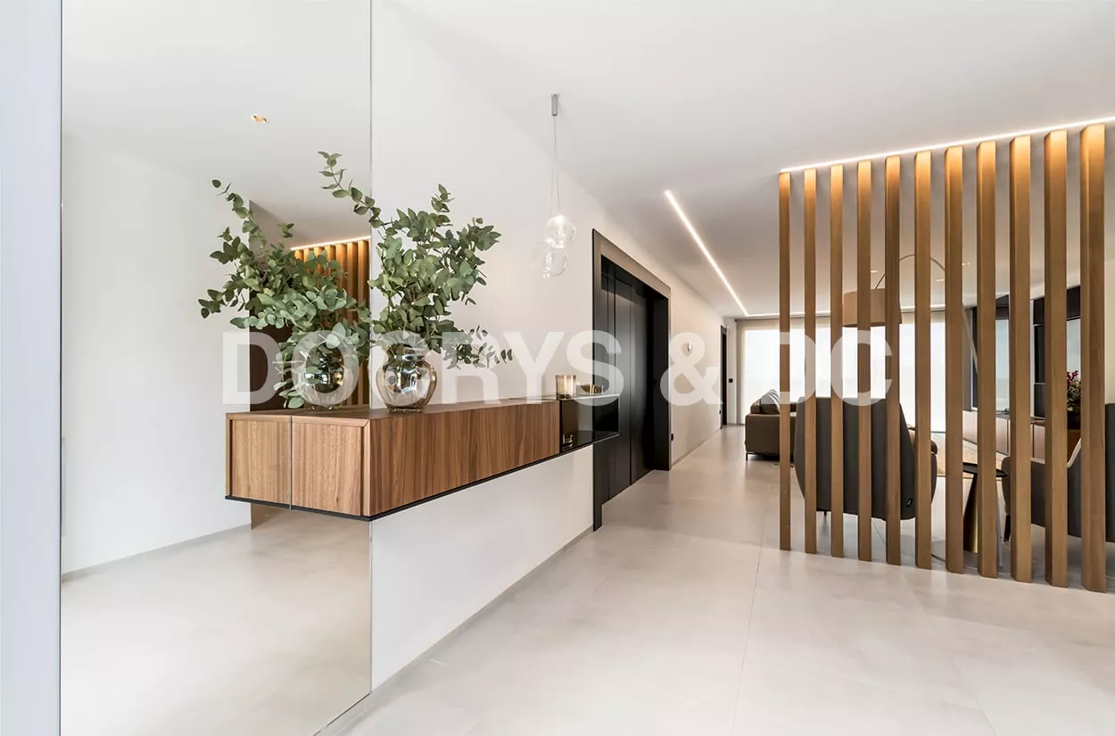 En el recibidor colocamos un aparador volado e iluminación decorativa desde el techo, obteniendo así como resultado, un espacio amplio, luminoso y sin obstáculos.