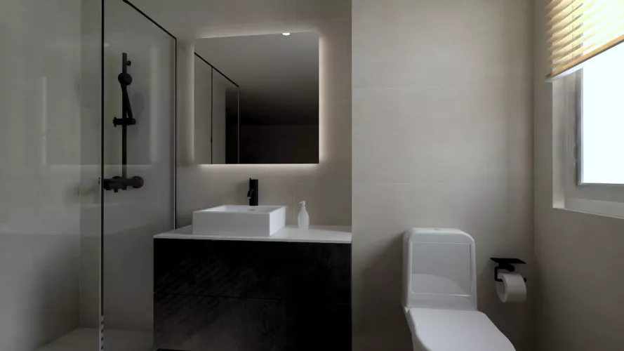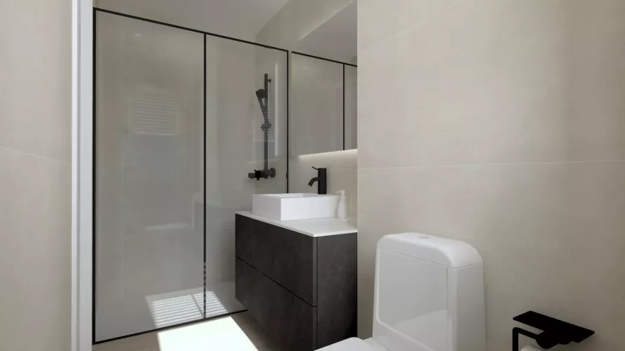 Proyecto de baño de unos 7mt2 donde hemos creado un espacio moderno y funcional que combina elegancia y practicidad. La mampara de ducha de la serie Freeline, con su puerta abatible y vidrio templado, aporta un toque contemporáneo y seguro. El espejo, con iluminación incorporada activada por sensor lateral y aumento integrado, garantiza una experiencia de cuidado personal sin esfuerzo. Los accesorios de baño de la marca Sonia, en elegante negro mate, añaden un toque de sofisticación y coordinación al espacio. El mueble suspendido bajo el espejo, con dos cajones y apertura push, maximiza el almacenamiento sin sacrificar el estilo. En conjunto, este baño ofrece una experiencia de bienestar y comodidad, perfecta para el día a día.