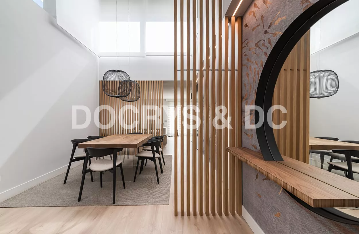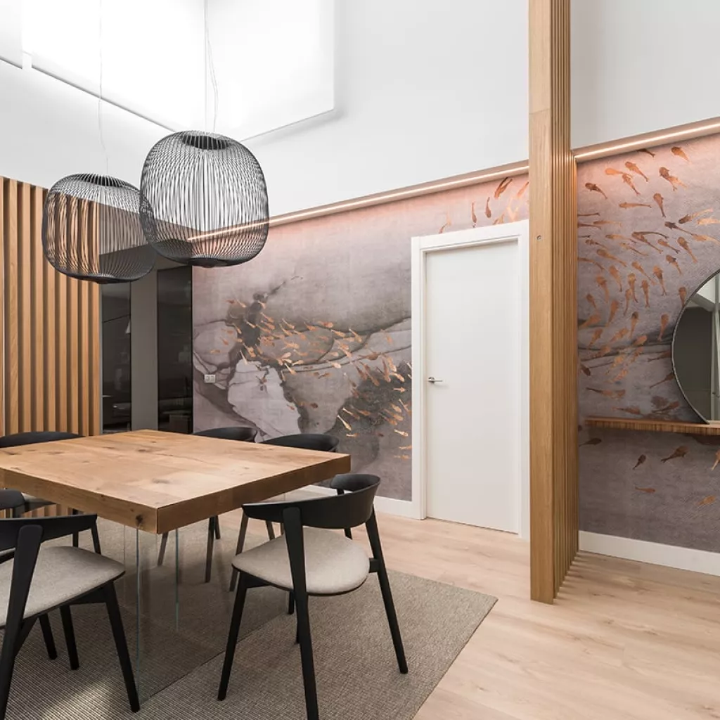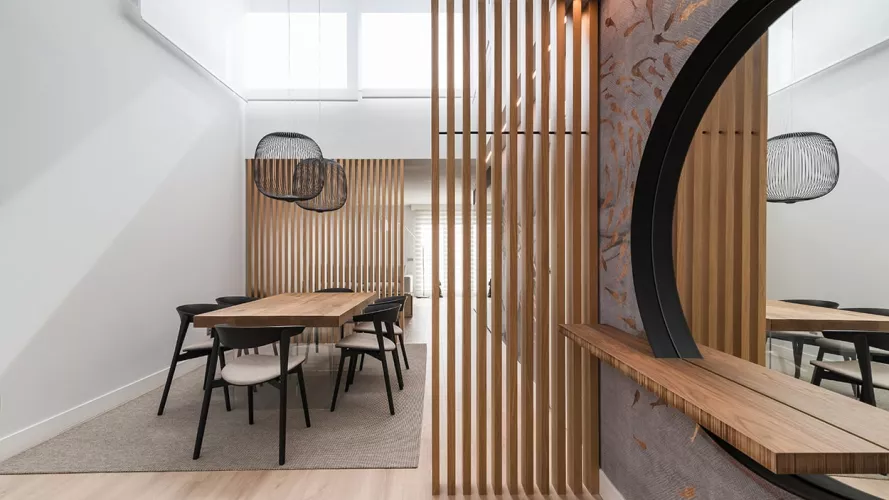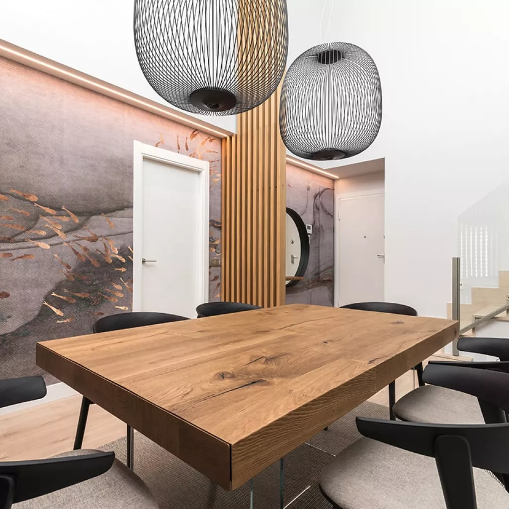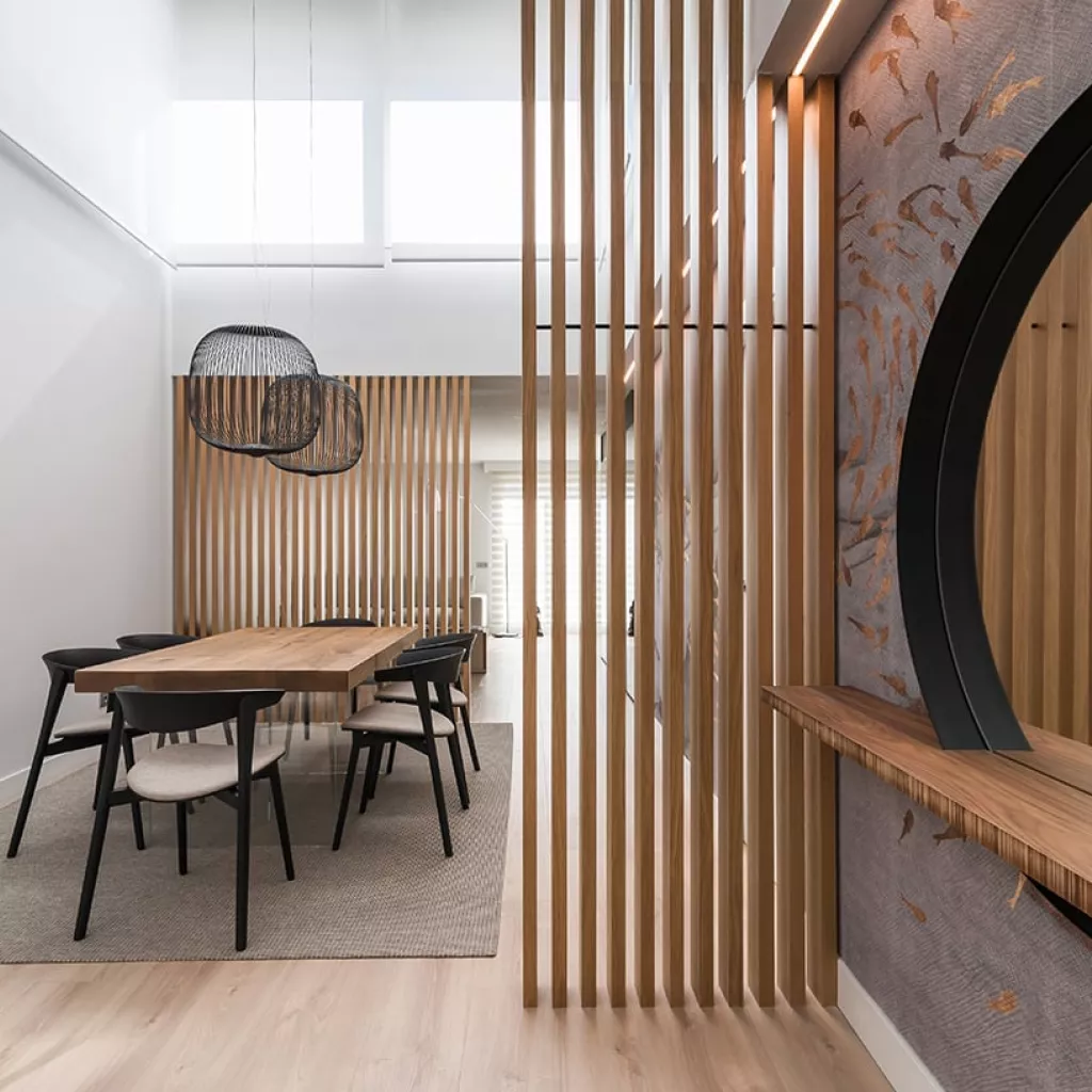 Durante el proyecto, quisimos dividir la estancia en varias zonas jugando con una palillería hecha a medida, obteniendo como resultado, zonas divididas pero no separadas y así conseguir mayor amplitud y aprovechar toda la luminosidad de los grandes ventanales ubicados en la zona más alta de la estancia.
