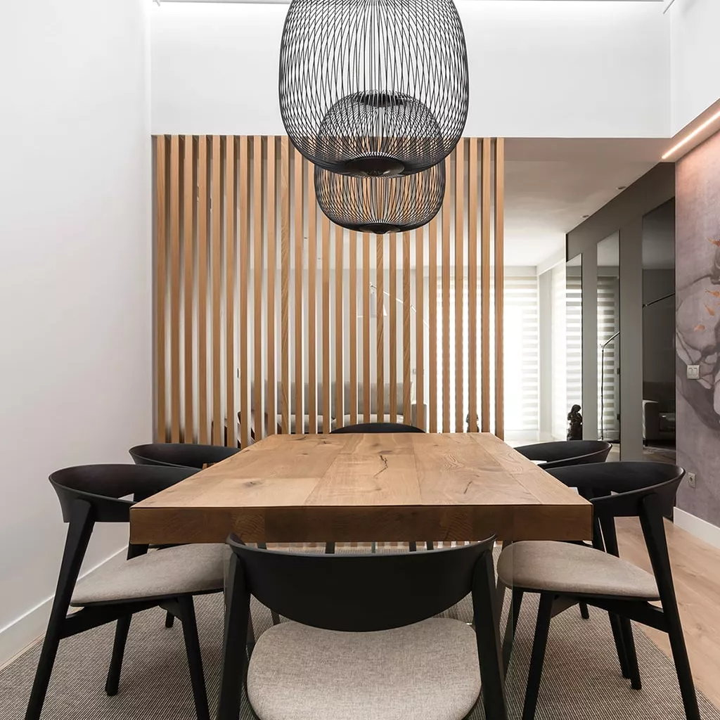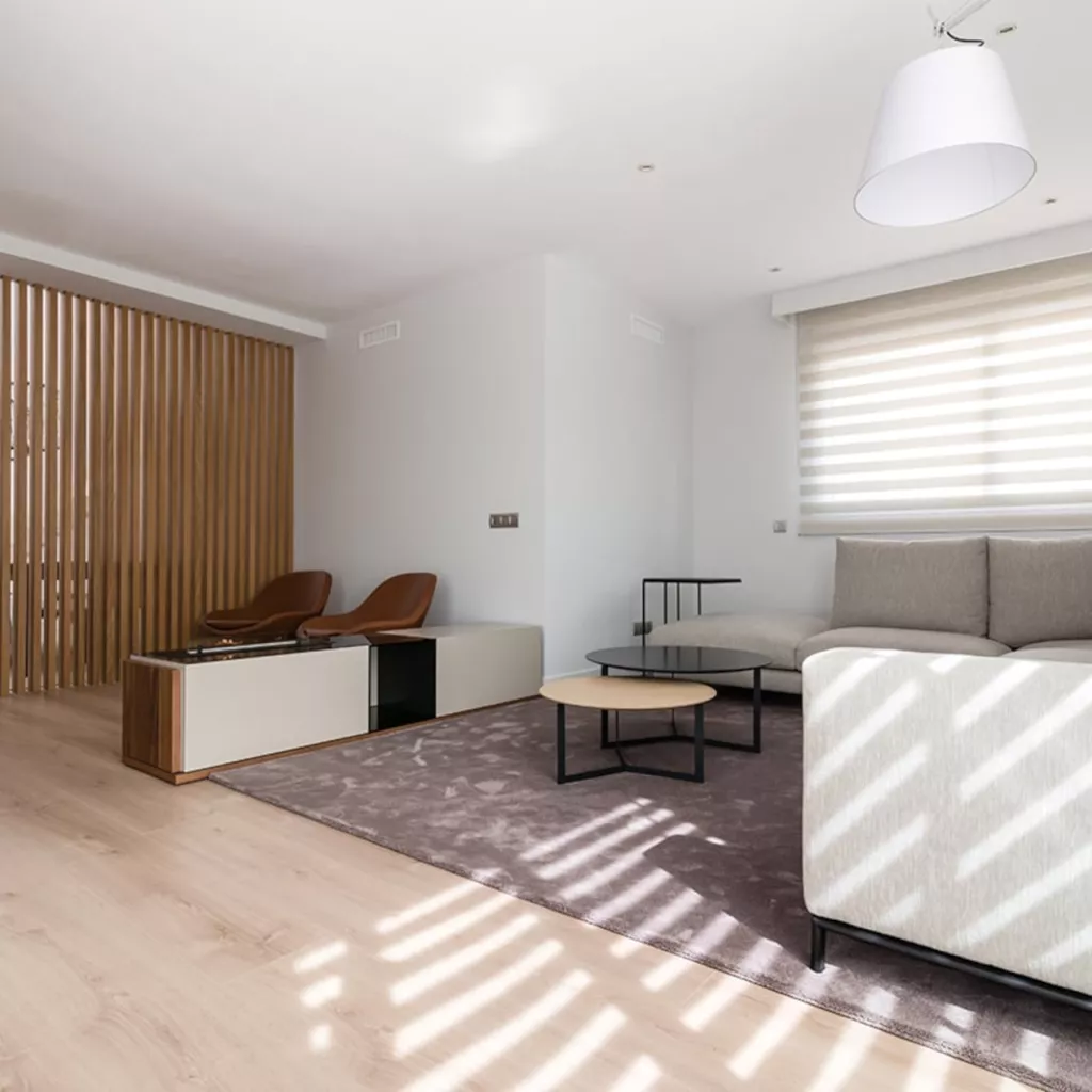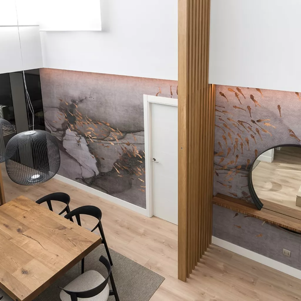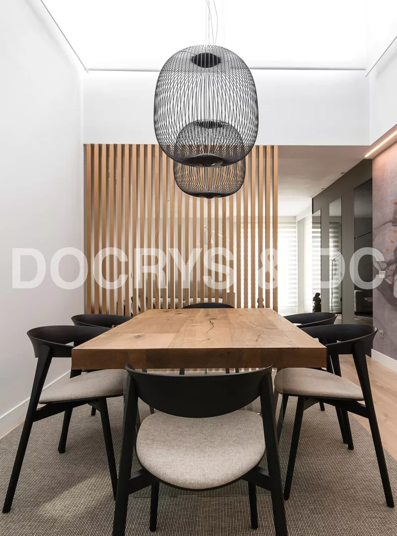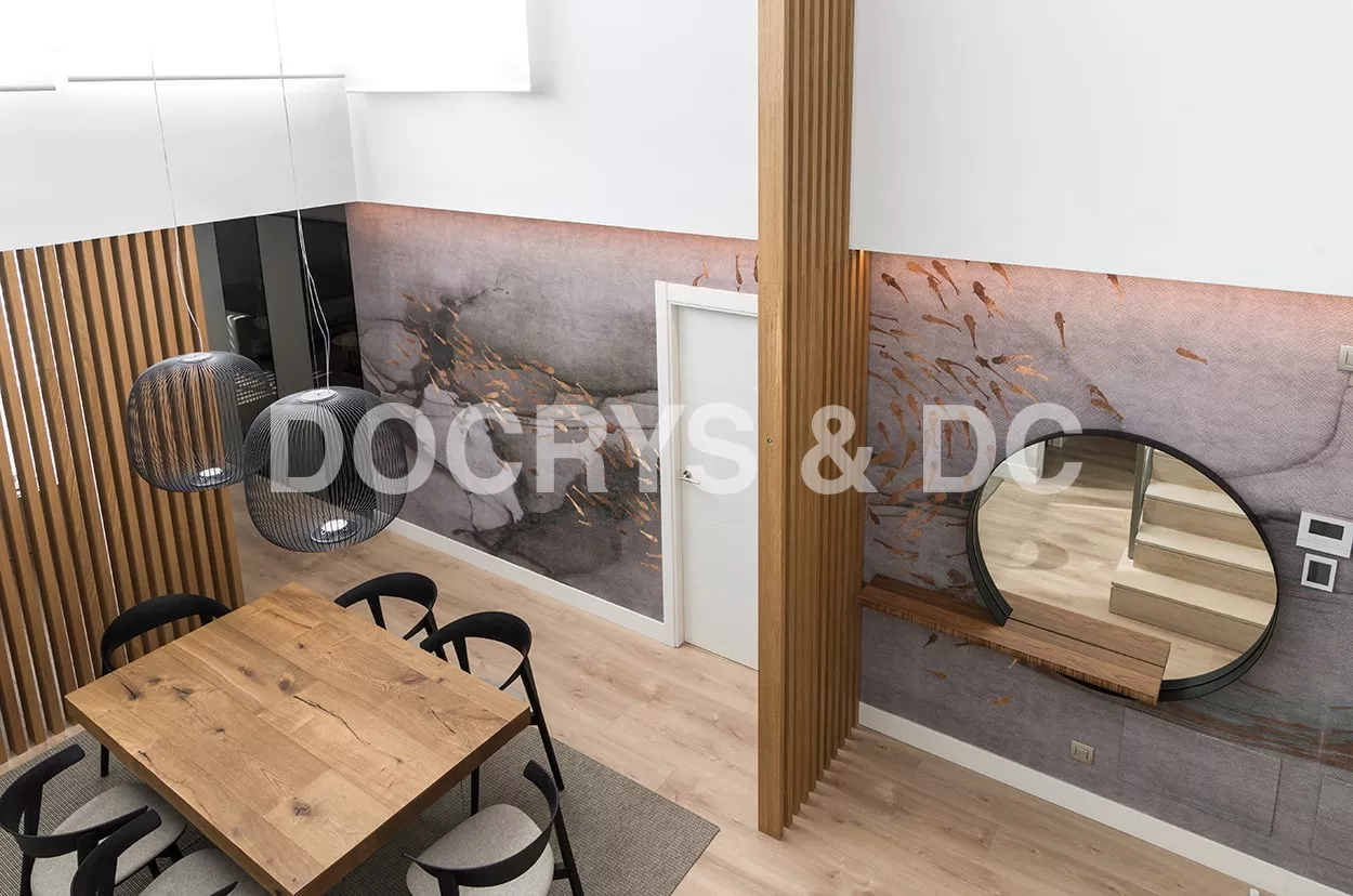 Durante el proyecto, quisimos dividir la estancia en varias zonas jugando con una palillería hecha a medida, obteniendo como resultado, zonas divididas pero no separadas y así conseguir mayor amplitud y aprovechar toda la luminosidad de los grandes ventanales ubicados en la zona más alta de la estancia.