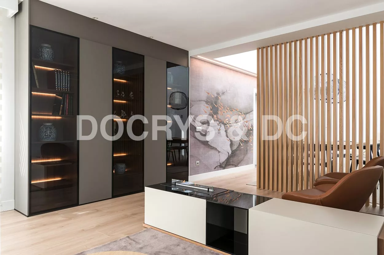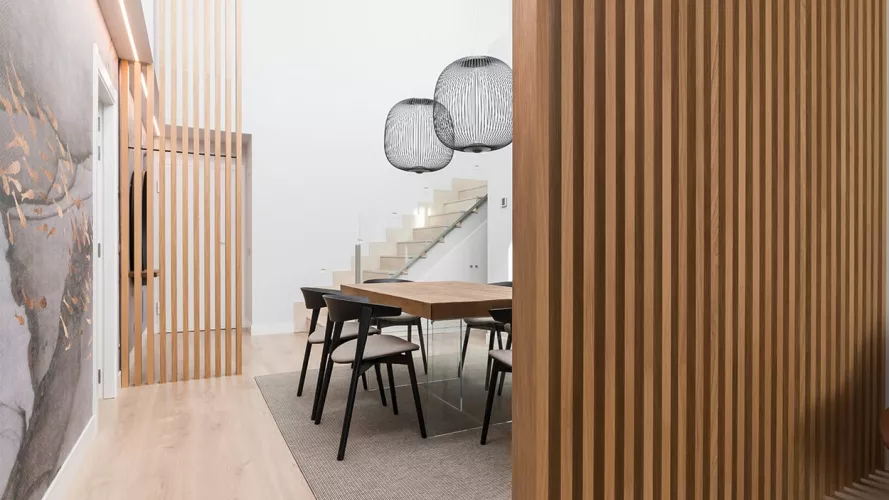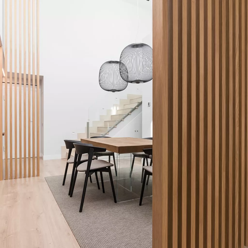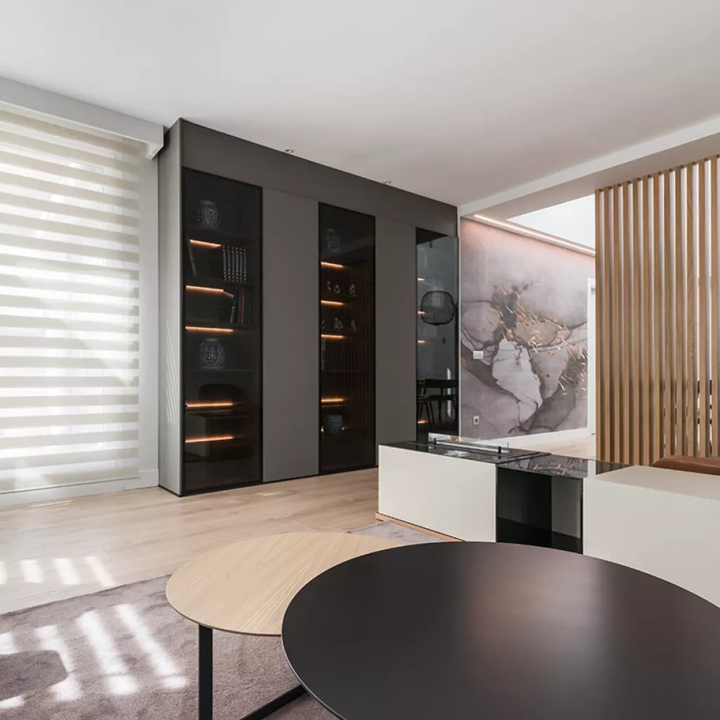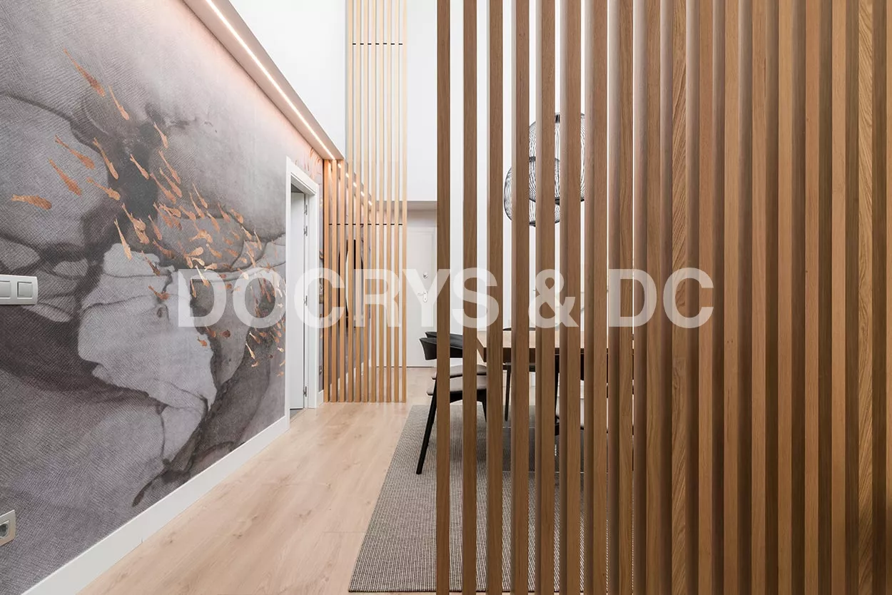 Durante el proyecto, quisimos dividir la estancia en varias zonas jugando con una palillería hecha a medida, obteniendo como resultado, zonas divididas pero no separadas y así conseguir mayor amplitud y aprovechar toda la luminosidad de los grandes ventanales ubicados en la zona más alta de la estancia.