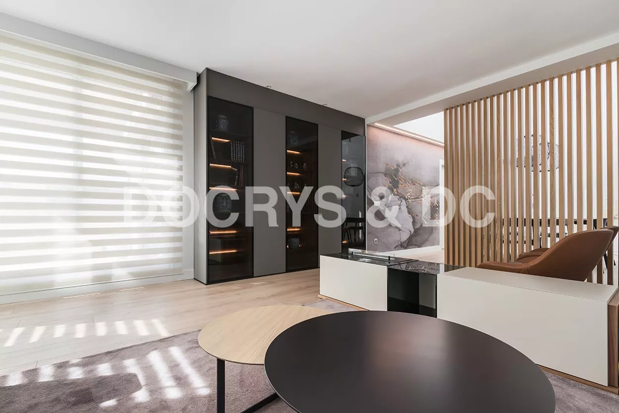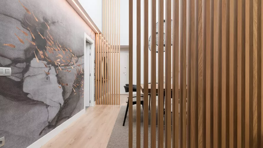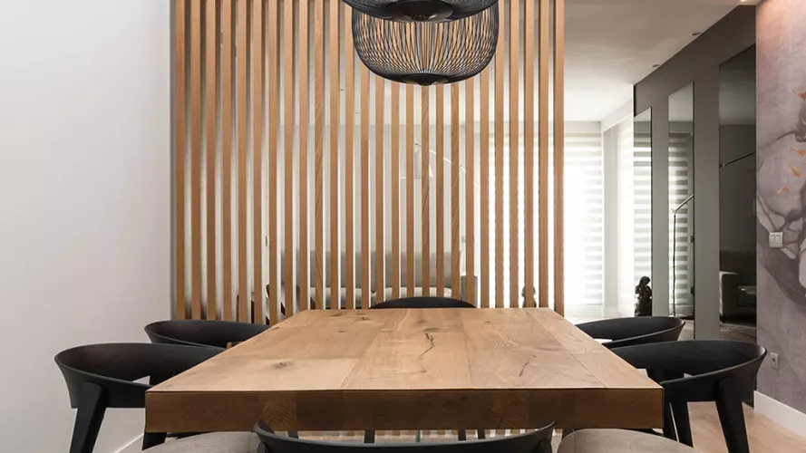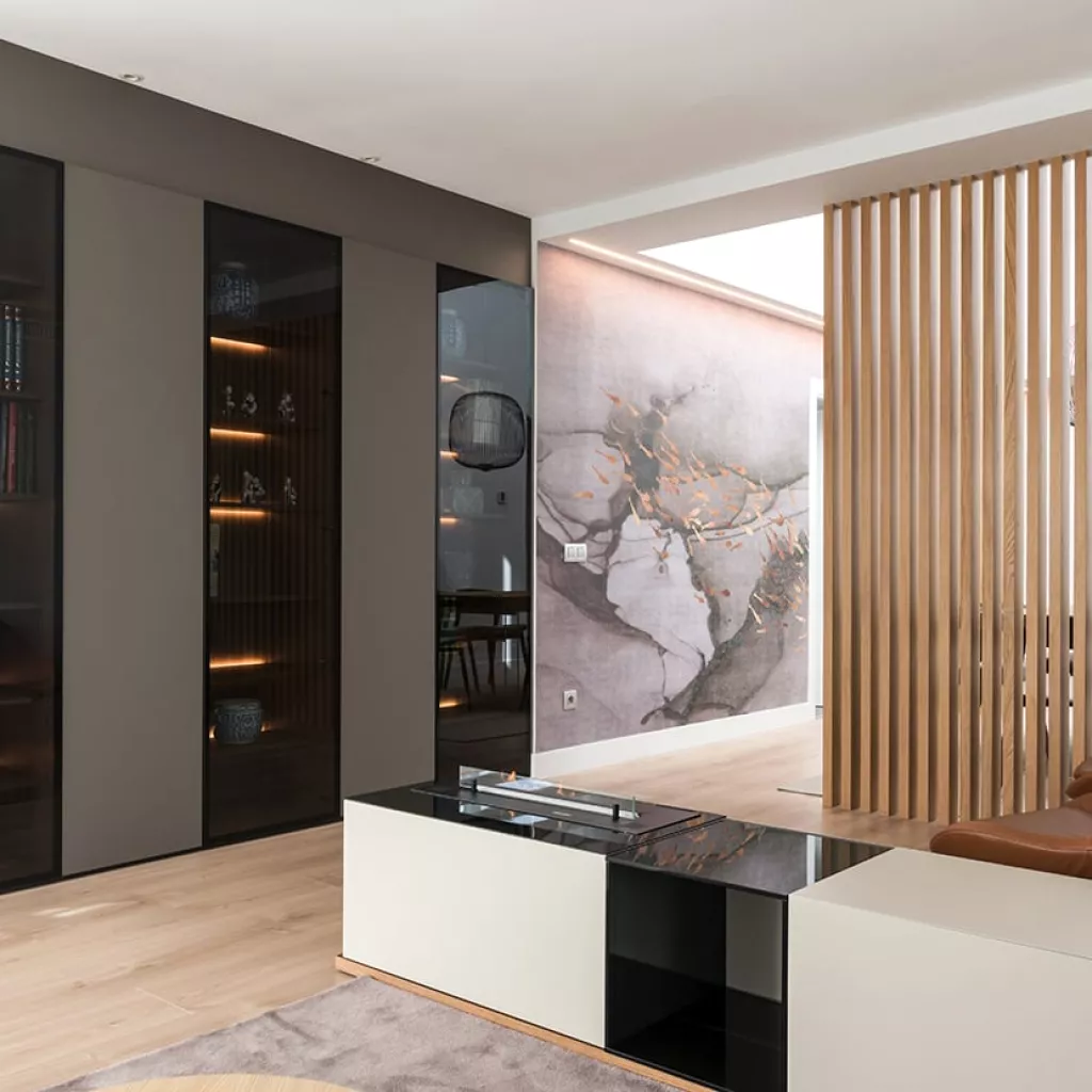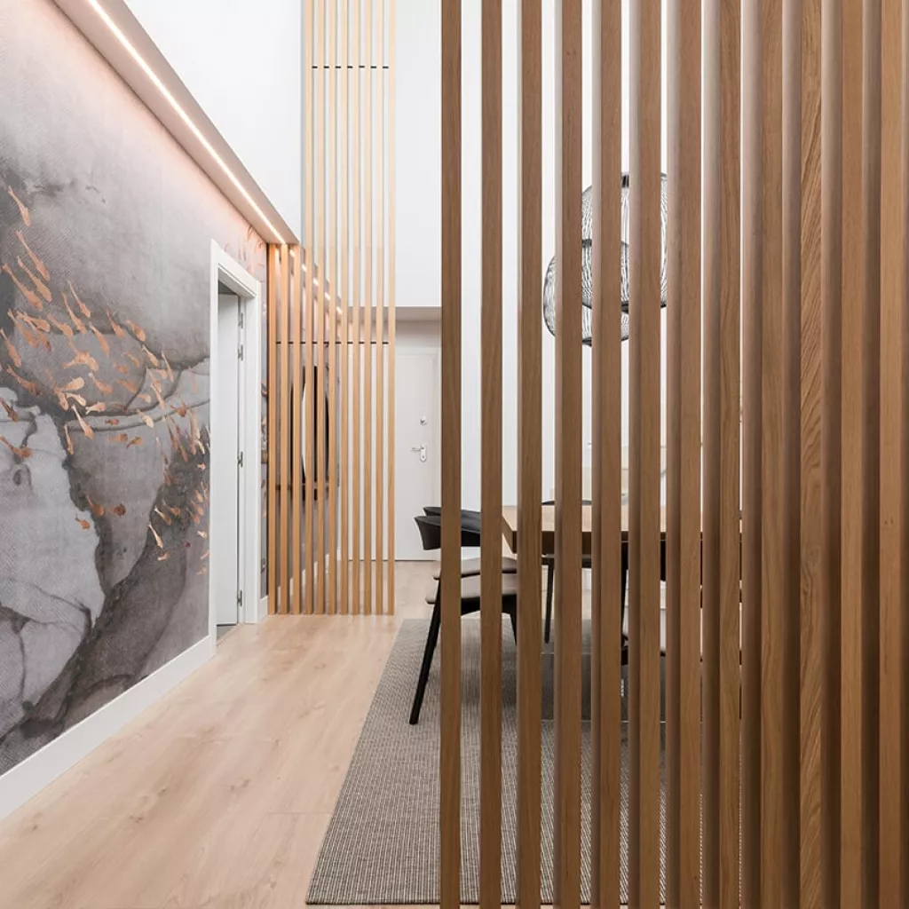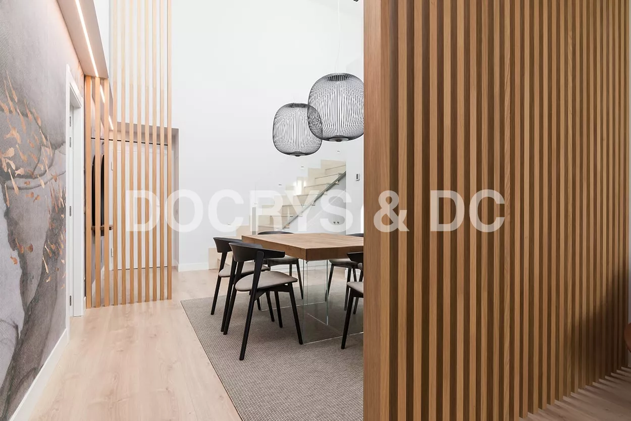 Durante el proyecto, quisimos dividir la estancia en varias zonas jugando con una palillería hecha a medida, obteniendo como resultado, zonas divididas pero no separadas y así conseguir mayor amplitud y aprovechar toda la luminosidad de los grandes ventanales ubicados en la zona más alta de la estancia.