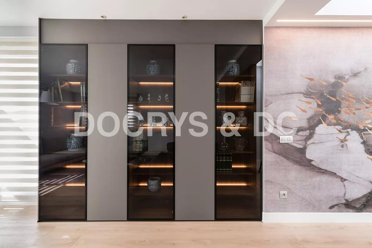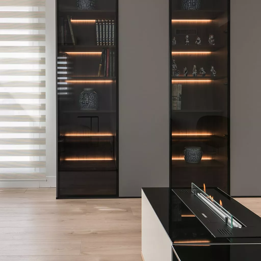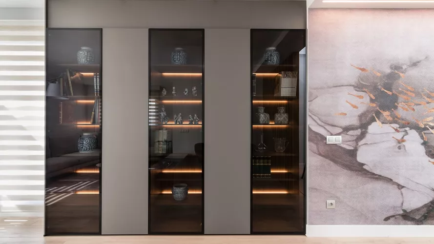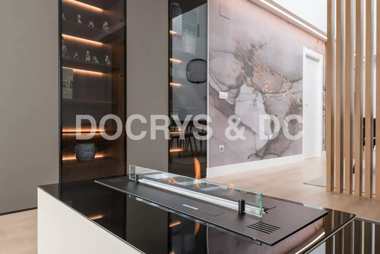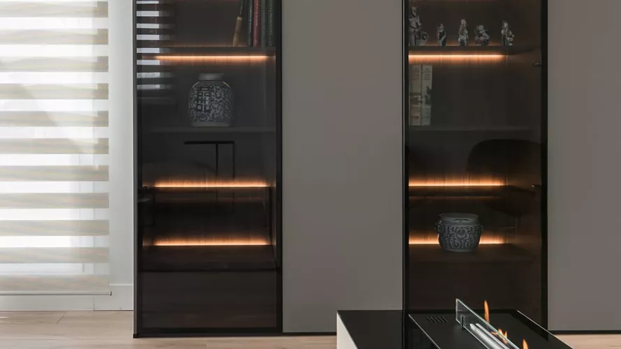 En esta estancia, hemos optado por colocar una vitrina de Santos con iluminación ambiental que sirve como almacenaje para la vajilla.