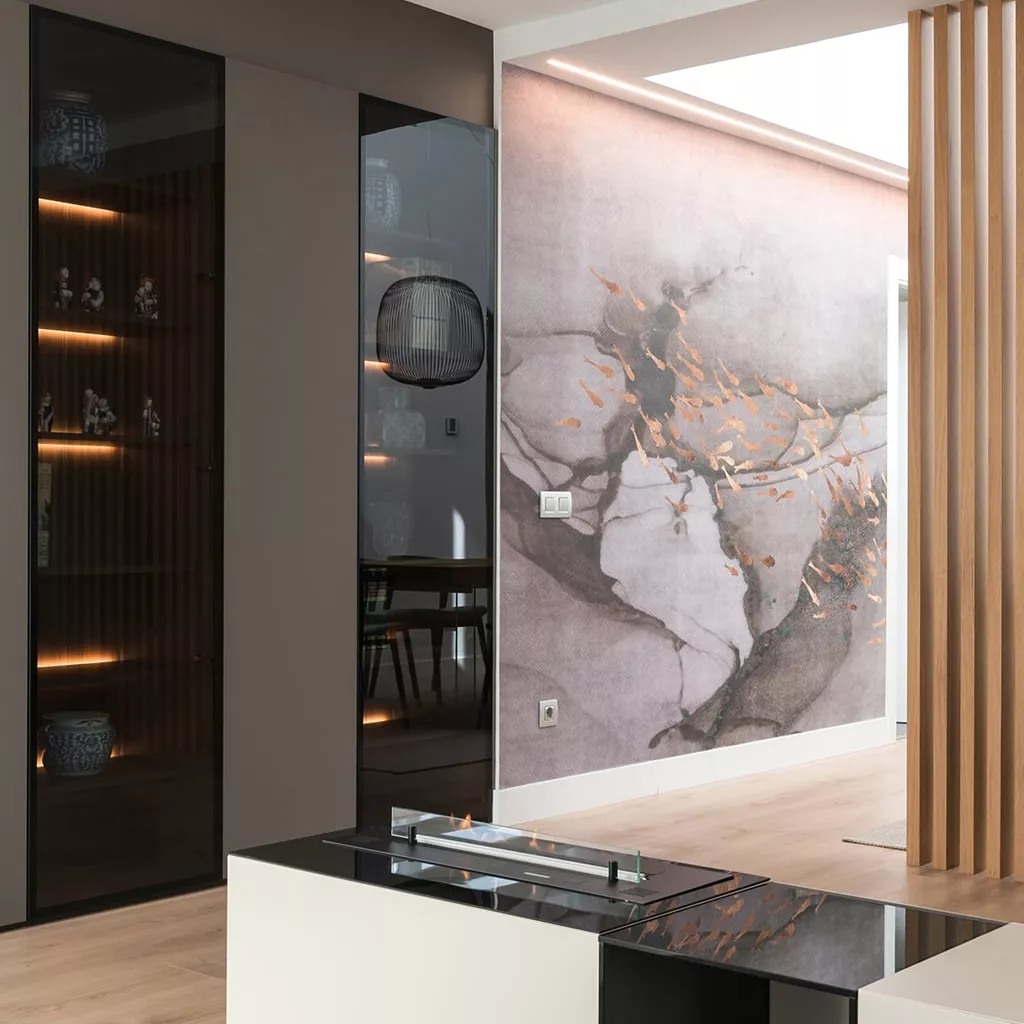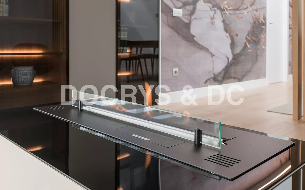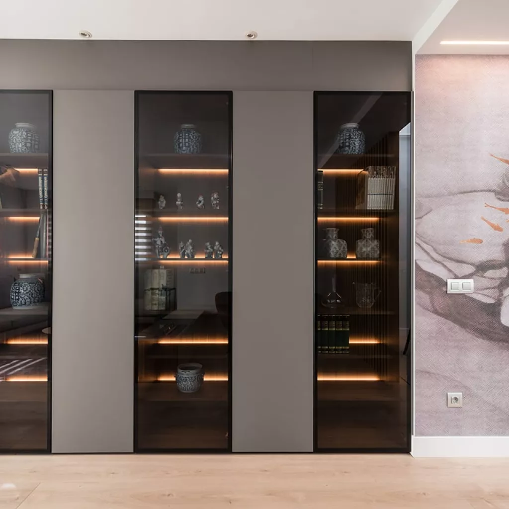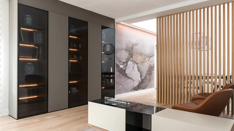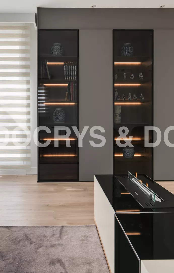 En esta estancia, hemos optado por colocar una vitrina de Santos con iluminación ambiental que sirve como almacenaje para la vajilla.