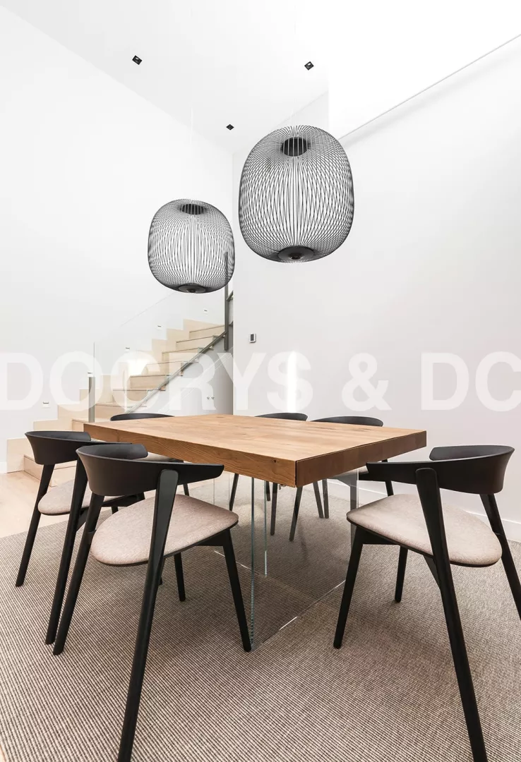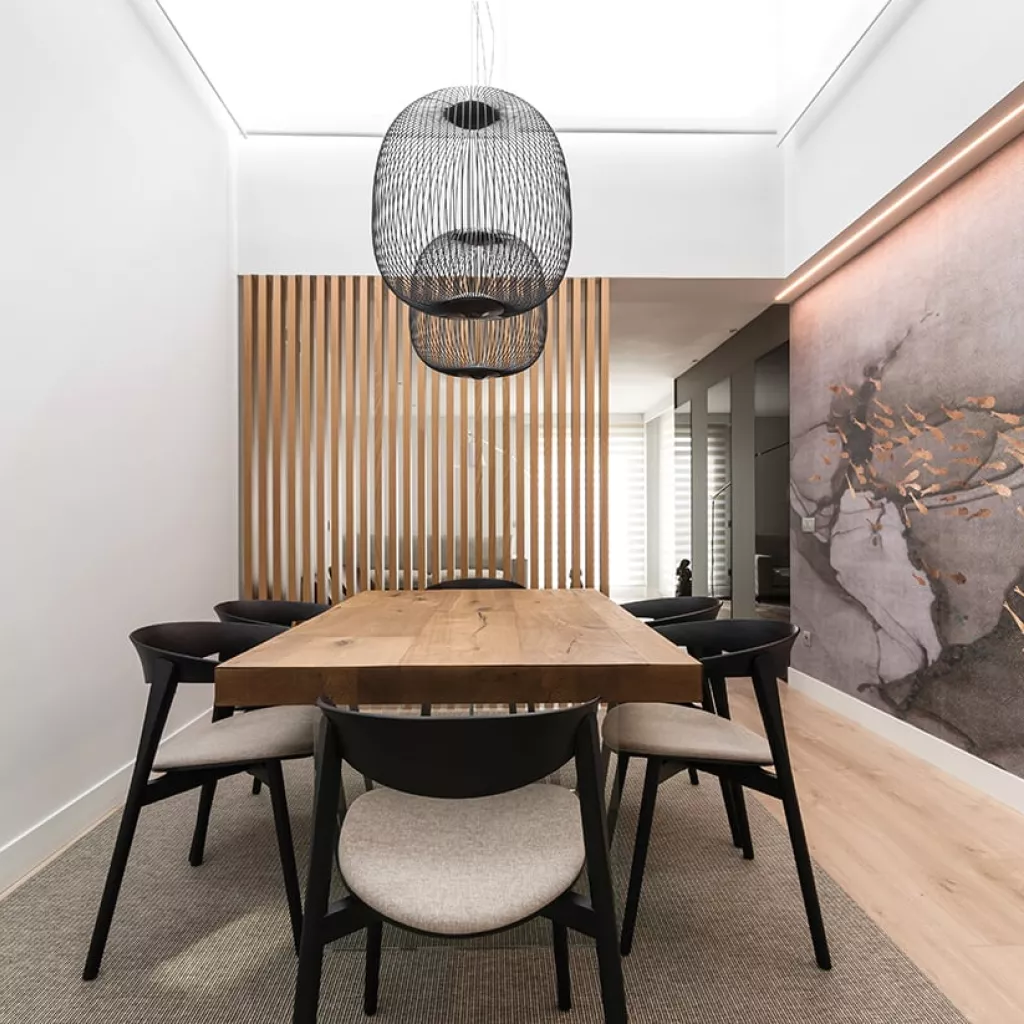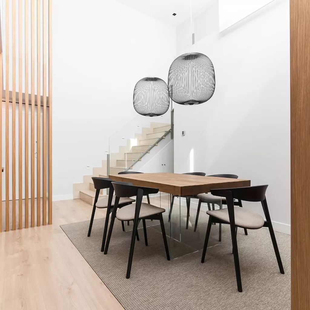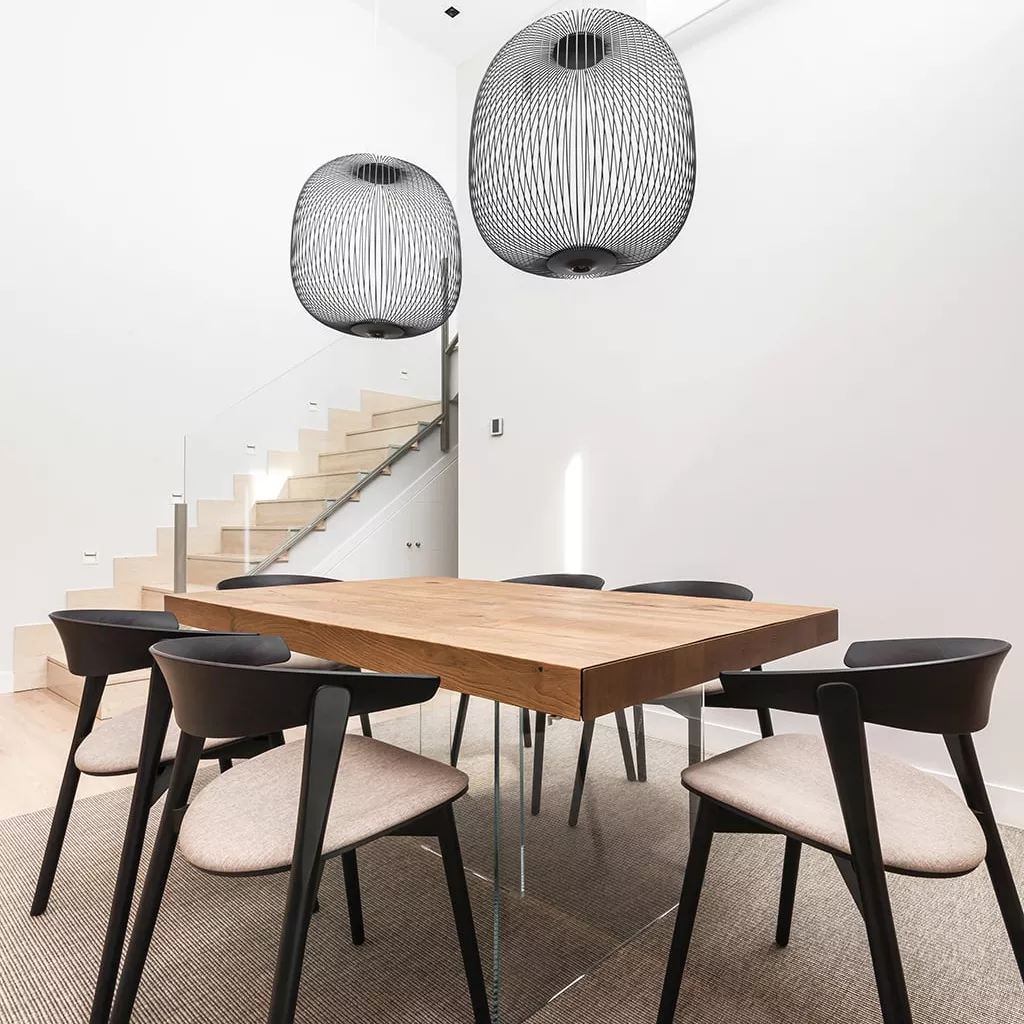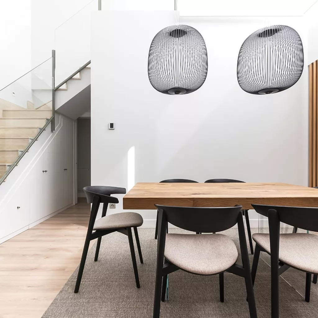 En cuanto al comedor, hemos colocado dos grandes lámparas colgantes de la marca Foscarini, modelo Spokes.