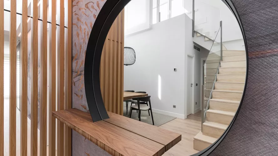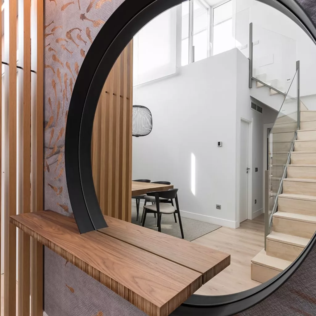 En el recibidor hemos ubicado un gran espejo en forma circular de la marca Cattelan para así conseguir mayor amplitud.
