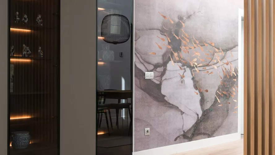 El elemento que hace que la estancia sea única y con mucha personalidad, es el papel pintado de la marca Glamora, aporta frescura, elegancia y sofisticación a toda la estancia, rompiendo con los tonos neutros y aportando un chute de energía.
