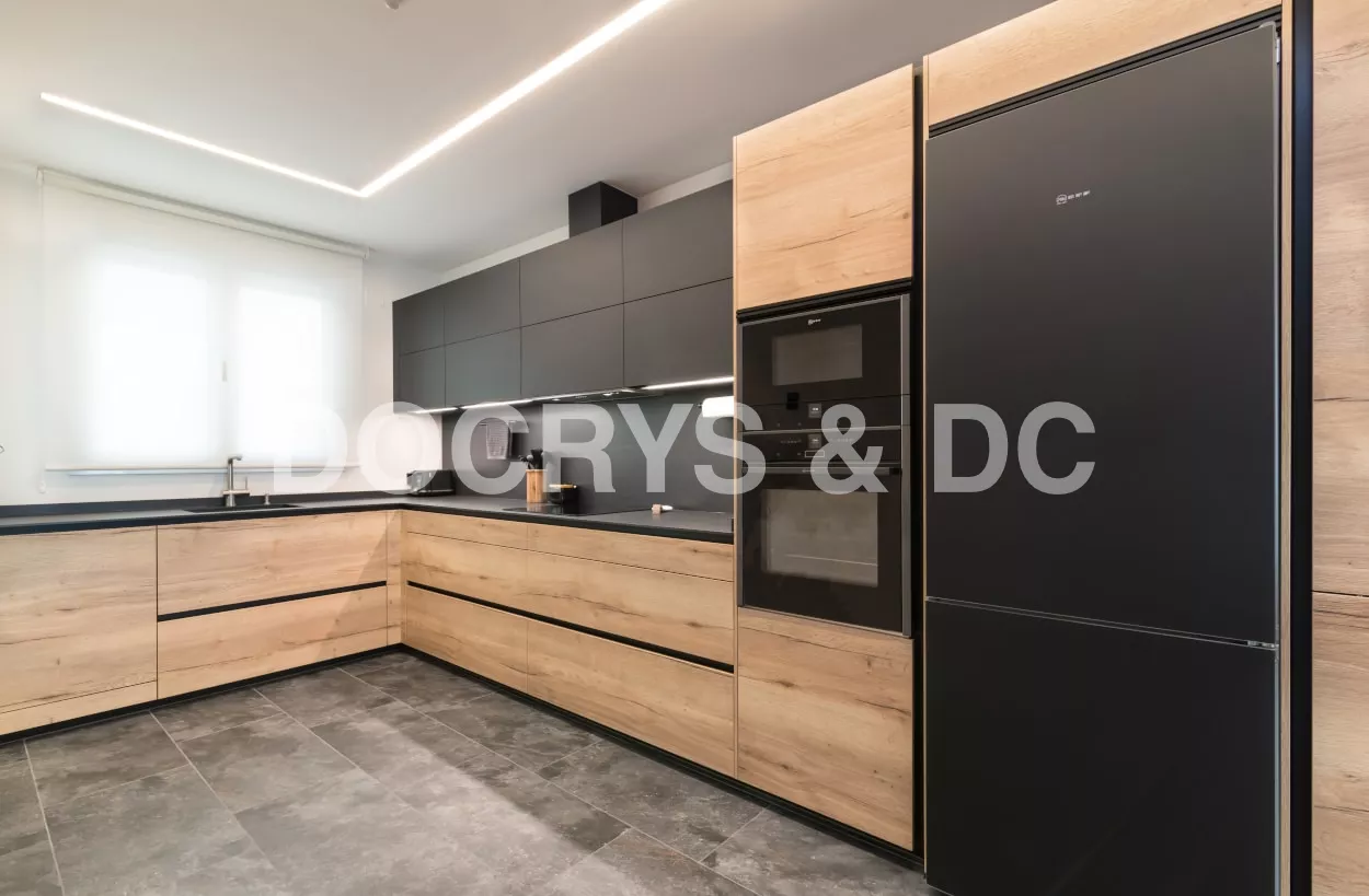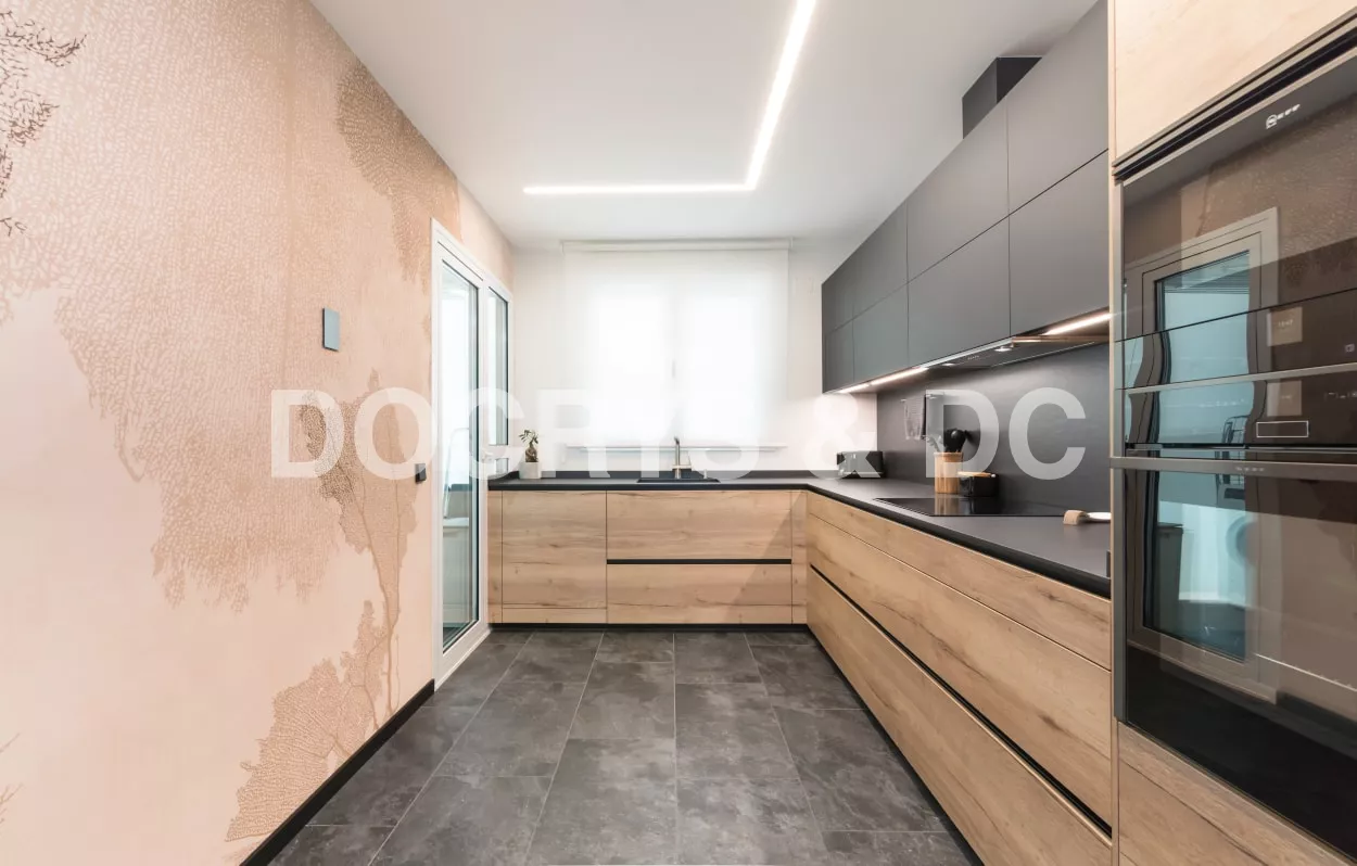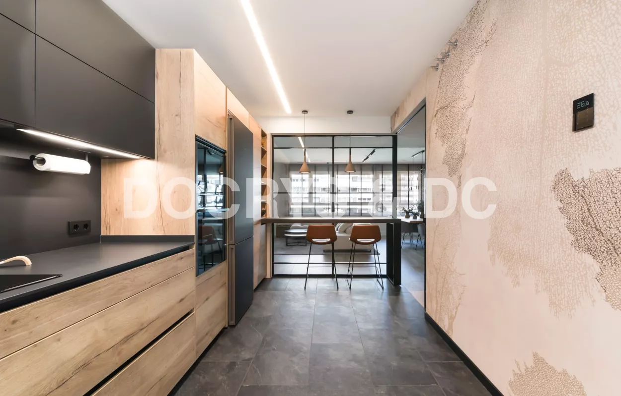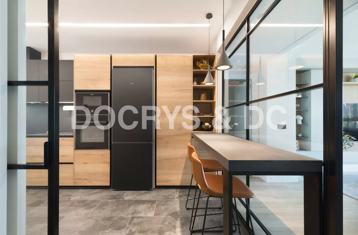 En primer lugar, decidimos abrir la cocina al salón, creando un espacio semiabierto pero siempre conectado a través de unas puertas correderas de cristal y aluminio negro.