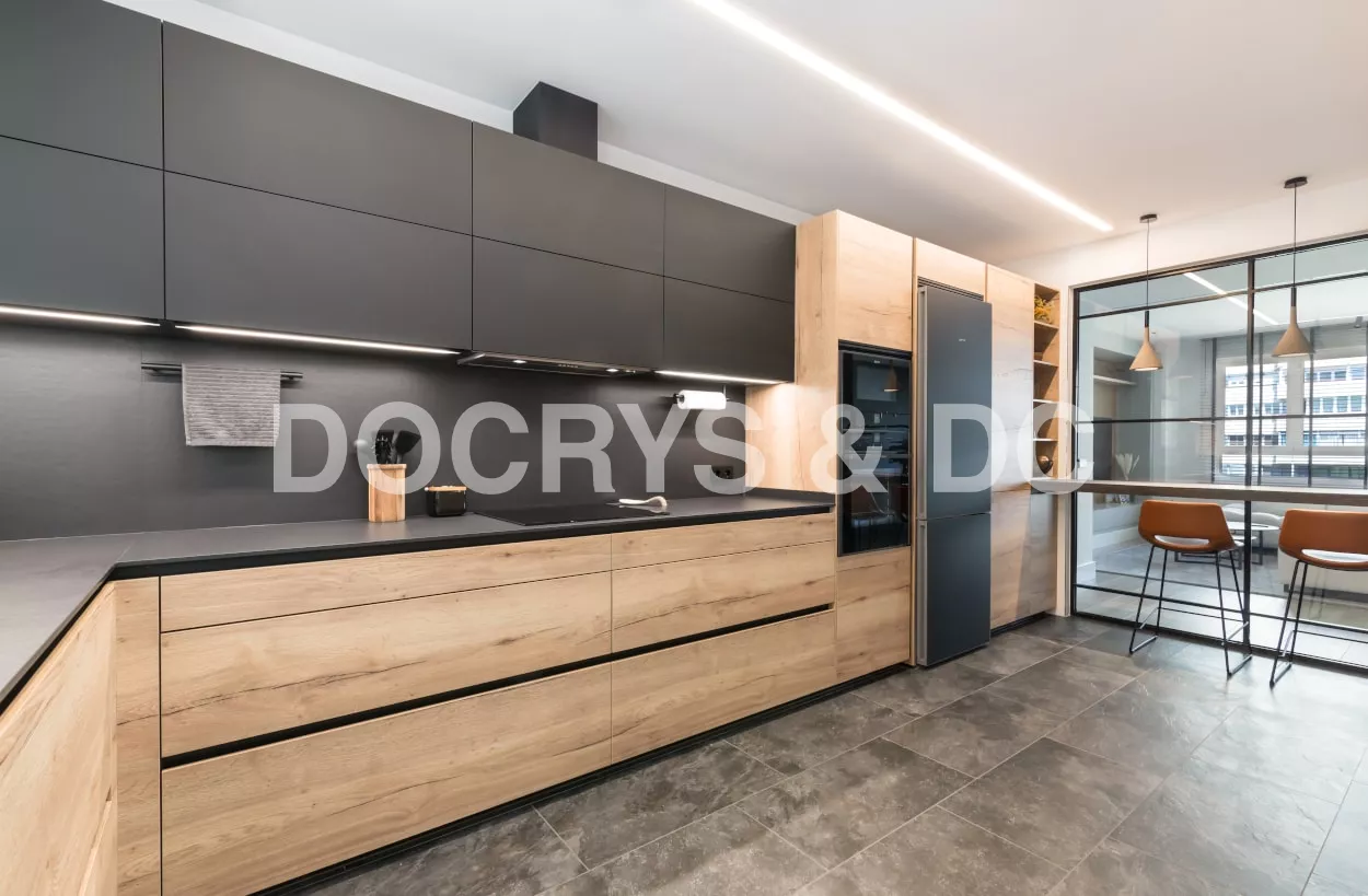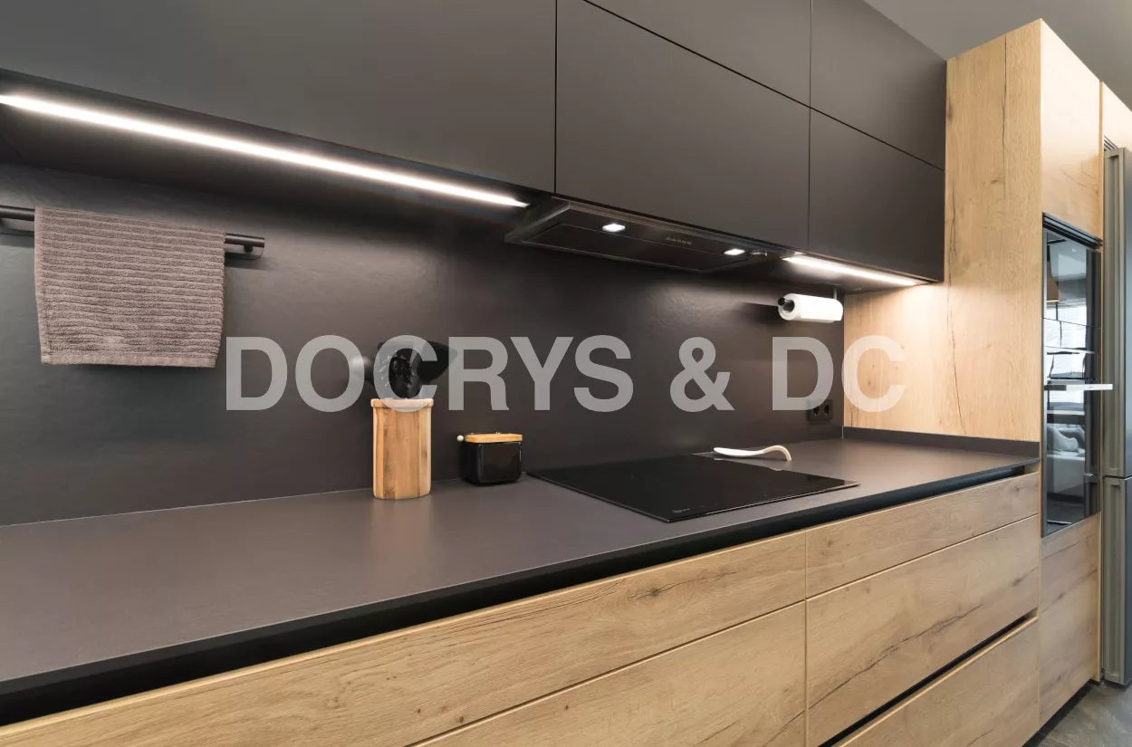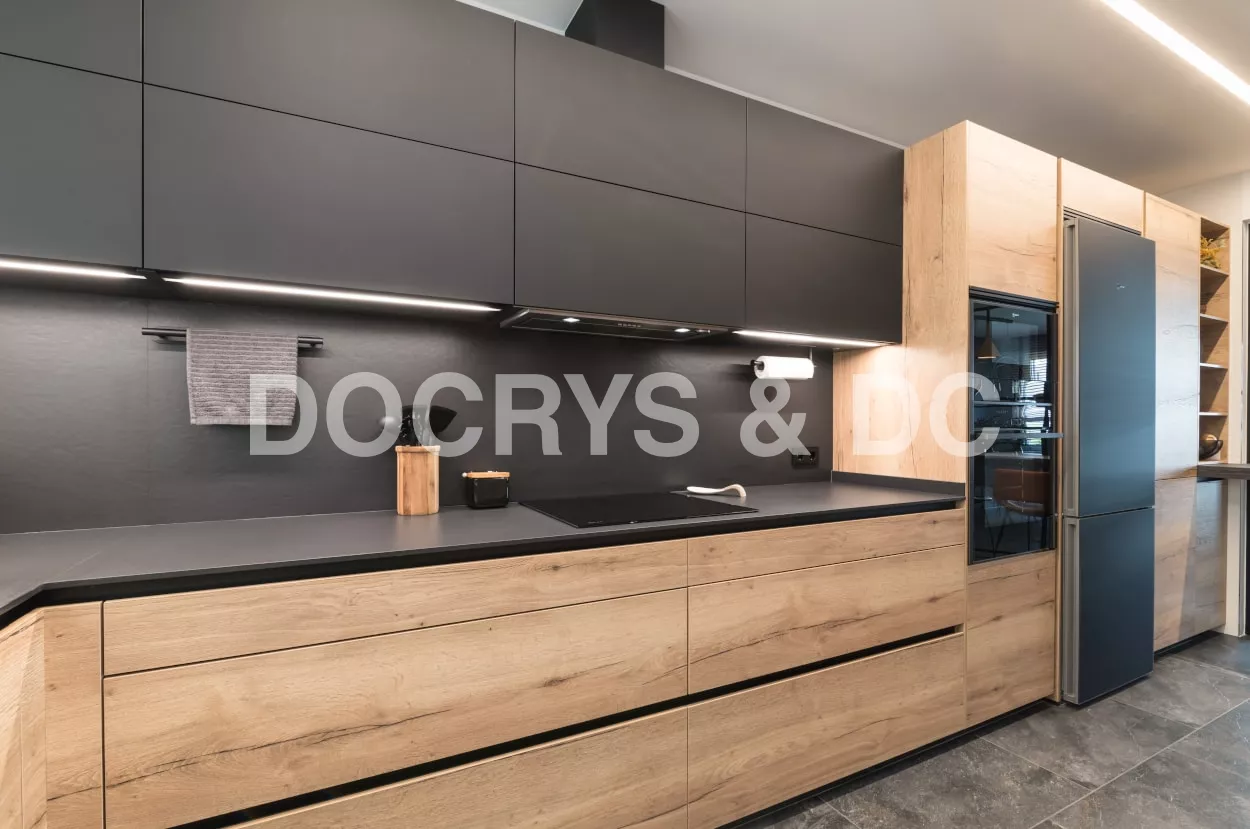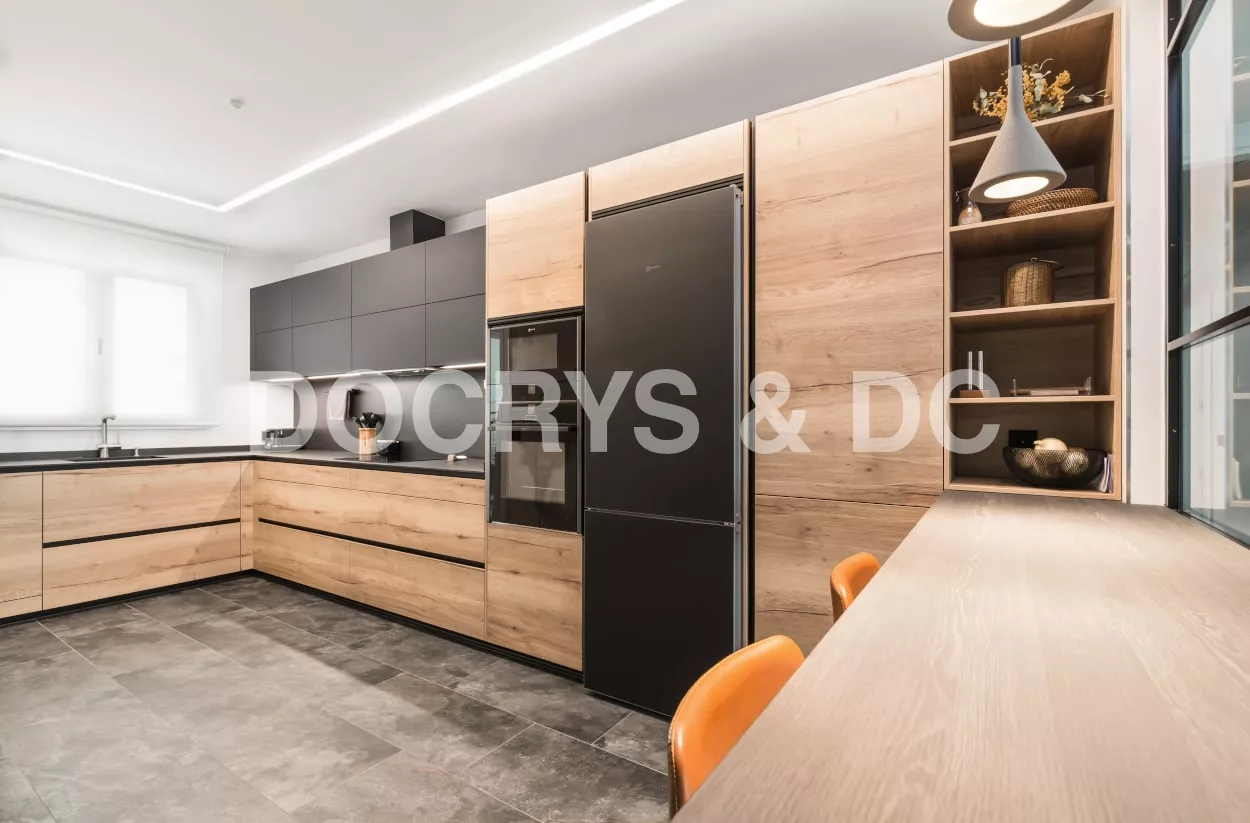 En primer lugar, decidimos abrir la cocina al salón, creando un espacio semiabierto pero siempre conectado a través de unas puertas correderas de cristal y aluminio negro.
