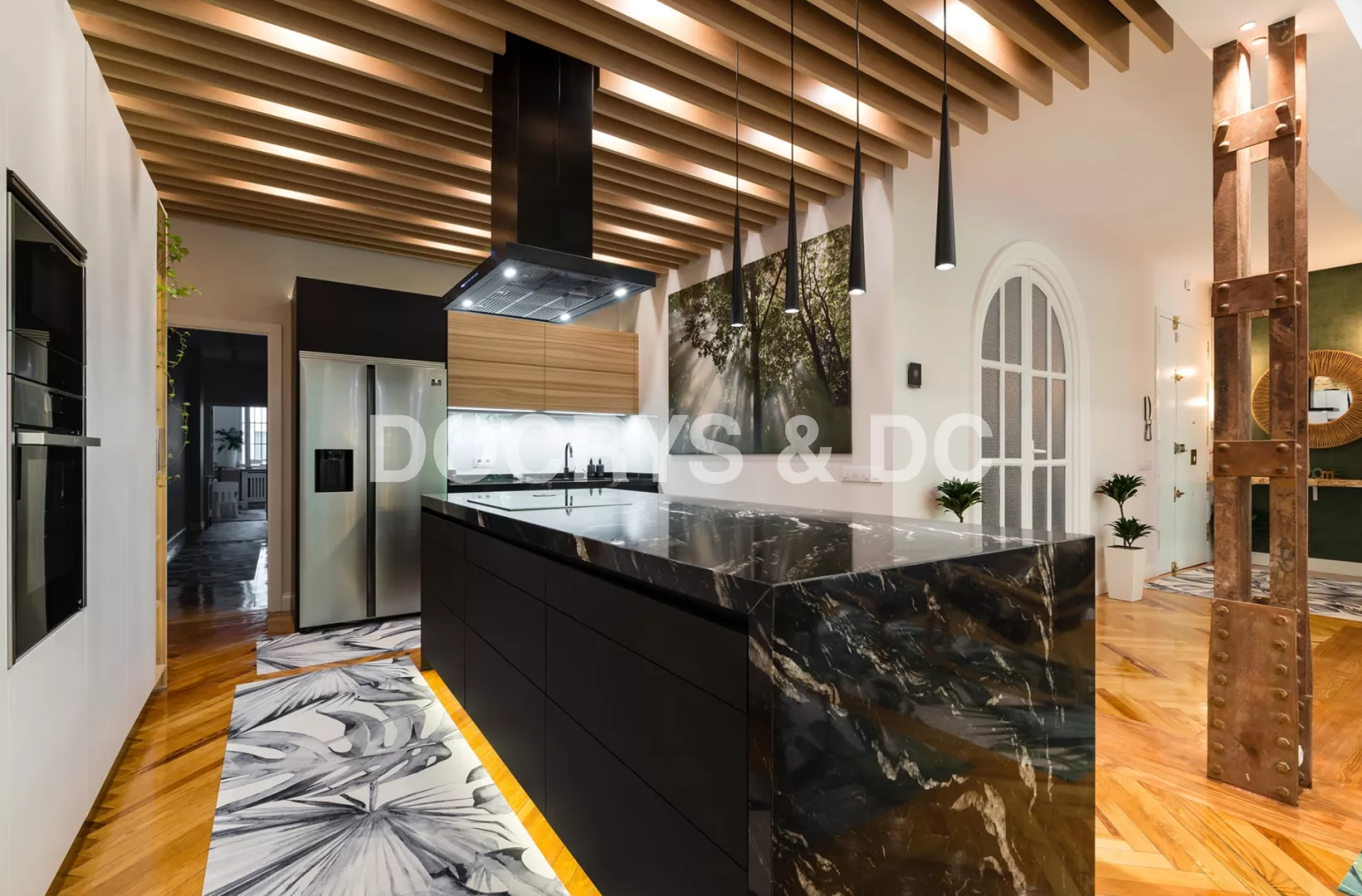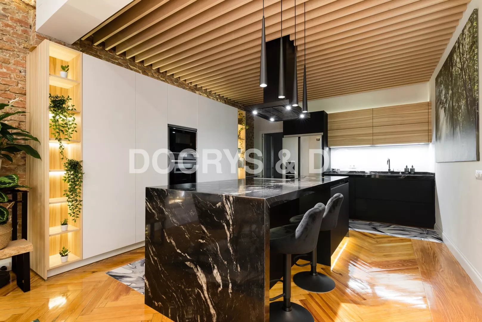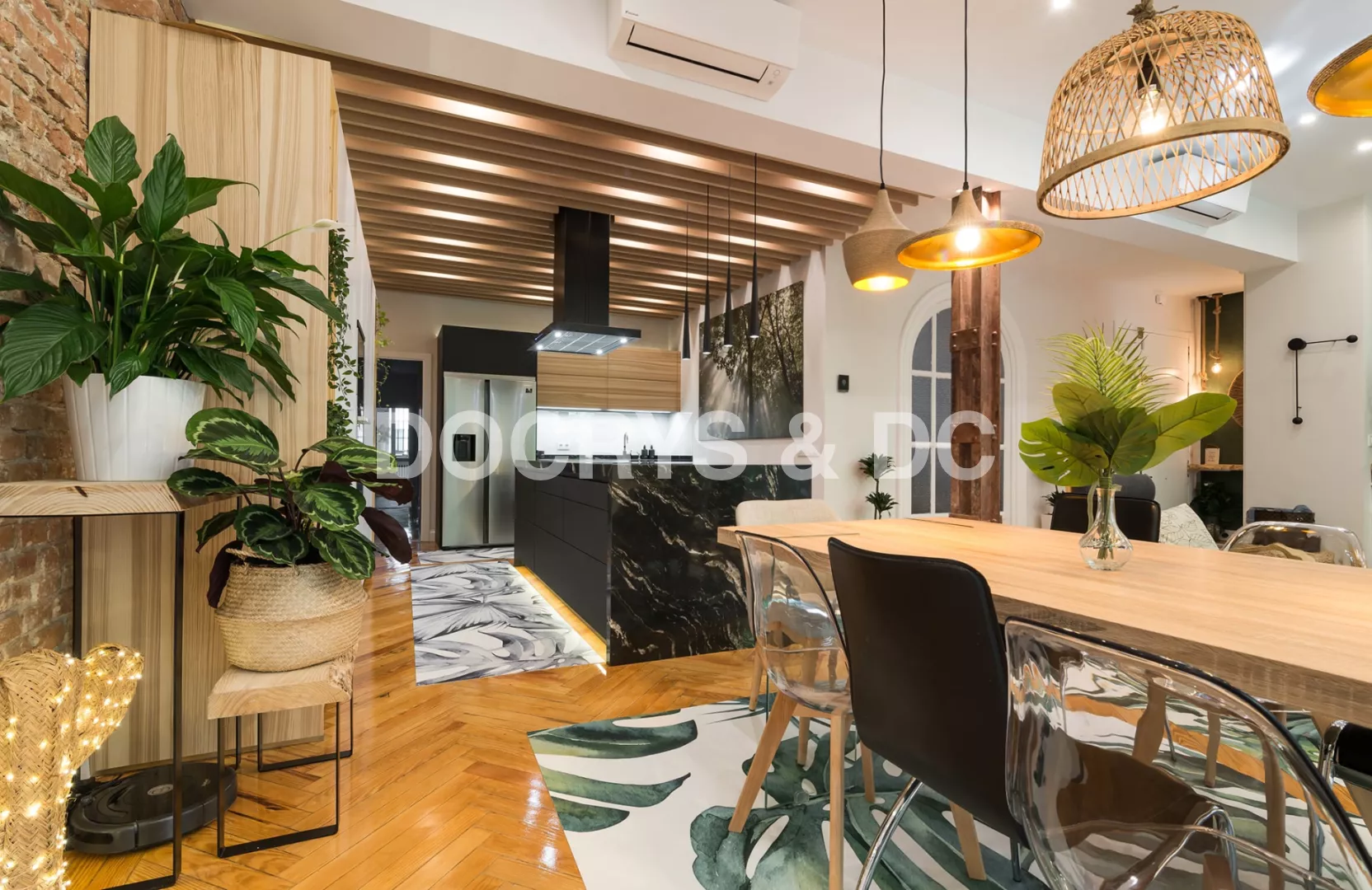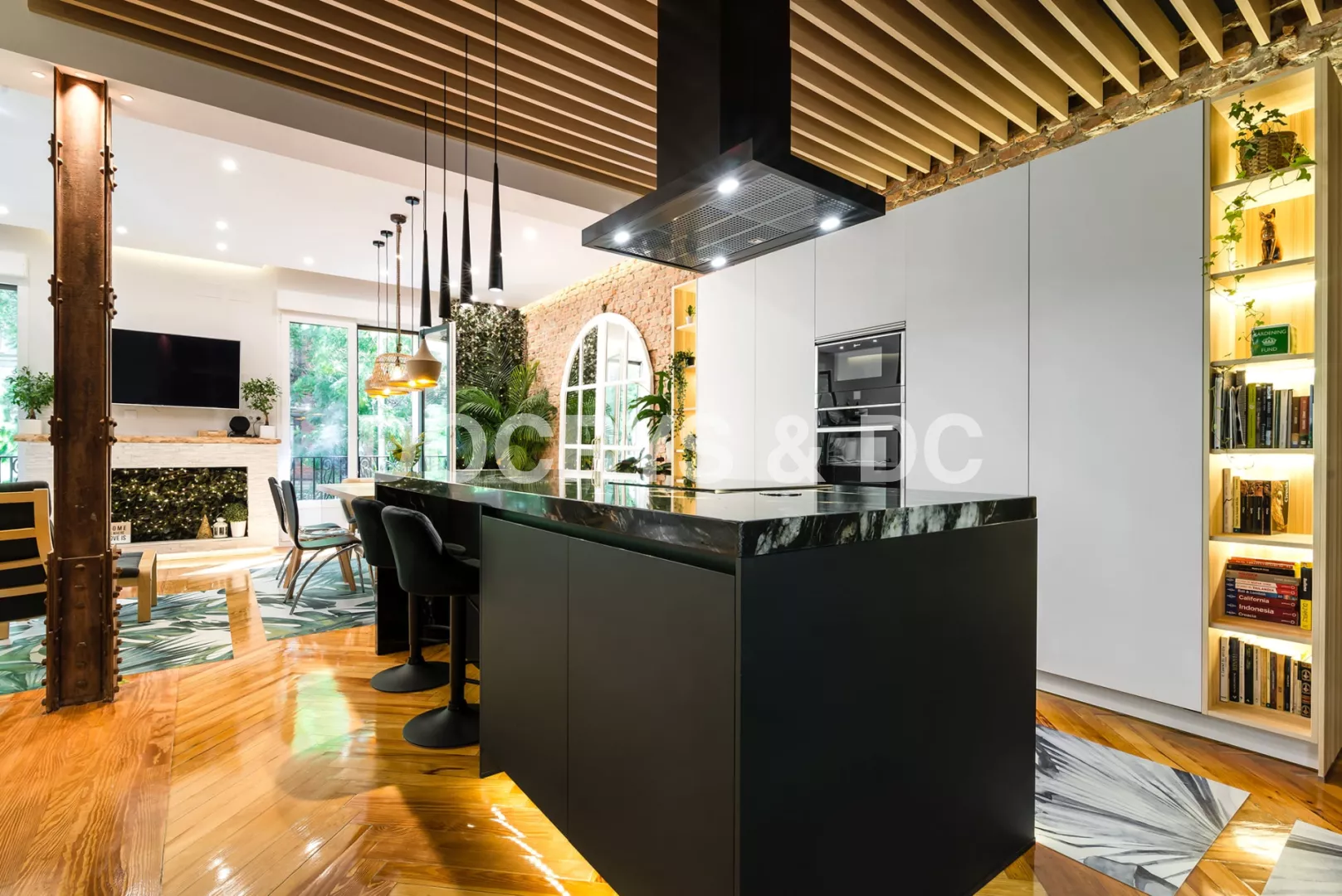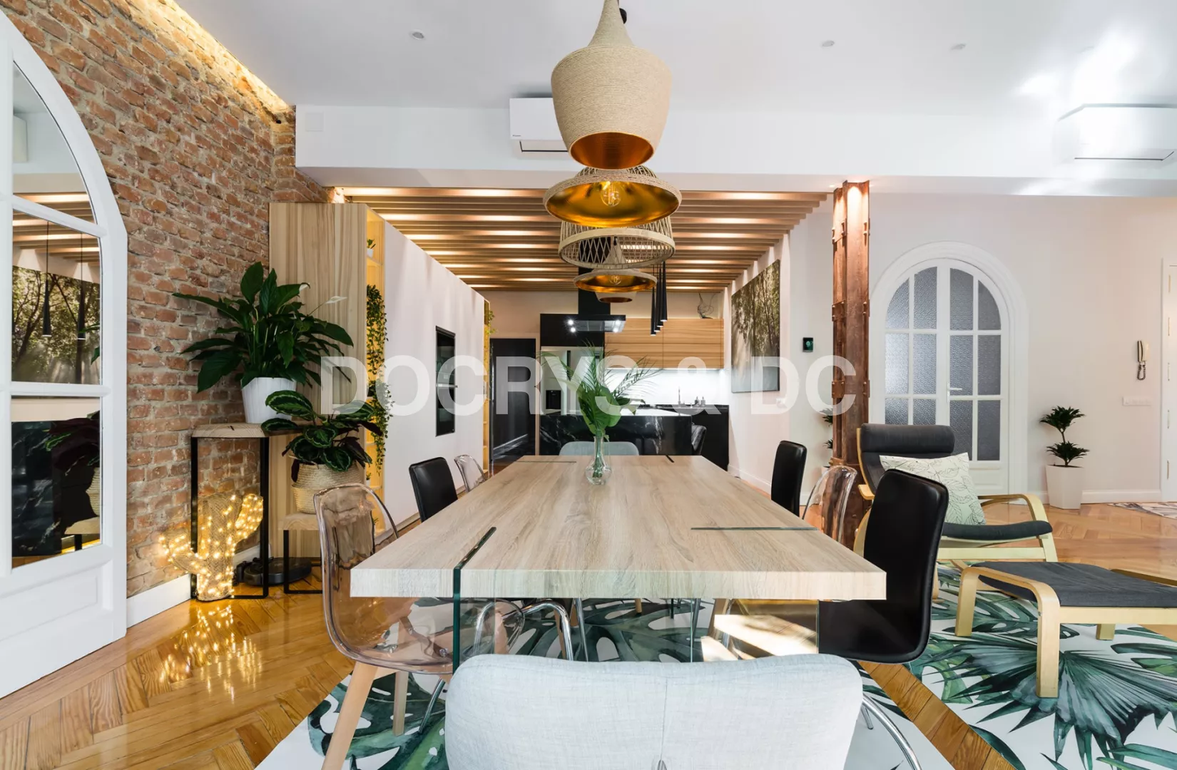 La cocina como el núcleo central del proyecto totalmente integrada en el salón, un espacio amplio que será el protagonista de la casa. Se respetan elementos singulares propios del espacio como las puertas redondeadas originales, que se convierten en espejos decorativos , el ladrillo en bruto o las vigas vistas.