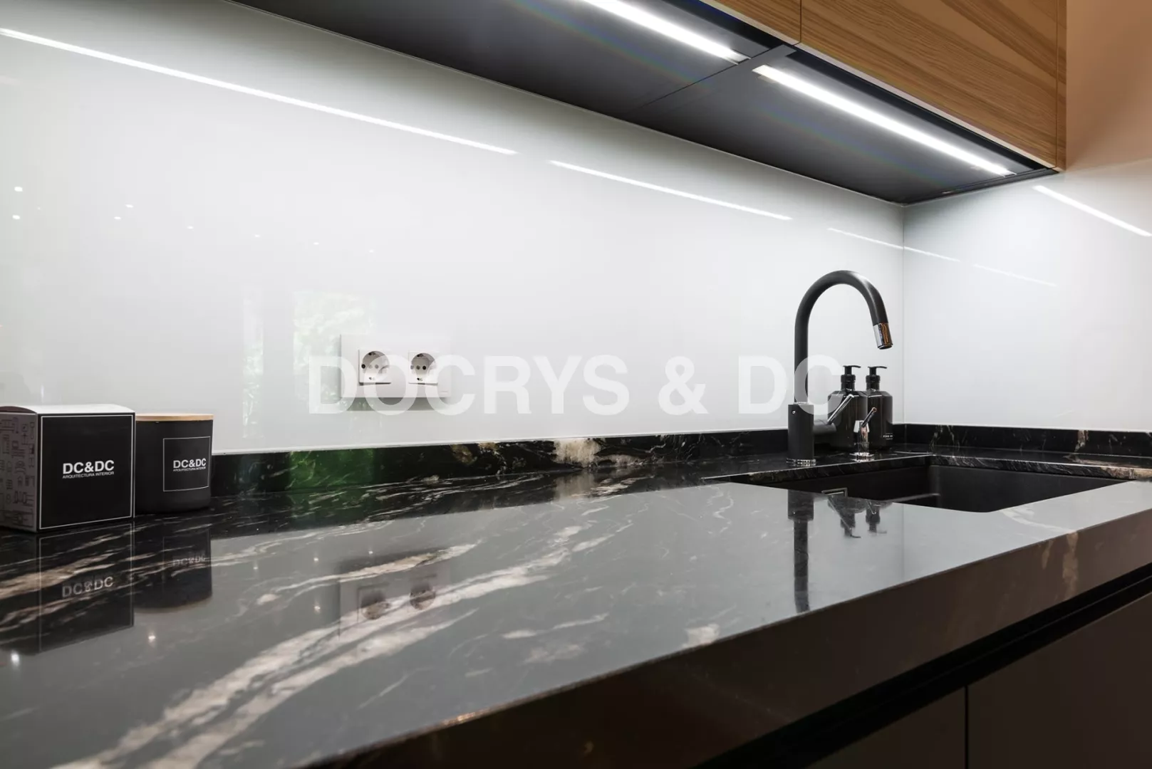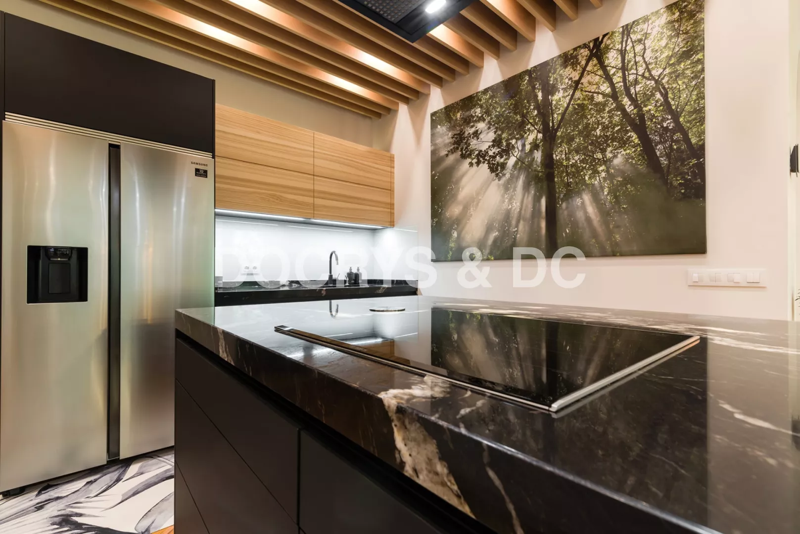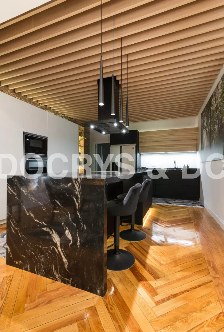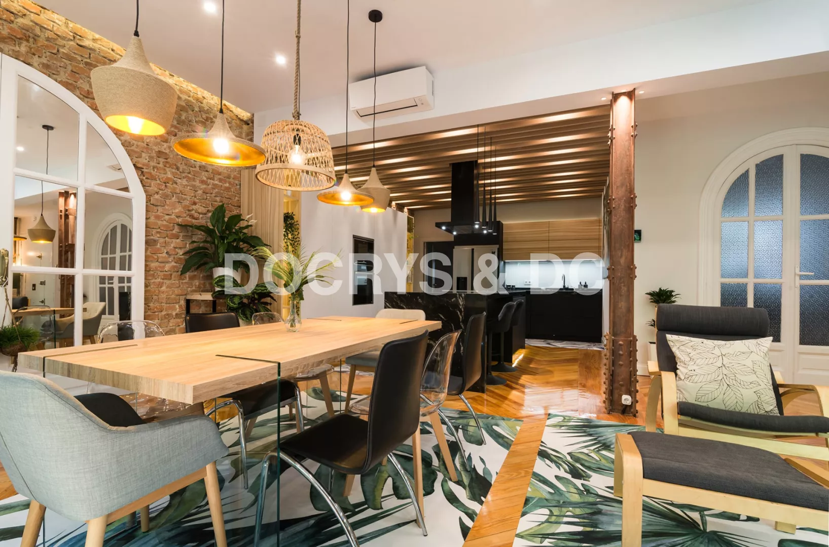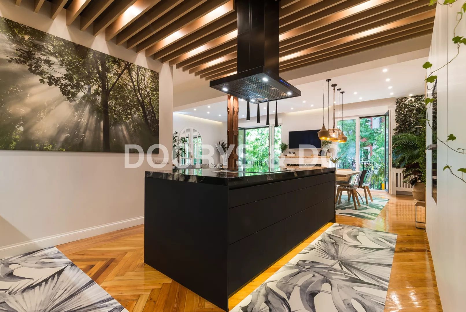La cocina como el núcleo central del proyecto totalmente integrada en el salón, un espacio amplio que será el protagonista de la casa. Se respetan elementos singulares propios del espacio como las puertas redondeadas originales, que se convierten en espejos decorativos , el ladrillo en bruto o las vigas vistas.
