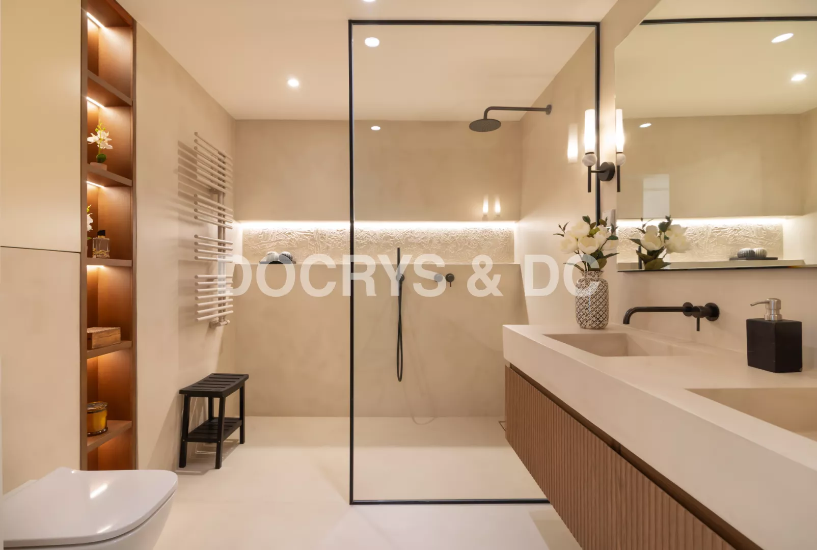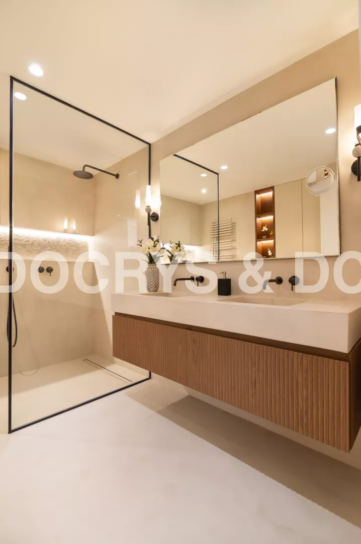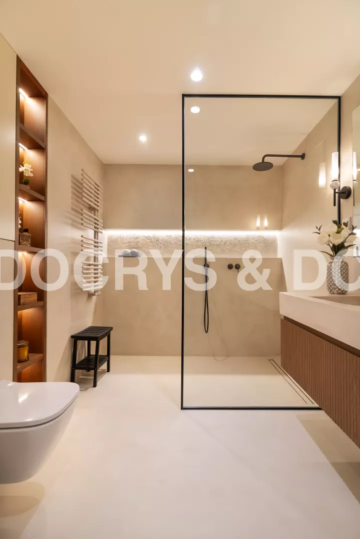 La zona de ducha abierta y delimitada por un discreto panel de vidrio como mámpara con perfilería negra, refuerza la sensación de amplitud. La iluminación indirecta empotrada en la pared añade profundidad y realza la textura sutil del microcemento, creando un ambiente acogedor y envolvente.