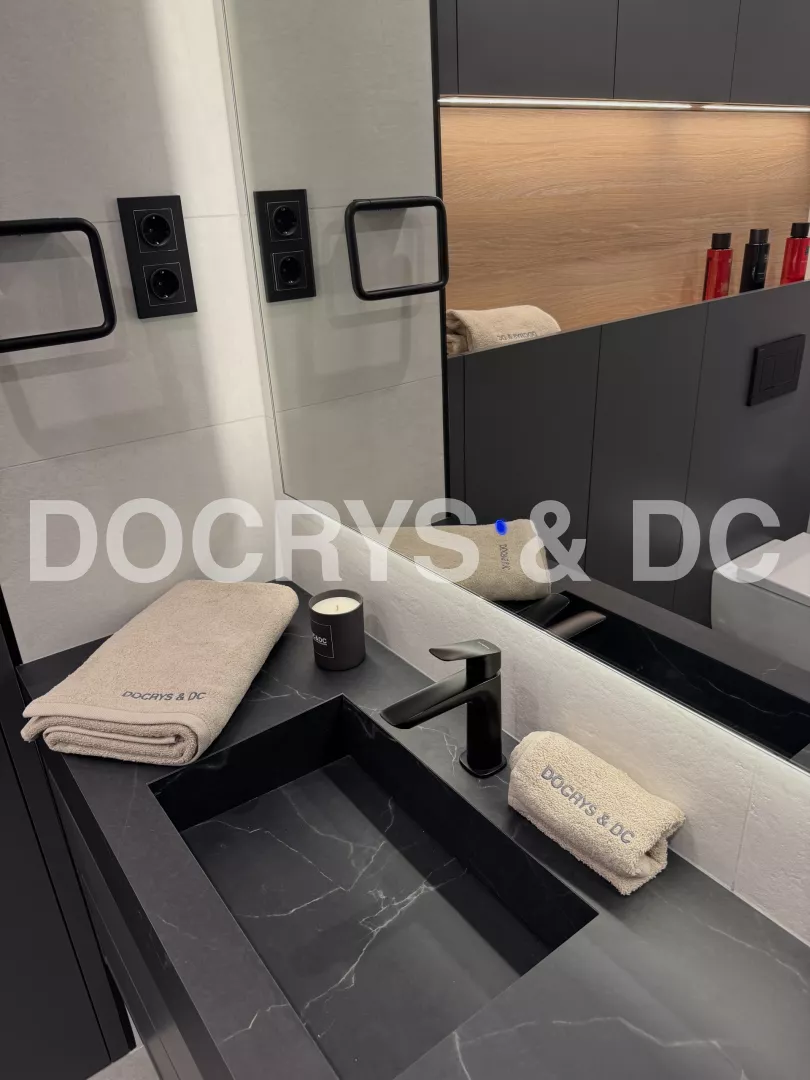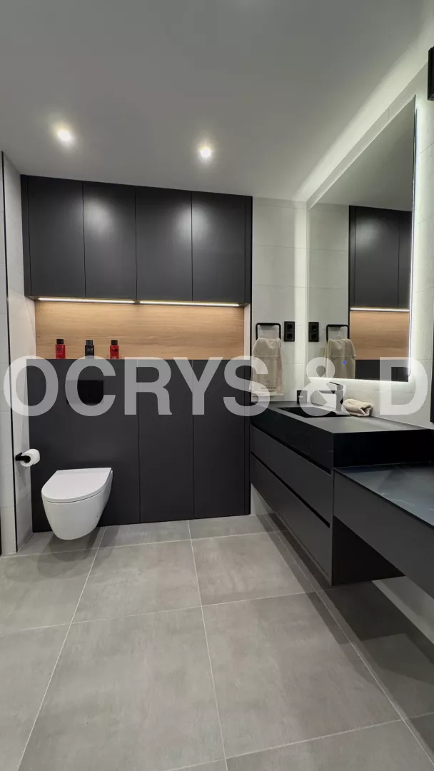 Líneas puras y una paleta cromática atemporal es la base de este proyecto que se construye a partir de una paleta neutra, dominada por tonos grises, negros y matices cálidos de madera. El pavimento porcelánico de gran formato aporta continuidad visual y refuerza la sensación de amplitud, mientras que los revestimientos de la zona de ducha añaden textura sin sobrecargar el conjunto.