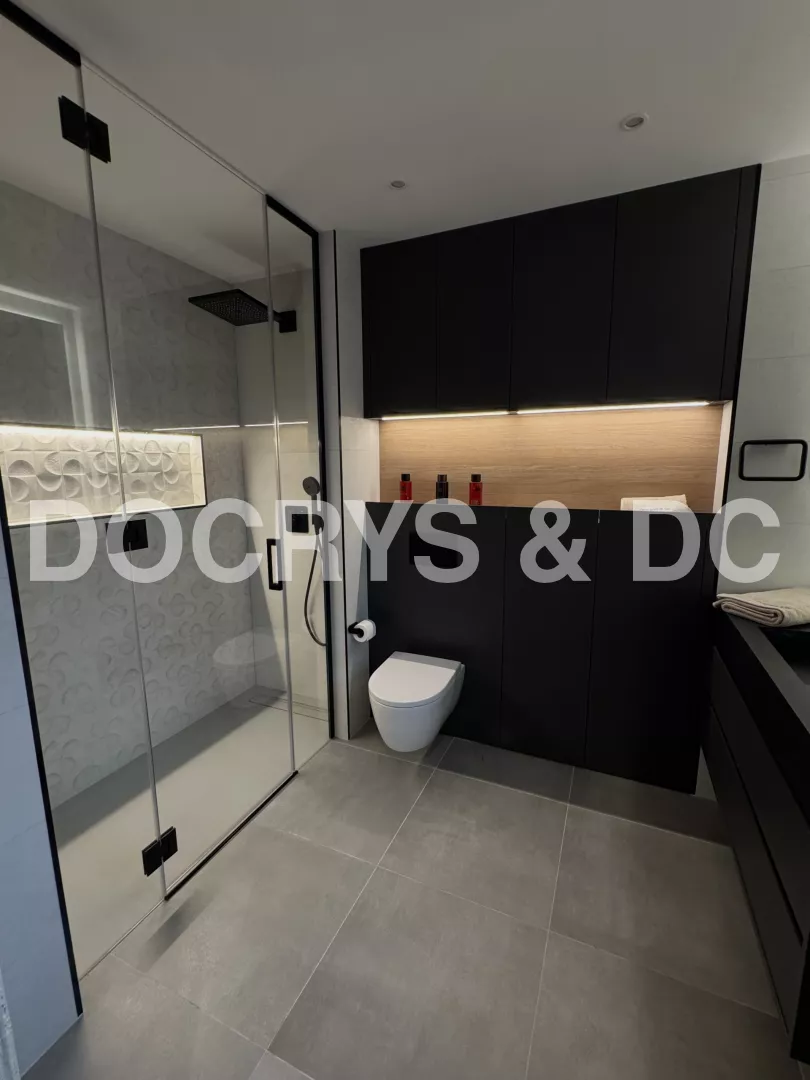 La zona de ducha delimitada por una mampara de vidrio con perfilería negra, se integra de forma natural en el conjunto, manteniendo la ligereza visual y permitiendo que la luz fluya sin interrupciones. El rociador superir empotrado y la grifería en negro refuerzan la estética contemporánea, aportando un punto técnico y sofisticado.