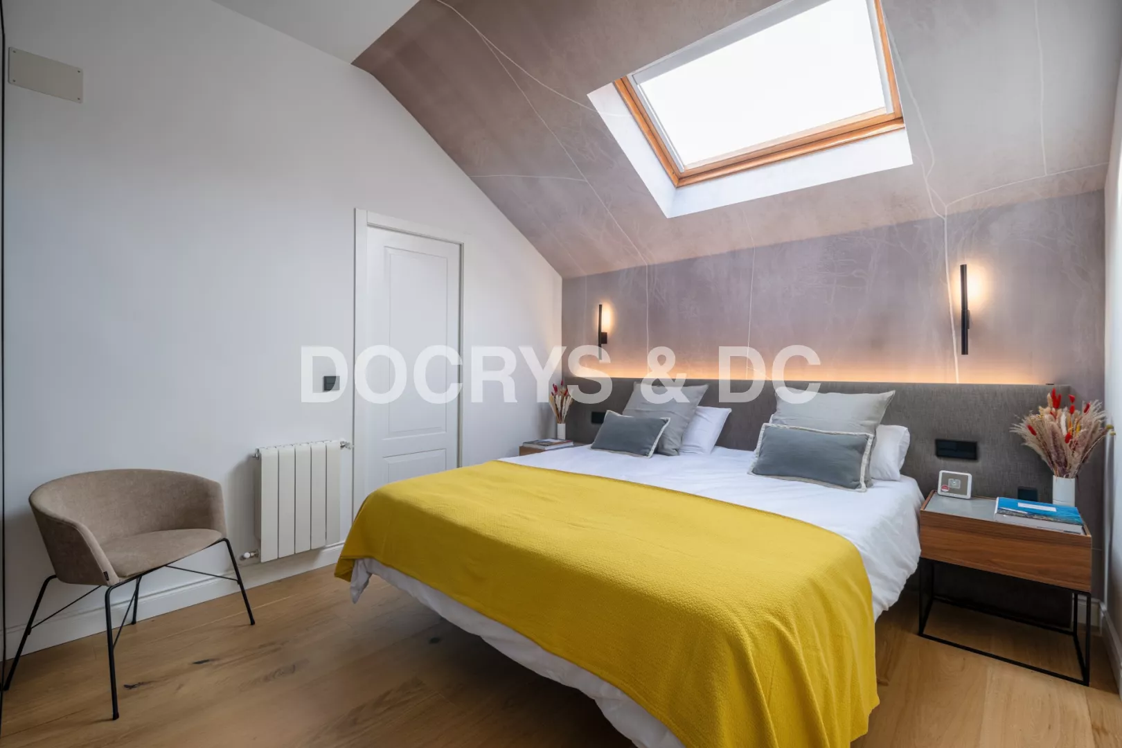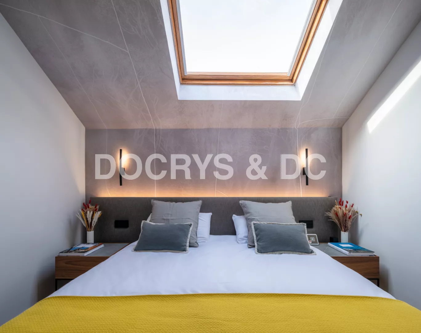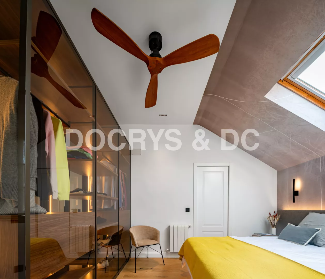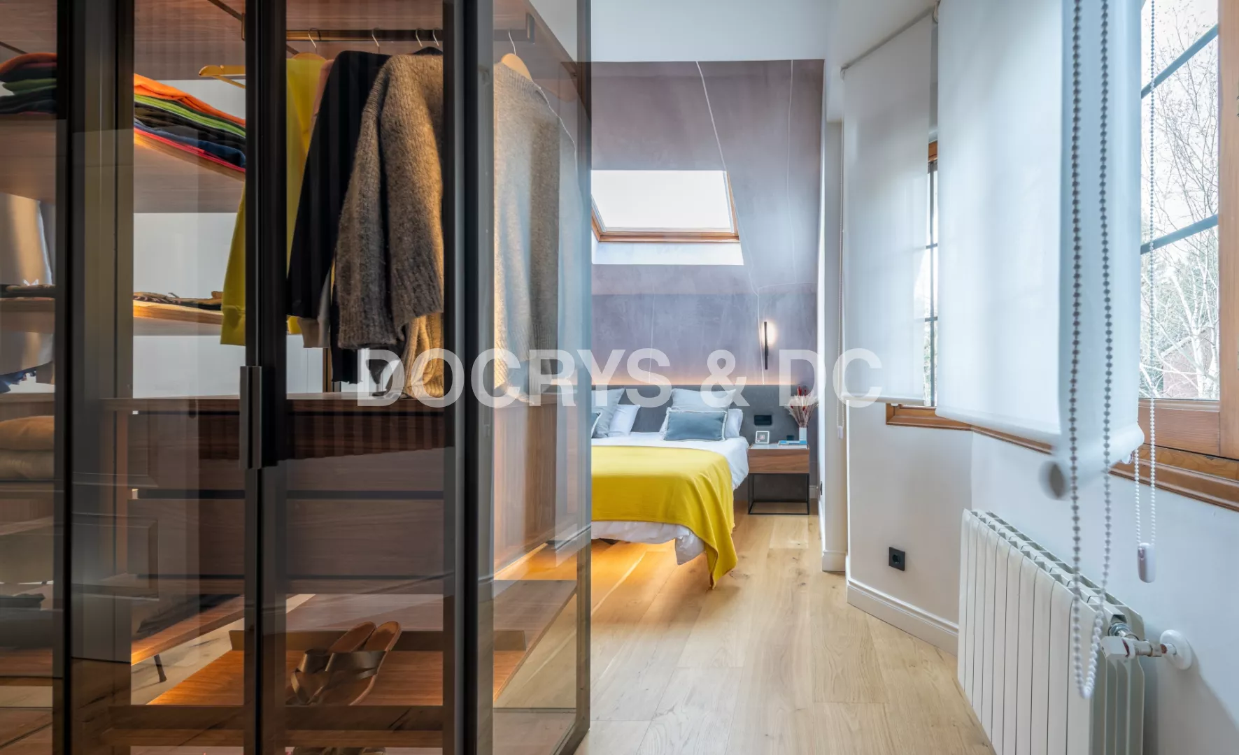 Este dormitorio se concibe como un refugio tranquilo, donde el descanso y la funcionalidad conviven en equilibrio. La luz natural, que entra de forma generosa a través del lucernario, baña el espacio y realza una paleta cromática suave y envolvente, creando una atmósfera serena y acogedora que invita a desconectar.