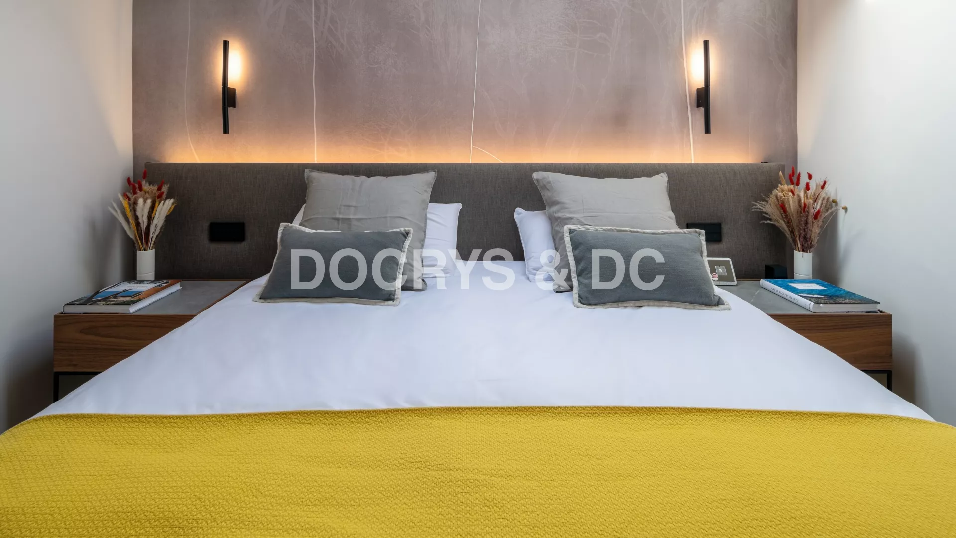 La zona de descanso se define por líneas limpias y una composición cuidada. El cabecero tapizado aporta confort visual y acústico, mientras que la iluminación integrada genera una luz cálida y envolvente que acompaña sin imponerse. Los tonos neutros se combinan con toques de color en los textiles, aportando personalidad y dinamismo sin romper la armonía del conjunto.