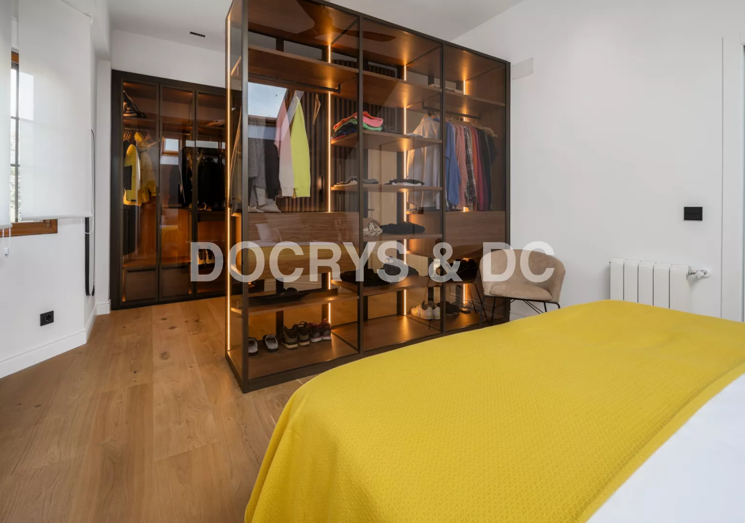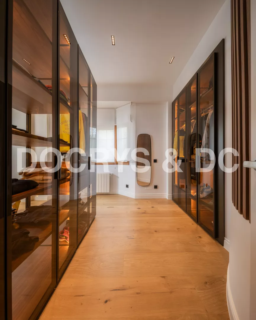 El vestidor se integra como una extensión natural del dormitorio, concebido no solo como un espacio de almacenaje, sino como una pieza clave del proyecto. Los armarios de estructura ligera y frentes acristalados permiten mantener el orden visual, dejando entrever el interior de forma elegante y sofisticada. La madera y la iluminación interior aportan calidez y convierten el vestidor en un espacio funcional y estéticamente cuidado.