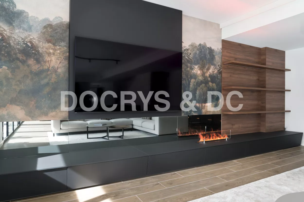 En este proyecto se han combinado diferentes elementos y texturas para lograr un salón atípico. Empezando por el mueble de TV de la colección living de Santos, un mueble de pared a pared del salón, elegante y sutil con muchísimo almacenaje disponible y una chimenea de vapor incorporada al mueble.