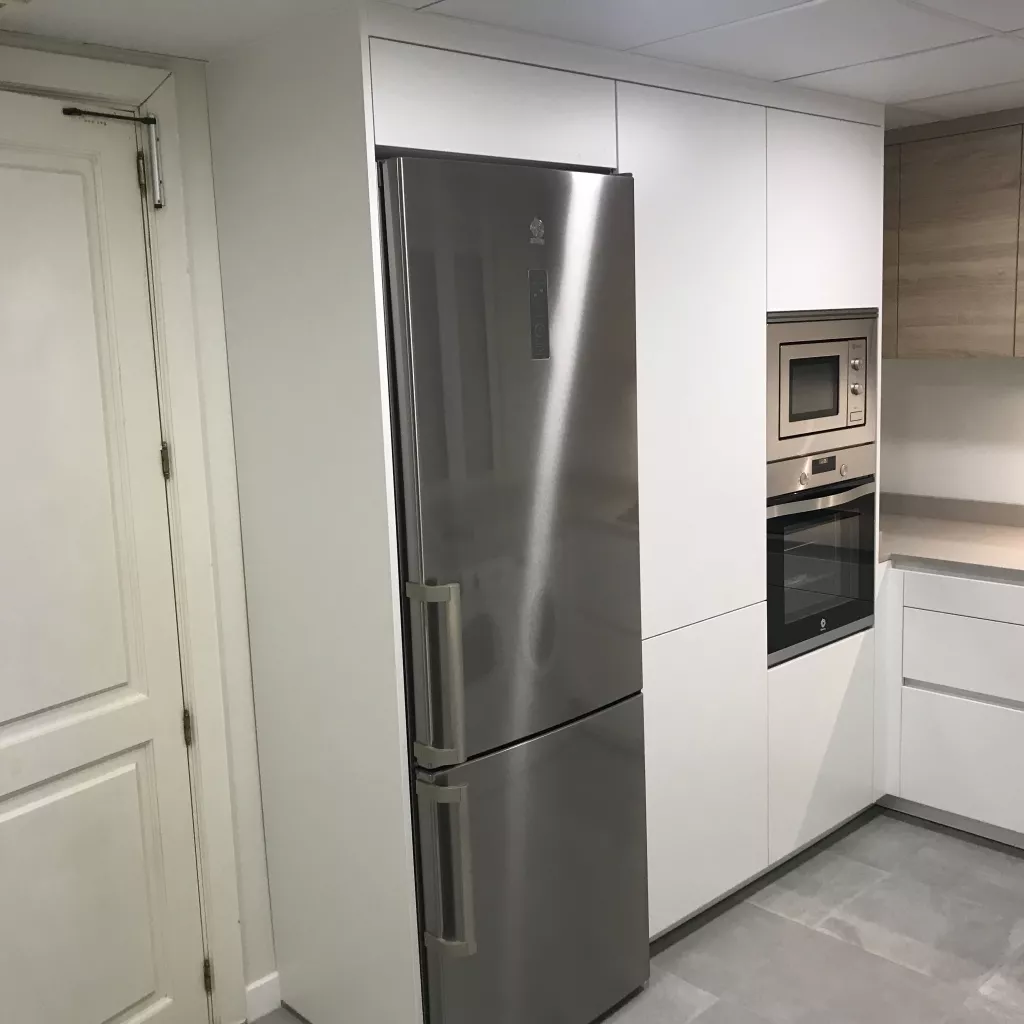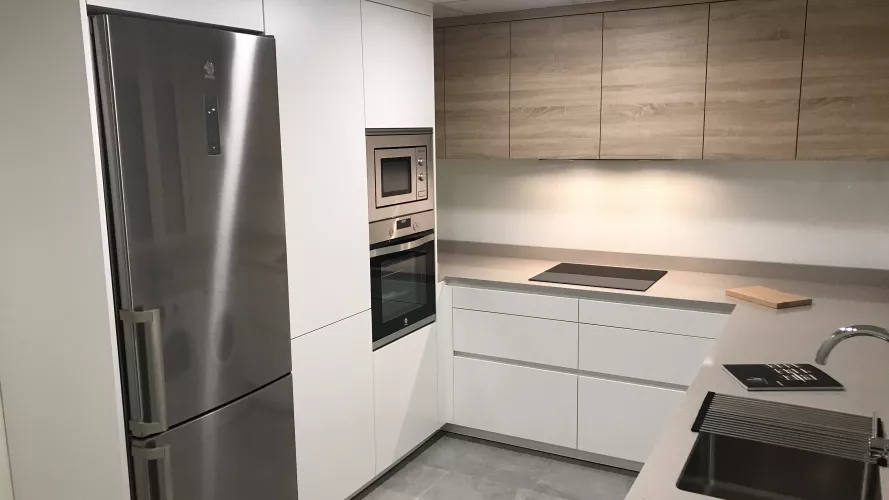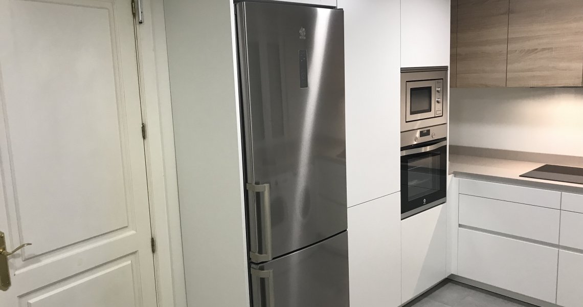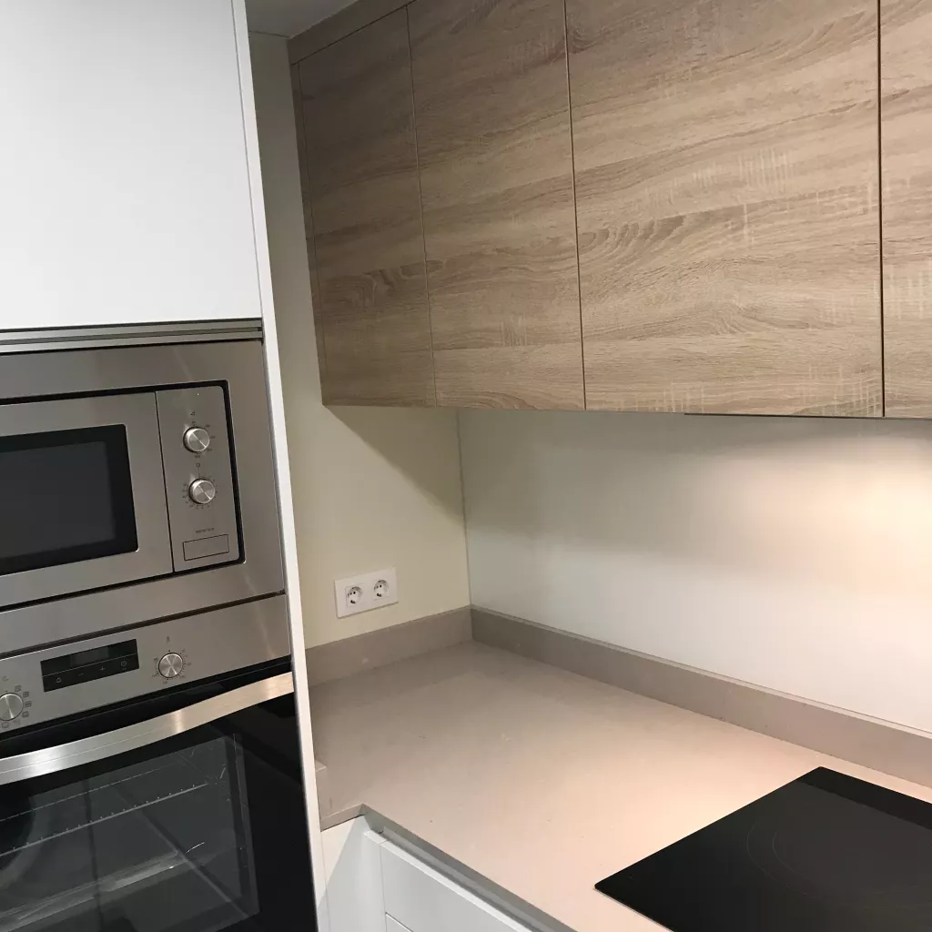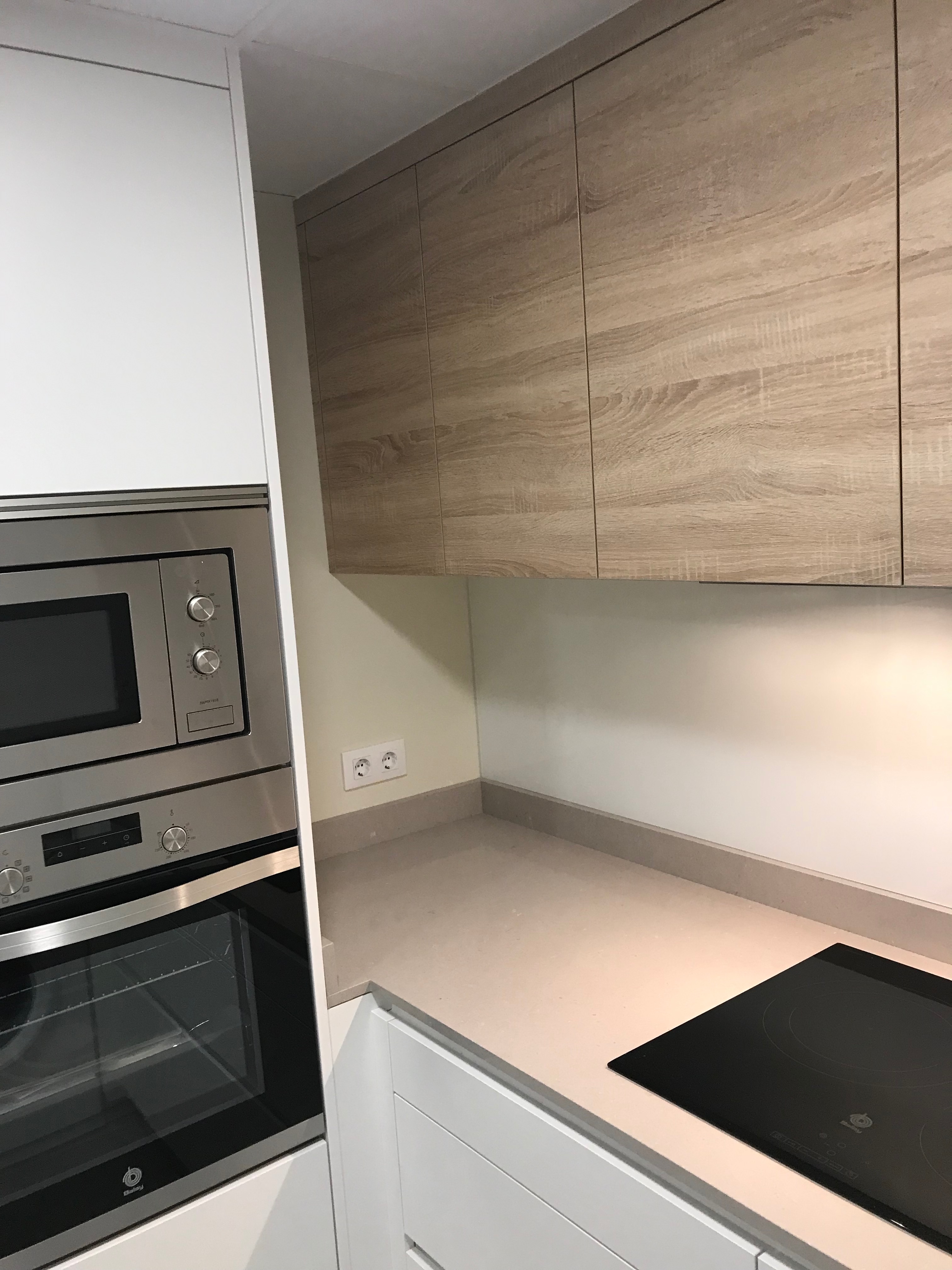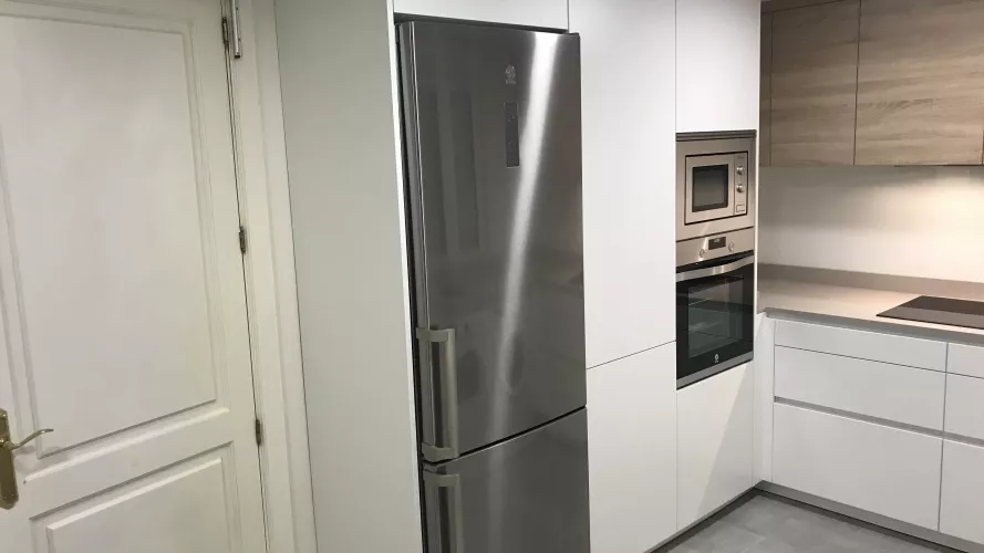 ¡Incluso en los espacios reducidos se puede hacer magia si el mobiliario y los profesionales te acompañan! En este proyecto de renovación de cocina en Madrid hemos apostado por los tonos blancos, como hacemos generalmente, ya que aumentan la amplitud visual del ambiente, pero los hemos combinado con un marrón frío que es mucho menos "sucio" al ojo. Este tono lo combinamos con la madera, que no tiene una excesiva calidez. De esta forma, una de las estrellas de la cocina, somo no puede ser de otra manera, es el mobiliario Santos, siempre elegante y con una de las mejores calidades del mercado. Los electrodomésticos Balay, nevera, placa, horno y microondas, agregan el contraste justo y dan al ambiente un toque moderno y funcional. Los interioristas de nuestro estudio de diseño apostaron por un equilibrio en cuanto a colores y materiales, dejando un ambiente lo más "desnudo" posible para que los inquilinos tengan libertad a la hora de decorar en el futuro el ambiente según sus necesidades y deseos. Los materiales utilizados en este proyecto de cocina son los siguientes: - MODELO: LINE 13 EN BAJOS ALTOS APERTURA LATERAL COLUMNAS PUSCH - MATERIAL: ESTRATIFICADO - ACABADO: BLANCO SEFF COLUMNAS Y BAJOS ROBLE BARRICA HORIZONTAL - ENCIMERA: SILESTONE ROYAL REFF PULIDO.