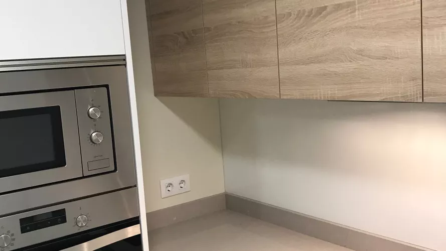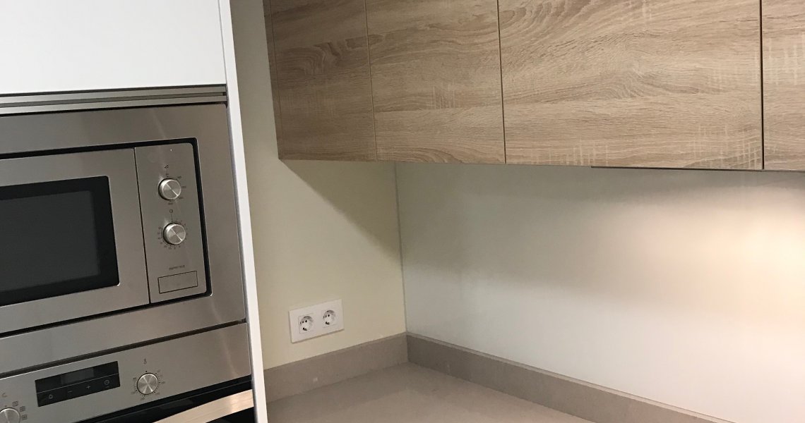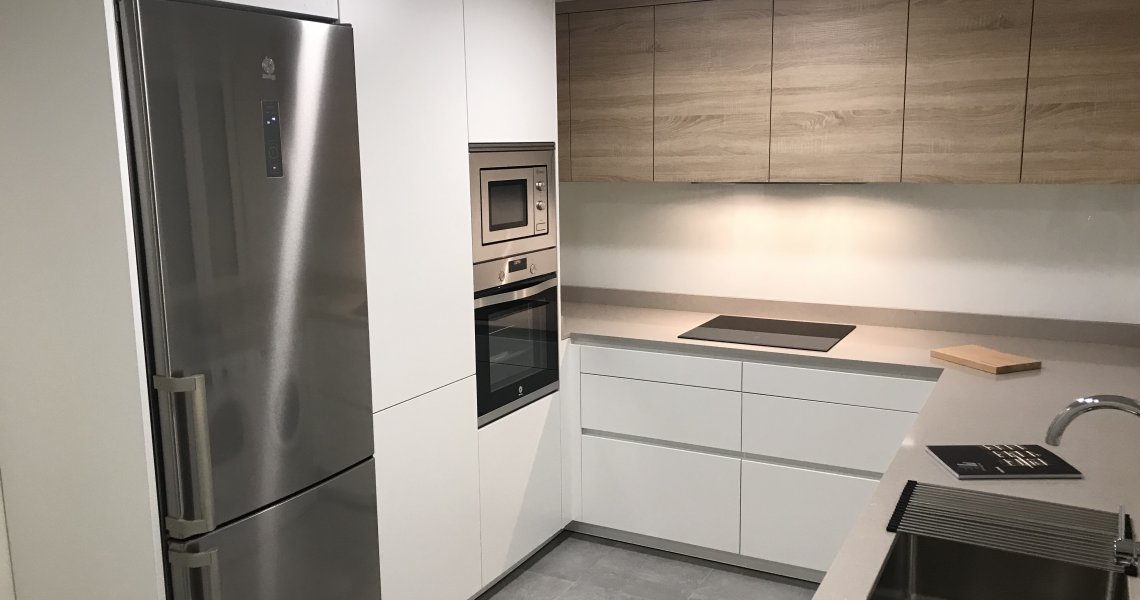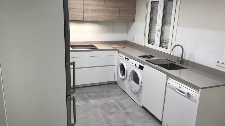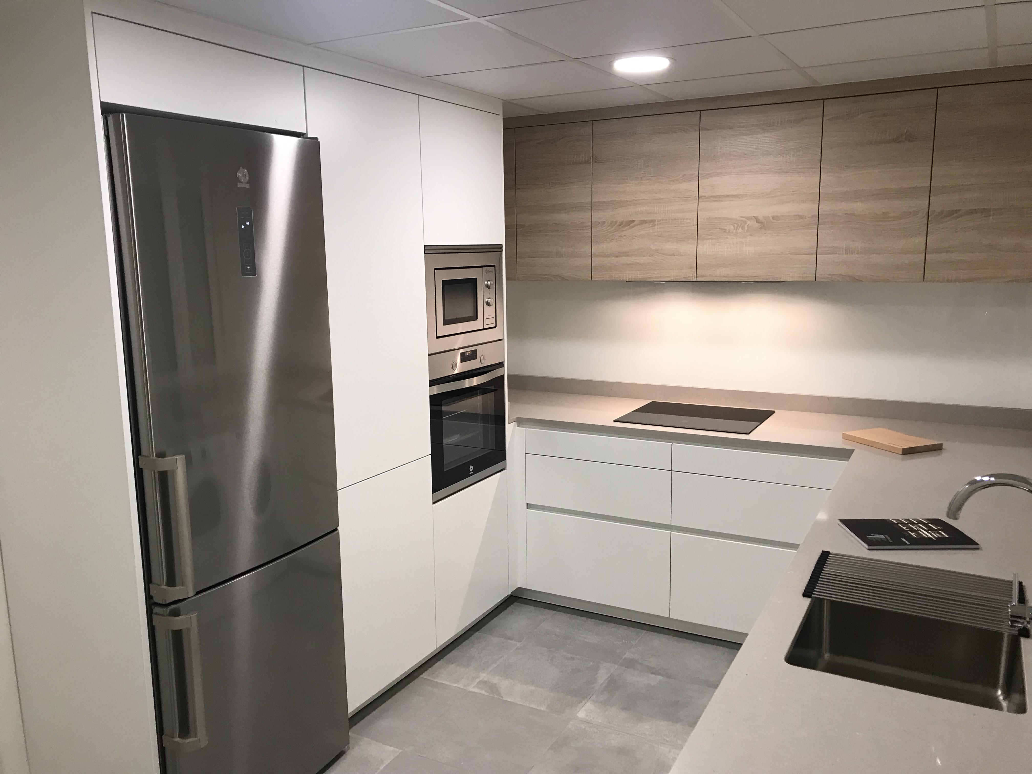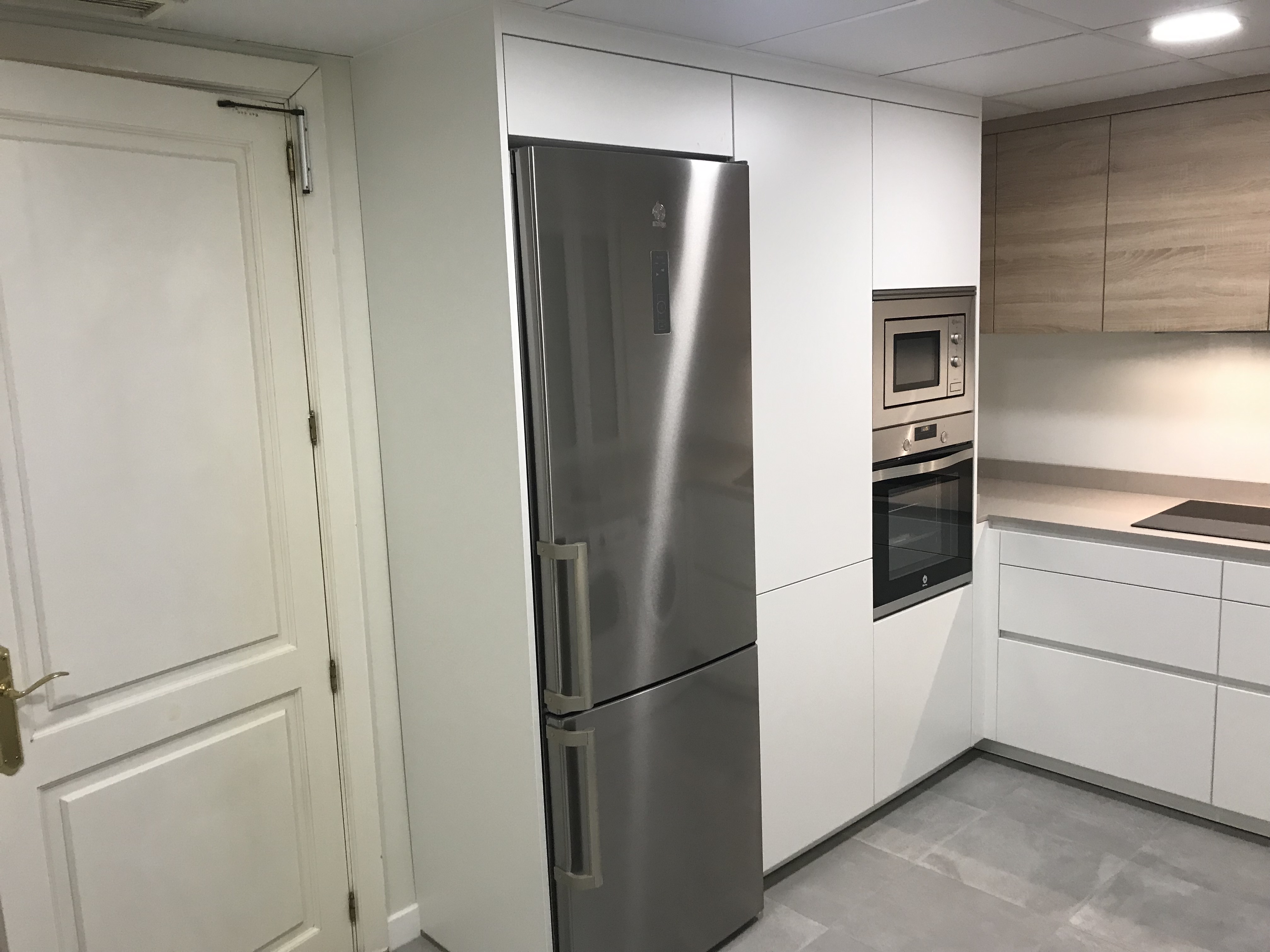¡Incluso en los espacios reducidos se puede hacer magia si el mobiliario y los profesionales te acompañan! En este proyecto de renovación de cocina en Madrid hemos apostado por los tonos blancos, como hacemos generalmente, ya que aumentan la amplitud visual del ambiente, pero los hemos combinado con un marrón frío que es mucho menos "sucio" al ojo. Este tono lo combinamos con la madera, que no tiene una excesiva calidez. De esta forma, una de las estrellas de la cocina, somo no puede ser de otra manera, es el mobiliario Santos, siempre elegante y con una de las mejores calidades del mercado. Los electrodomésticos Balay, nevera, placa, horno y microondas, agregan el contraste justo y dan al ambiente un toque moderno y funcional. Los interioristas de nuestro estudio de diseño apostaron por un equilibrio en cuanto a colores y materiales, dejando un ambiente lo más "desnudo" posible para que los inquilinos tengan libertad a la hora de decorar en el futuro el ambiente según sus necesidades y deseos. Los materiales utilizados en este proyecto de cocina son los siguientes: - MODELO: LINE 13 EN BAJOS ALTOS APERTURA LATERAL COLUMNAS PUSCH - MATERIAL: ESTRATIFICADO - ACABADO: BLANCO SEFF COLUMNAS Y BAJOS ROBLE BARRICA HORIZONTAL - ENCIMERA: SILESTONE ROYAL REFF PULIDO.