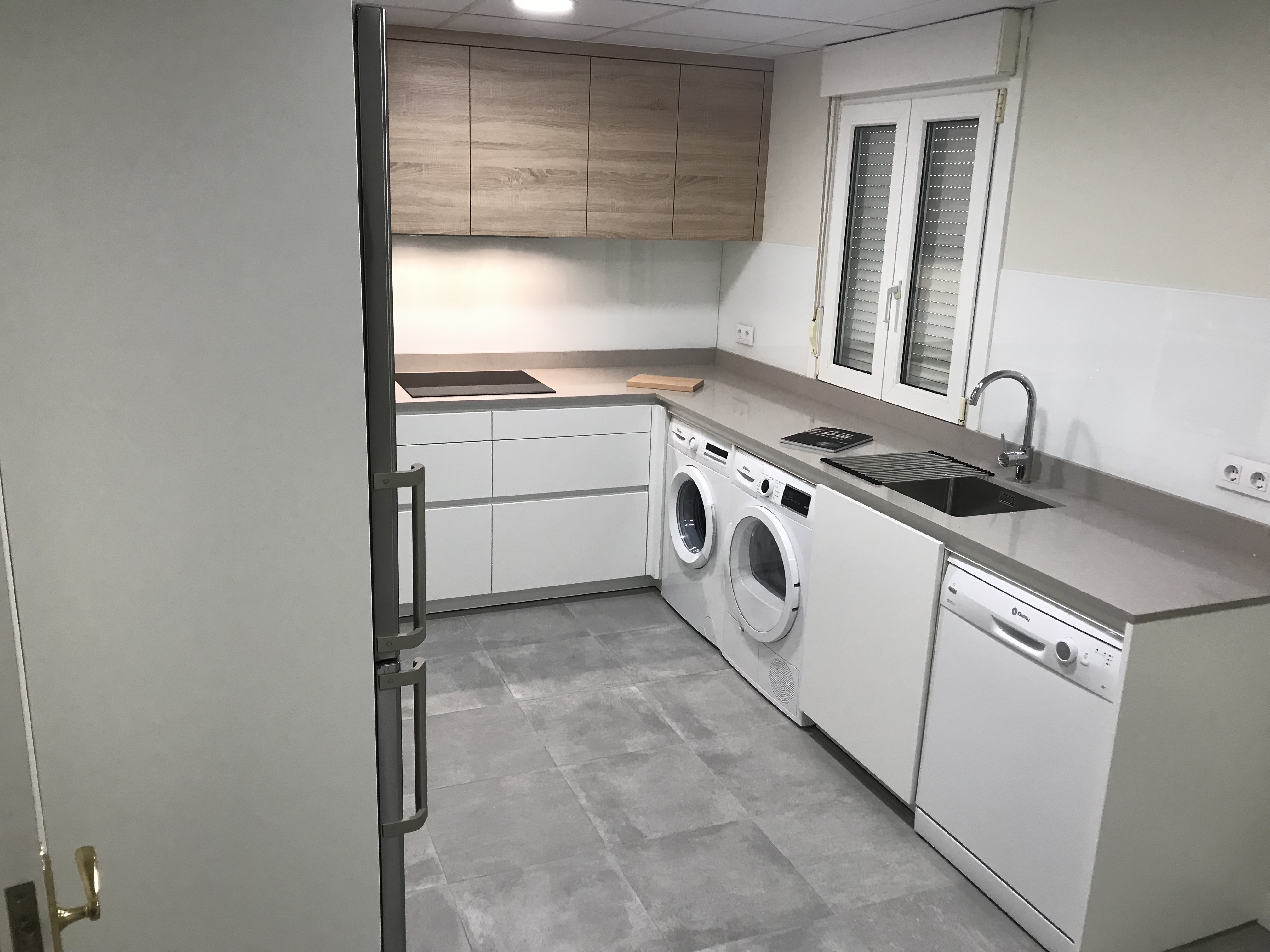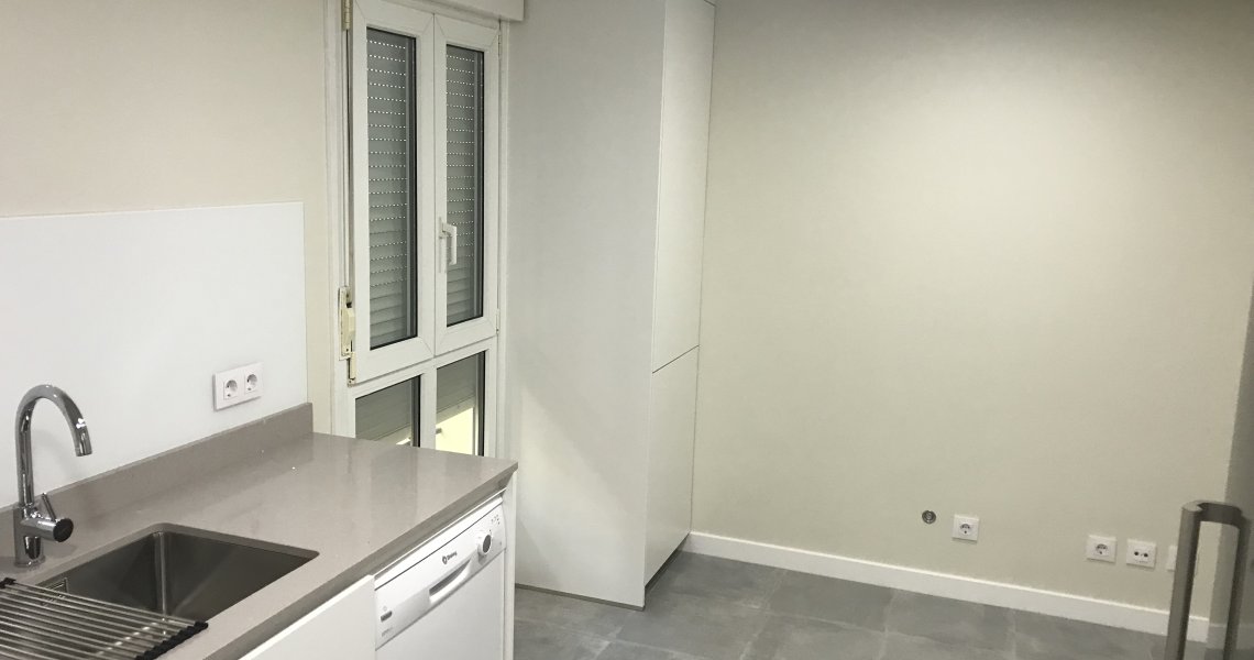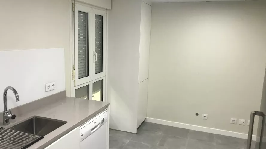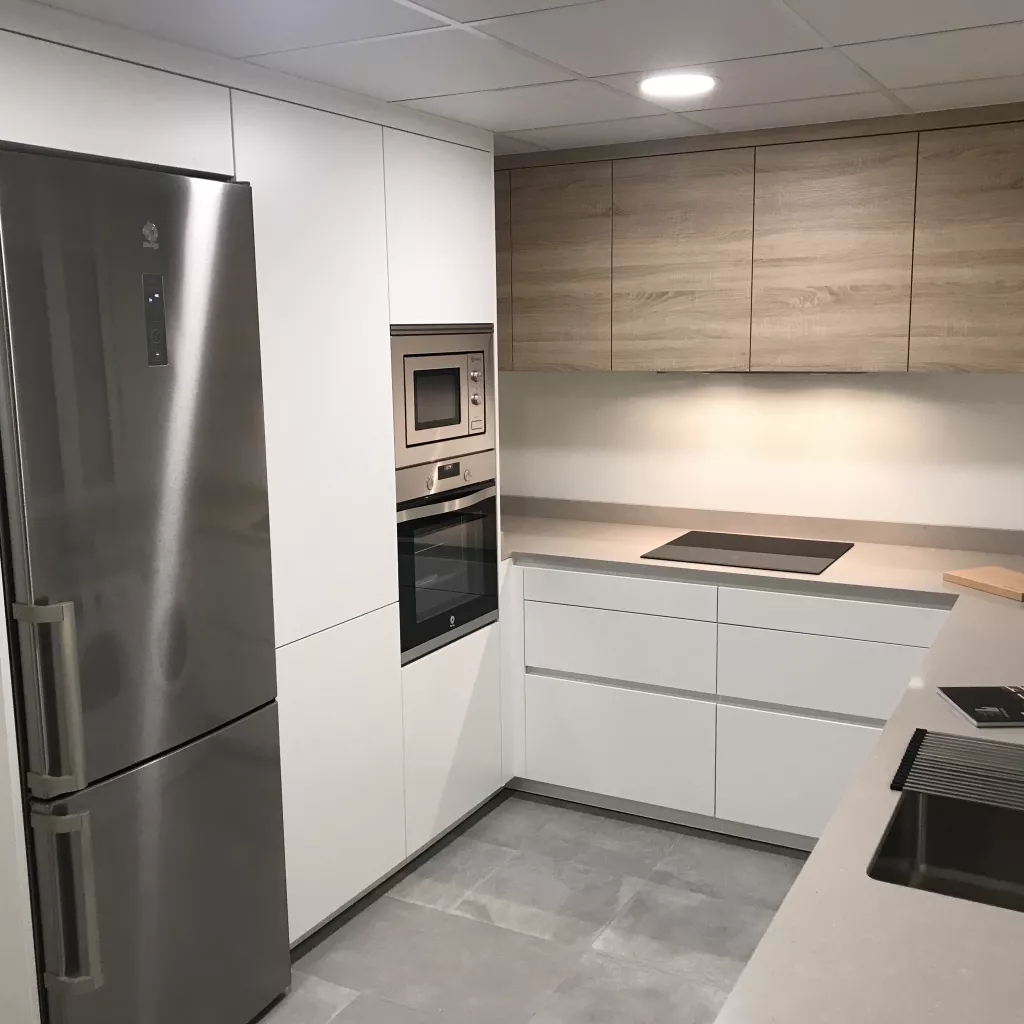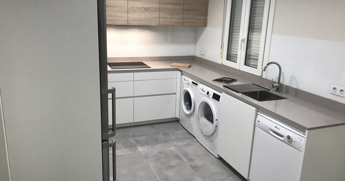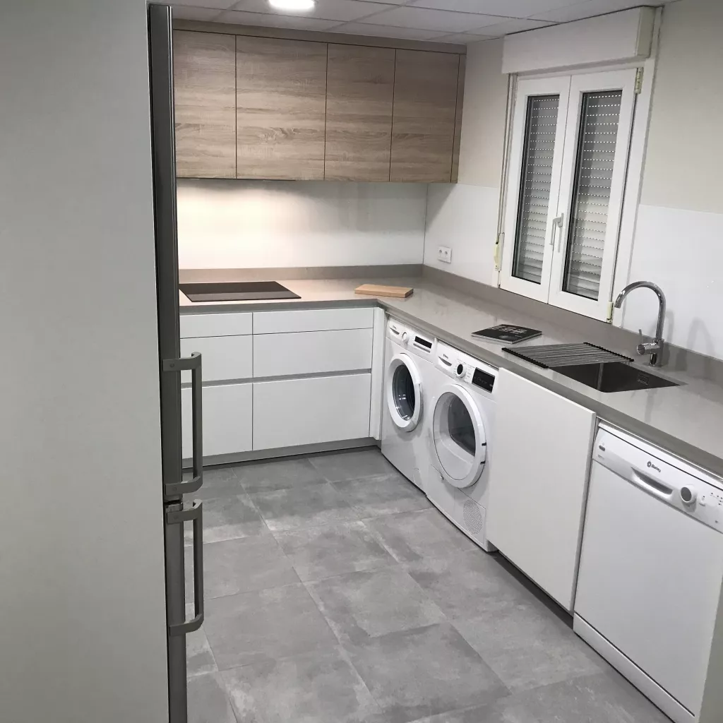 ¡Incluso en los espacios reducidos se puede hacer magia si el mobiliario y los profesionales te acompañan! En este proyecto de renovación de cocina en Madrid hemos apostado por los tonos blancos, como hacemos generalmente, ya que aumentan la amplitud visual del ambiente, pero los hemos combinado con un marrón frío que es mucho menos "sucio" al ojo. Este tono lo combinamos con la madera, que no tiene una excesiva calidez. De esta forma, una de las estrellas de la cocina, somo no puede ser de otra manera, es el mobiliario Santos, siempre elegante y con una de las mejores calidades del mercado. Los electrodomésticos Balay, nevera, placa, horno y microondas, agregan el contraste justo y dan al ambiente un toque moderno y funcional. Los interioristas de nuestro estudio de diseño apostaron por un equilibrio en cuanto a colores y materiales, dejando un ambiente lo más "desnudo" posible para que los inquilinos tengan libertad a la hora de decorar en el futuro el ambiente según sus necesidades y deseos. Los materiales utilizados en este proyecto de cocina son los siguientes: - MODELO: LINE 13 EN BAJOS ALTOS APERTURA LATERAL COLUMNAS PUSCH - MATERIAL: ESTRATIFICADO - ACABADO: BLANCO SEFF COLUMNAS Y BAJOS ROBLE BARRICA HORIZONTAL - ENCIMERA: SILESTONE ROYAL REFF PULIDO.
