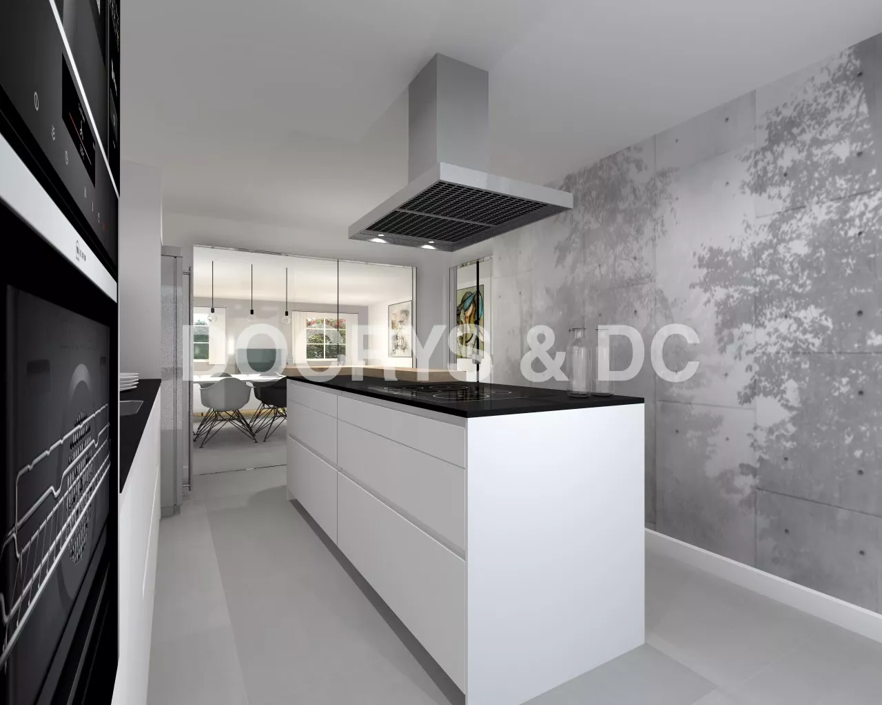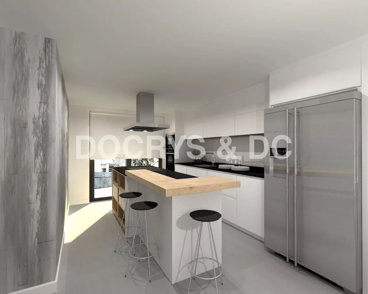 Aravaca | Cocina Santos | Modelo Line E 19 y Ariane 2 Estratificado Color Blanco Seff y Roble Barrica Vertical | Encimera Dekton Sirius