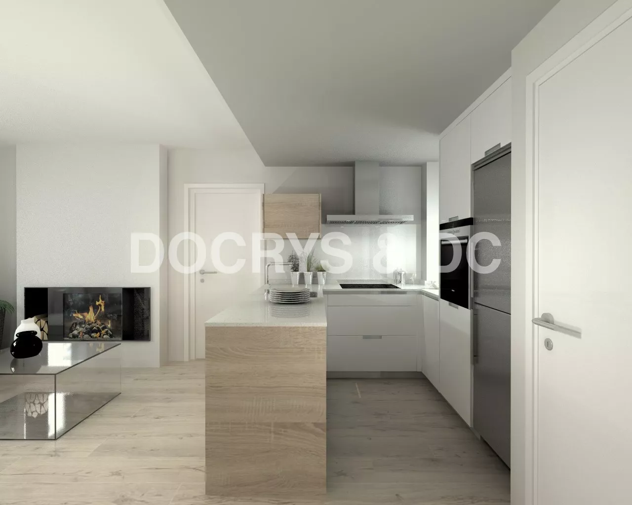 Aravaca | Cocina Santos | Modelo Line Estratificado Blanco y Roble | Encimera Compac Glaciar