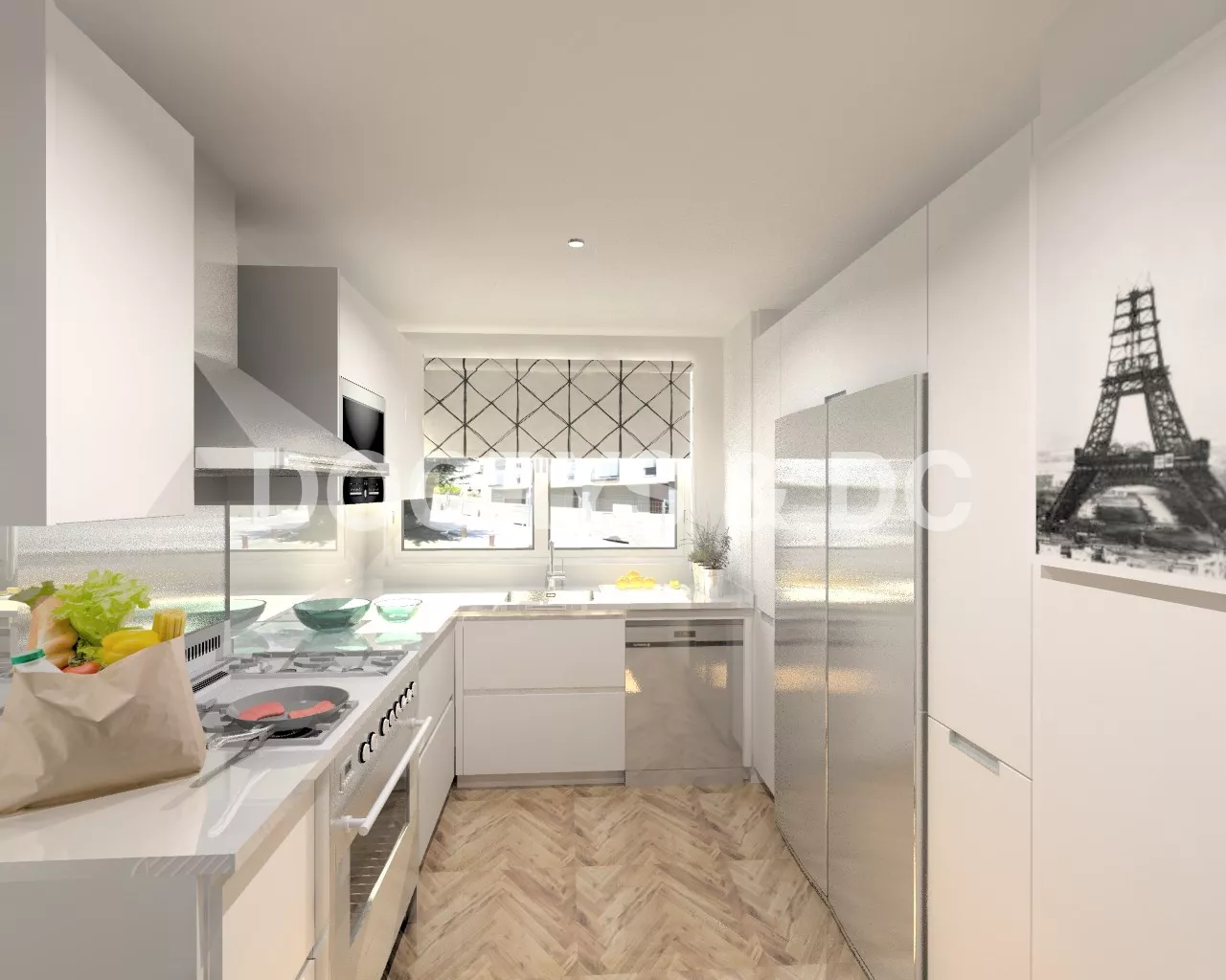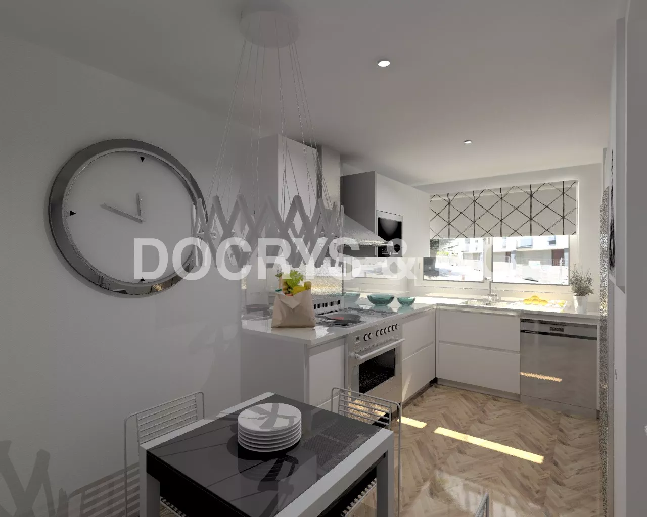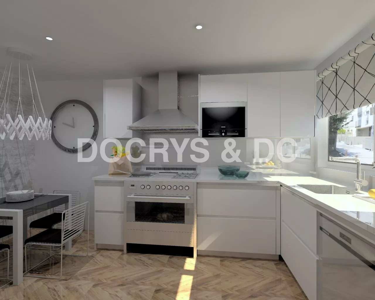 Aravaca | Cocina Santos | Modelo Line Laminado Seda Blanco | Encimera Compac Blanco