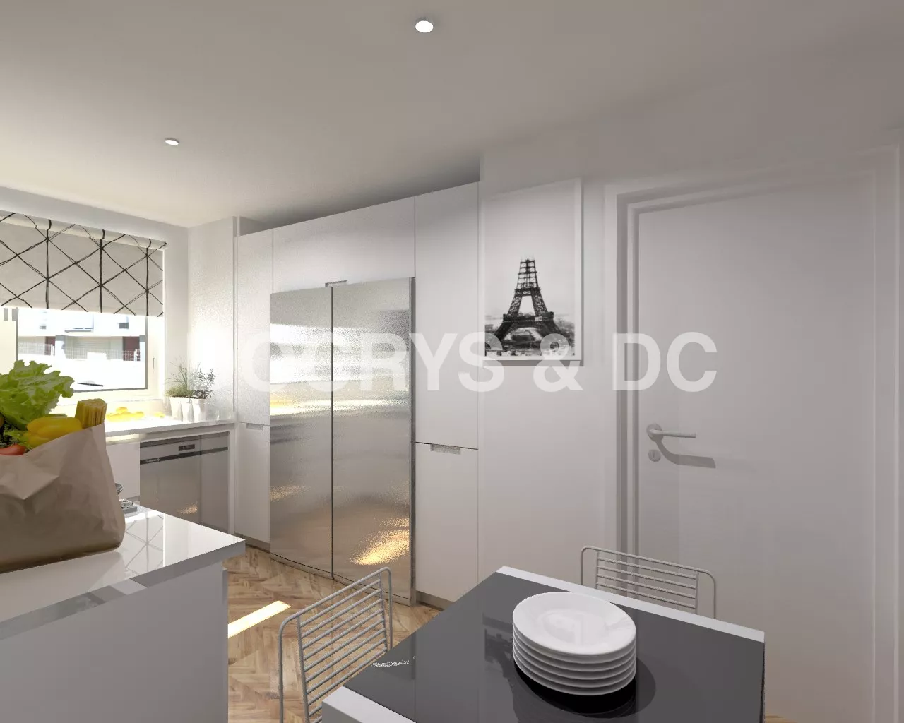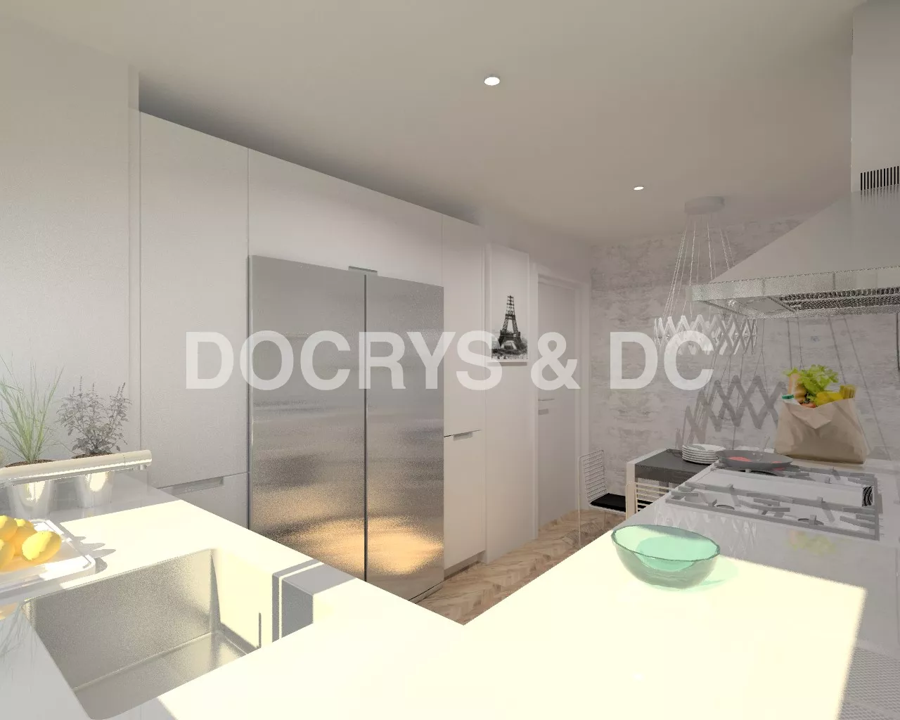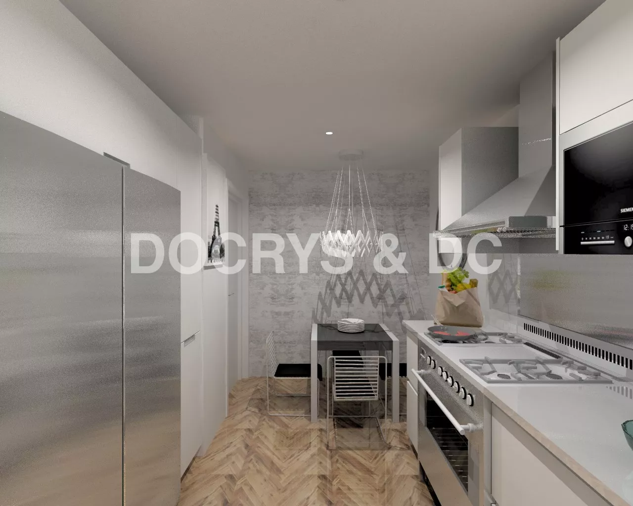 Aravaca | Cocina Santos | Modelo Line Laminado Seda Blanco | Encimera Compac Blanco