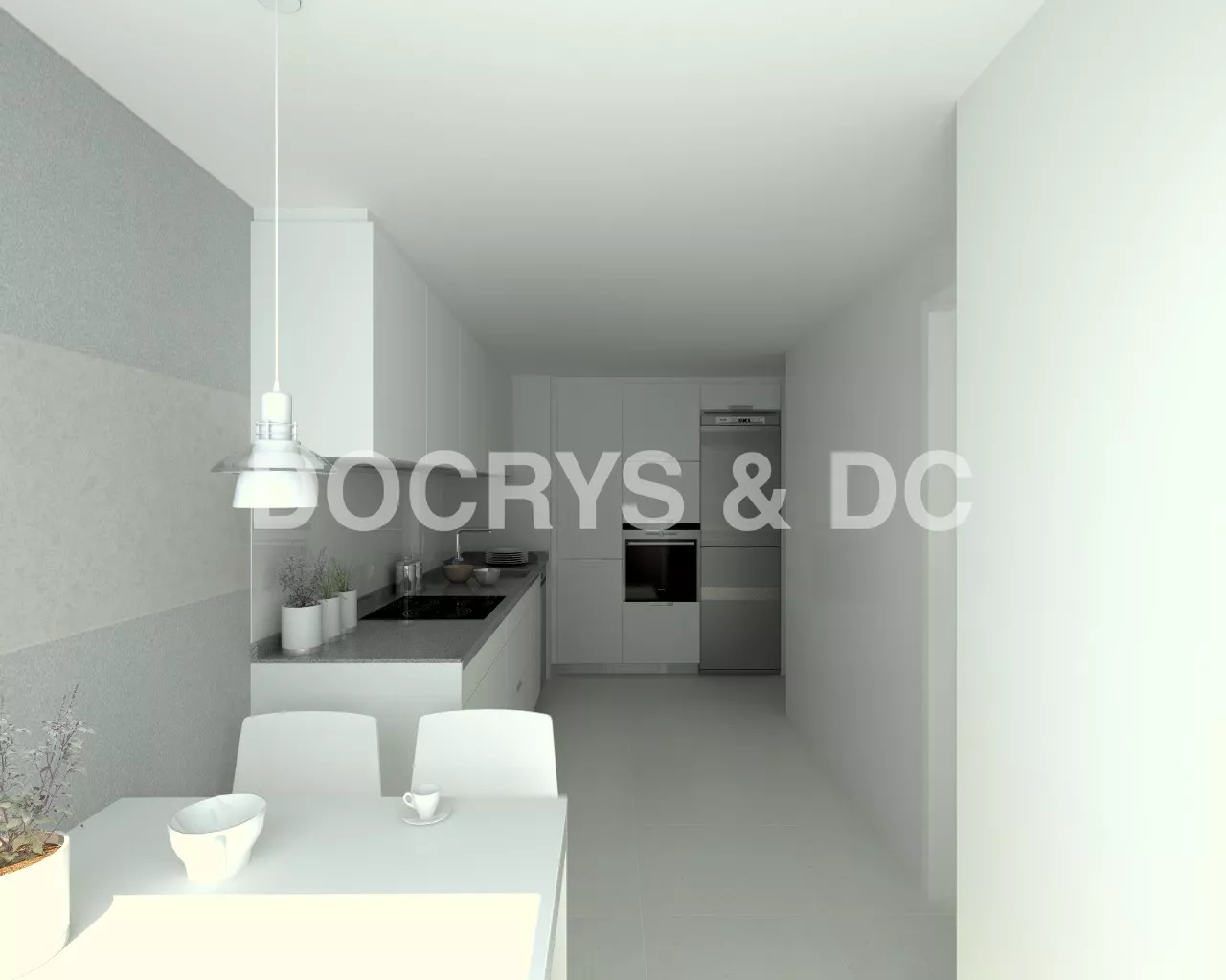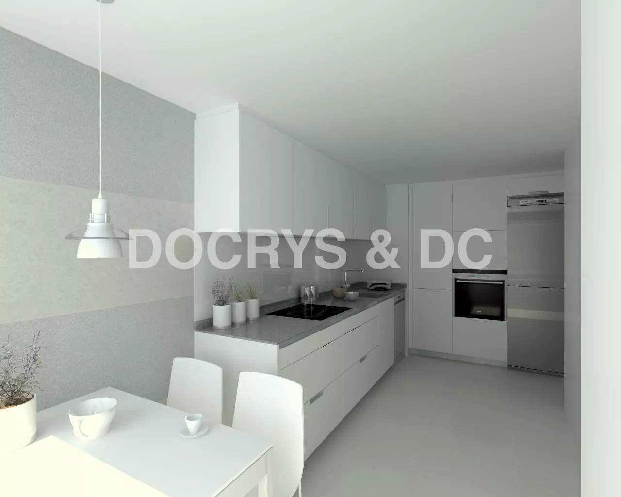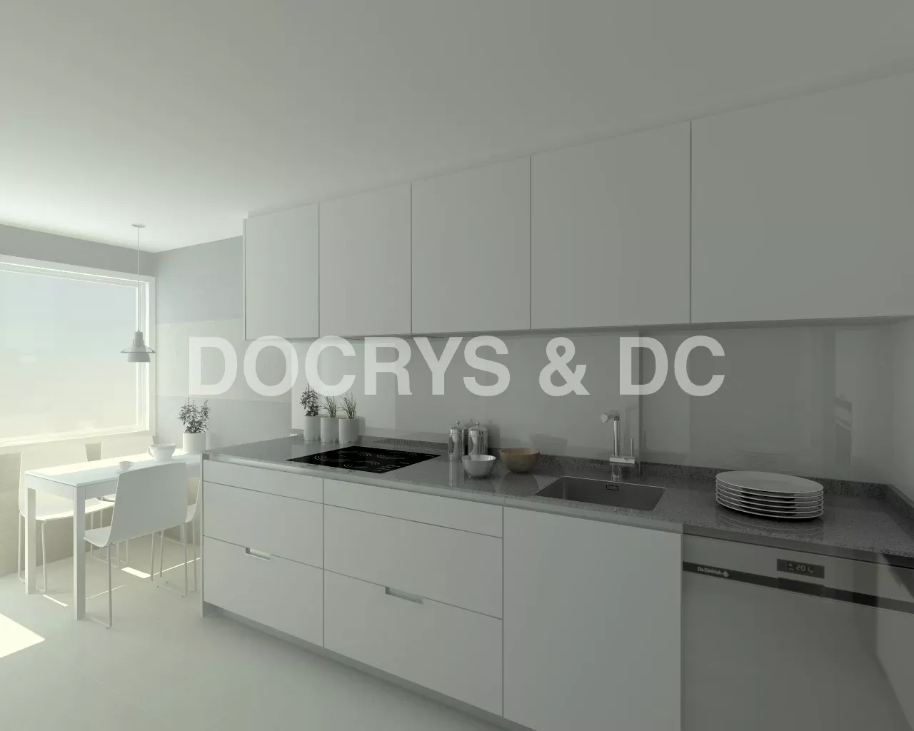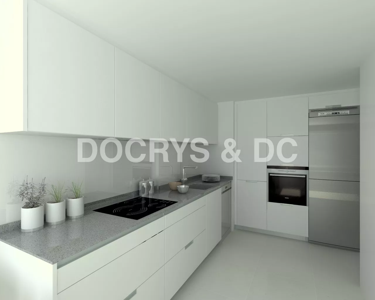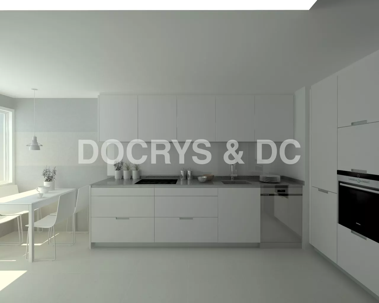 Aravaca | Cocina Santos | Modelo Minos Estratificado Blanco Perla | Encimera Compac Gris Plomo