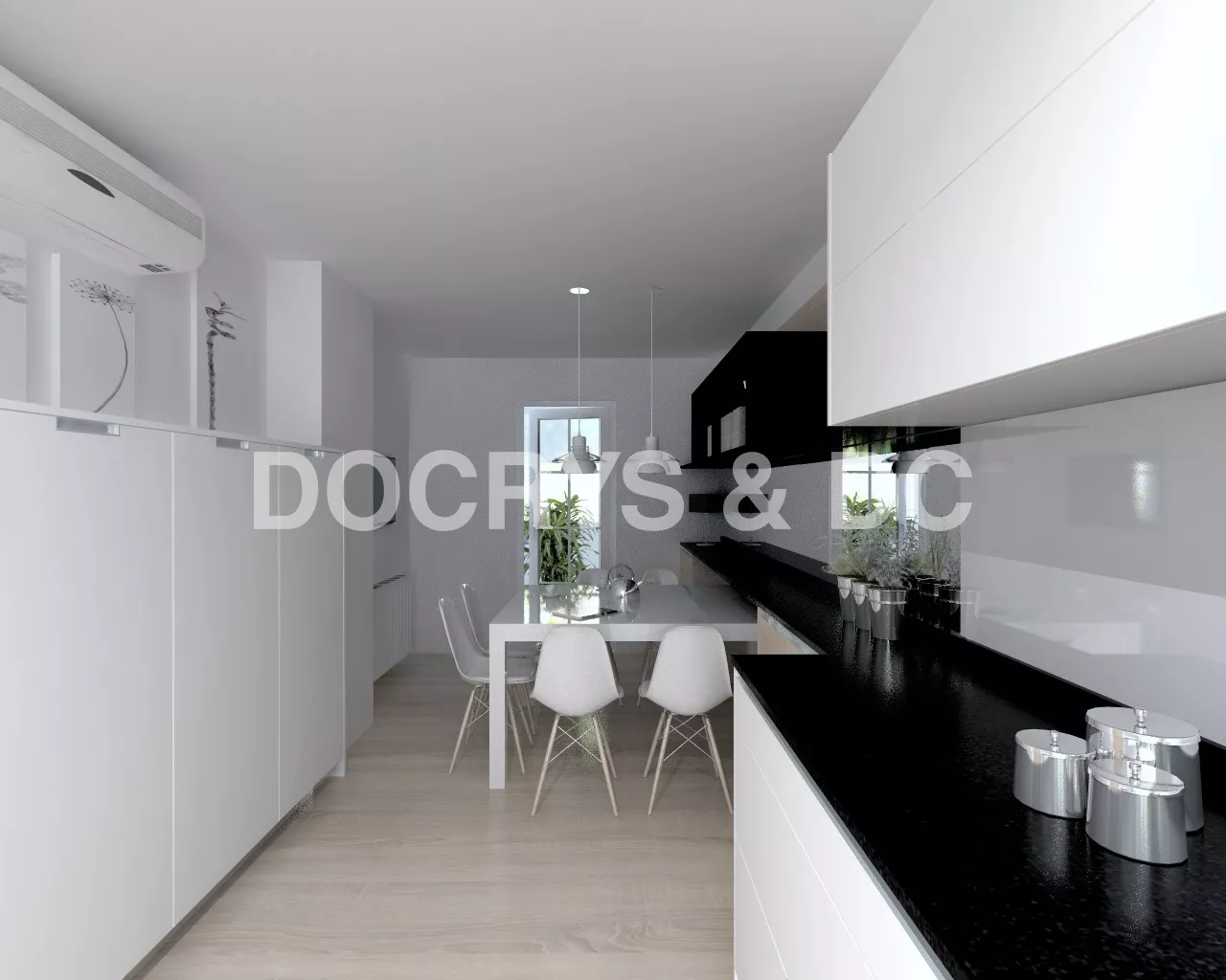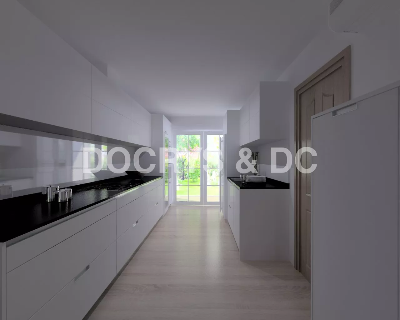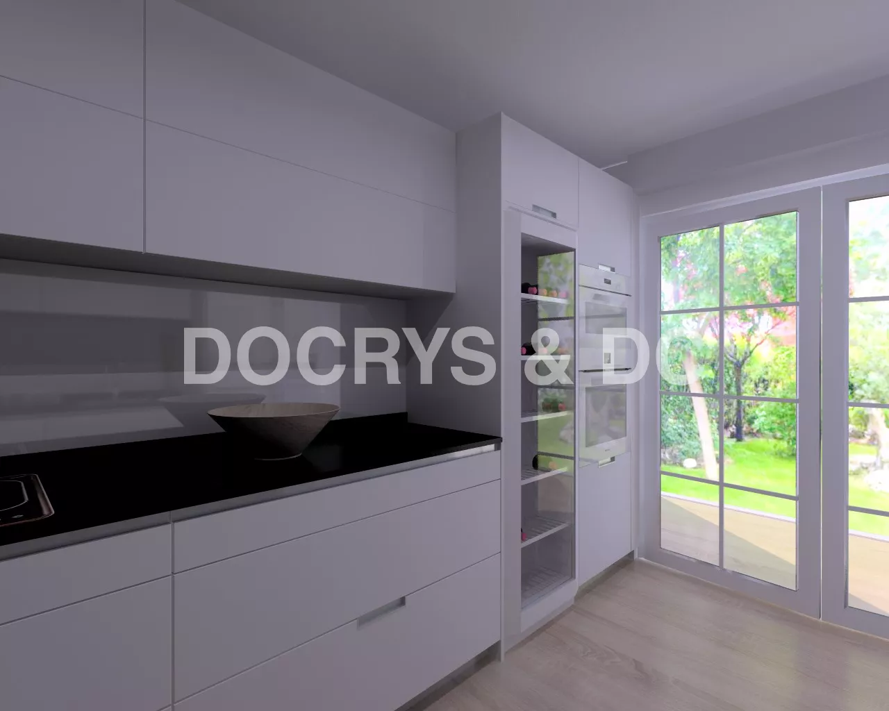 Aravaca | Cocina Santos | Modelo Minos Line Laminado Seda Blanco | Encimera Granito Zimbawe