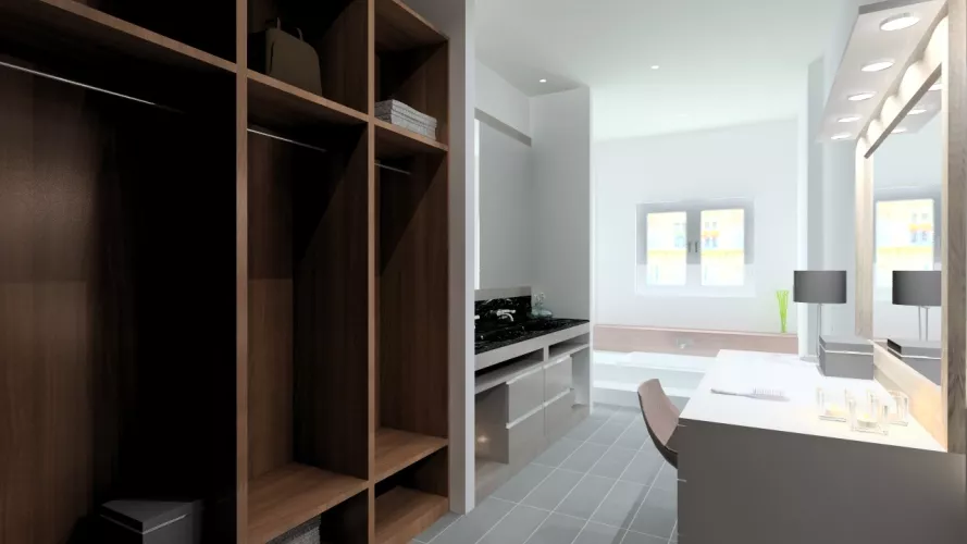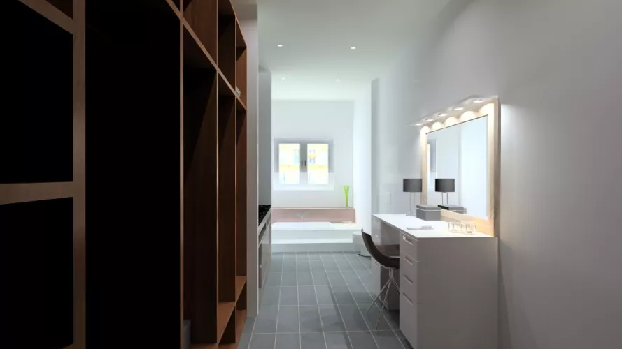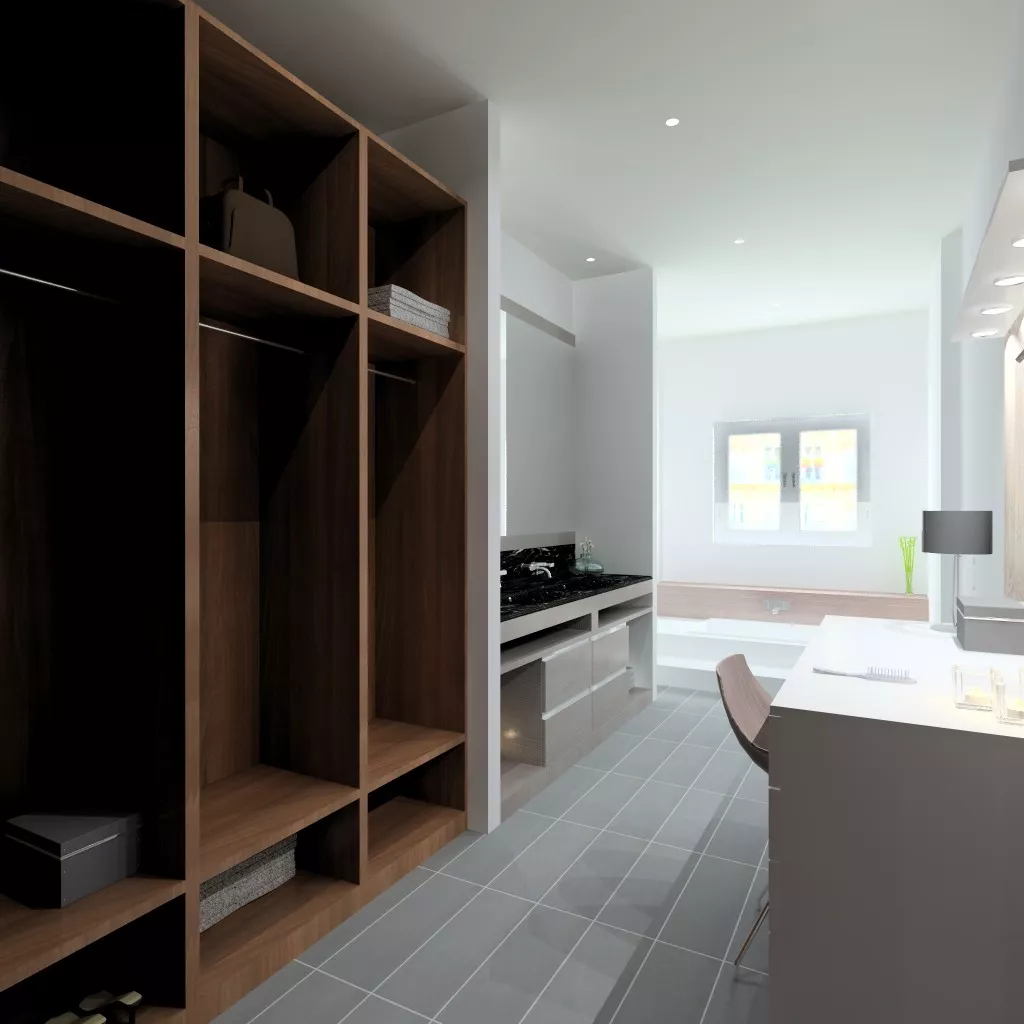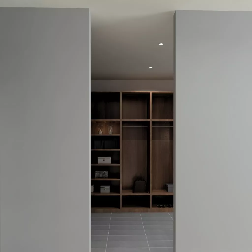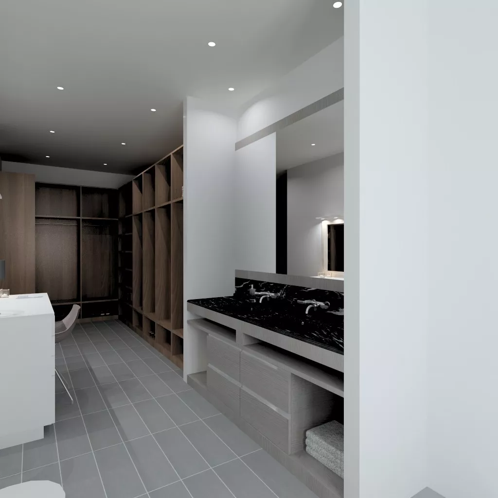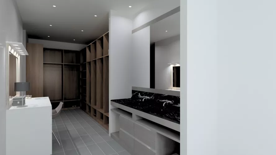 En el diseño de este vestidor moderno con lavabo integrado, intentamos crear un espacio que plasmará toda la personalidad de los usuarios.
