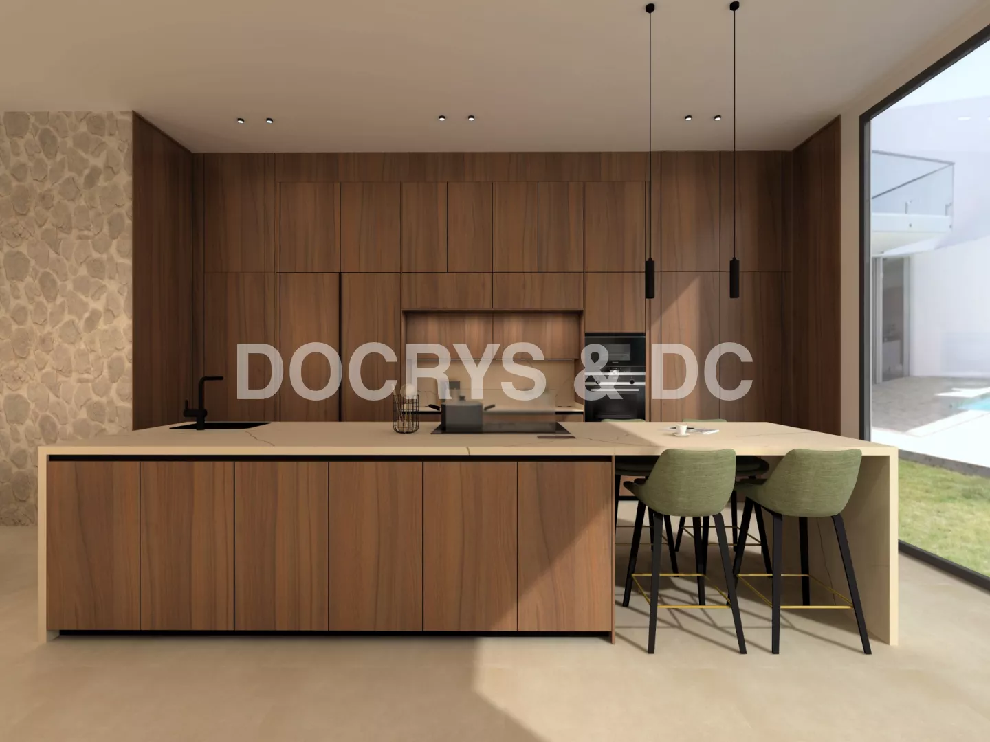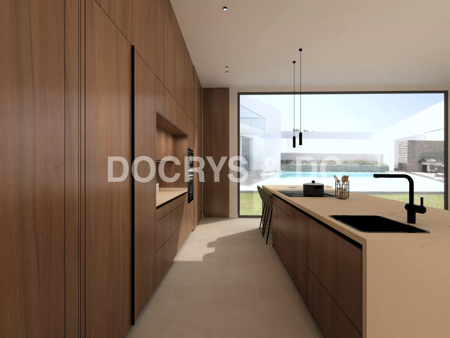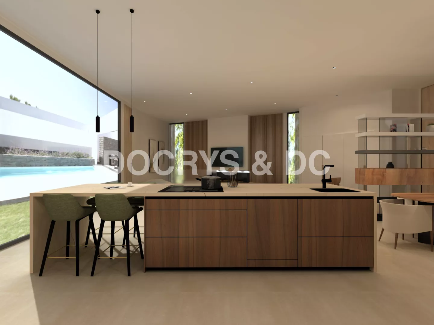 Uno de los aspectos más destacados del proyecto es su relación con la arquitectura de la vivienda. La cocina se abre al salón, al comedor y a la zona exterior a través de grandes ventanales que multiplican la luz natural y refuerzan la sensación de continuidad. La iluminación, discreta y bien integrada, acompaña esta atmósfera de calma y equilibrio, dando como resultado una cocina elegante, cálida y perfectamente conectada con el resto de la casa.