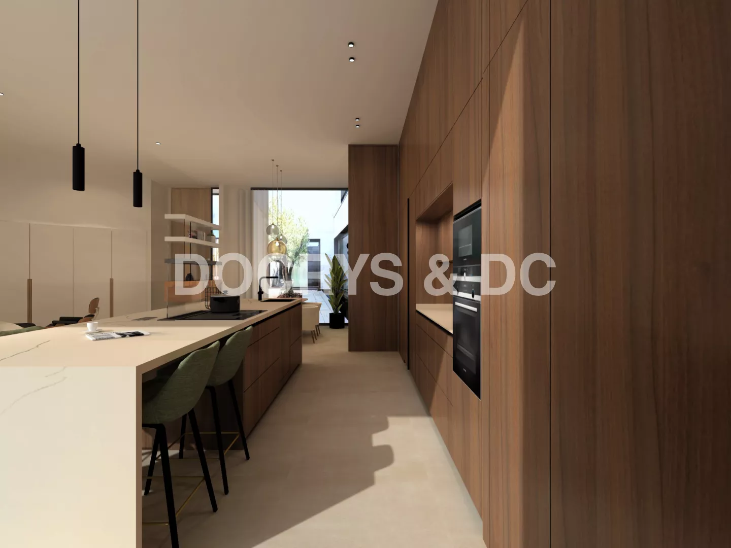 El diseño apuesta por una paleta sobria y elegante, en la que la madera oscura aporta profundidad, calidez y un carácter muy envolvente. Frente a ella, la encimera en tono claro introduce contraste, luminosidad y ligereza visual, equilibrando el conjunto. Los detalles en negro, presentes en la grifería, la iluminación suspendida y algunos elementos funcionales, refuerzan la estética actual de la cocina y añaden definición al espacio.
